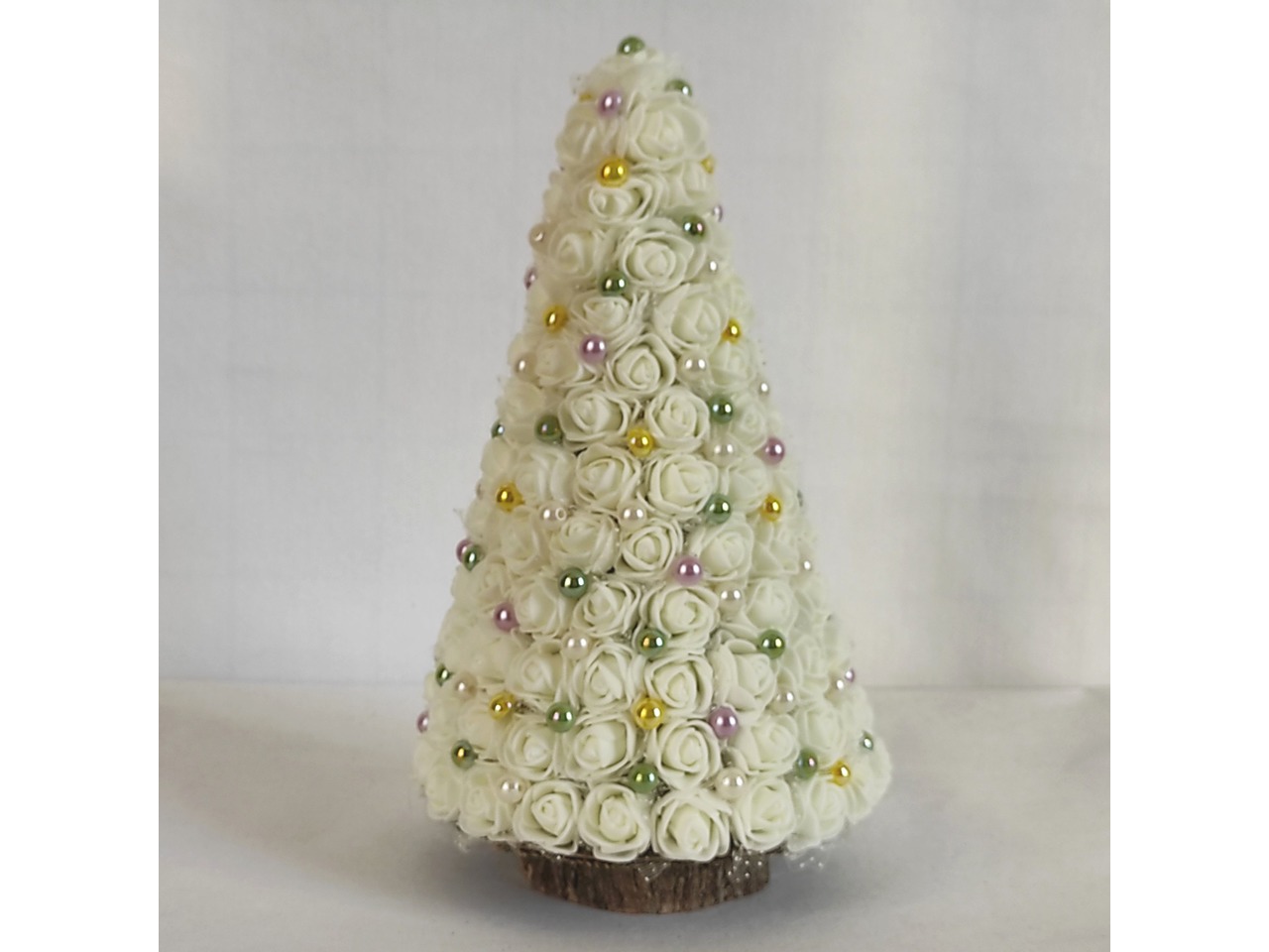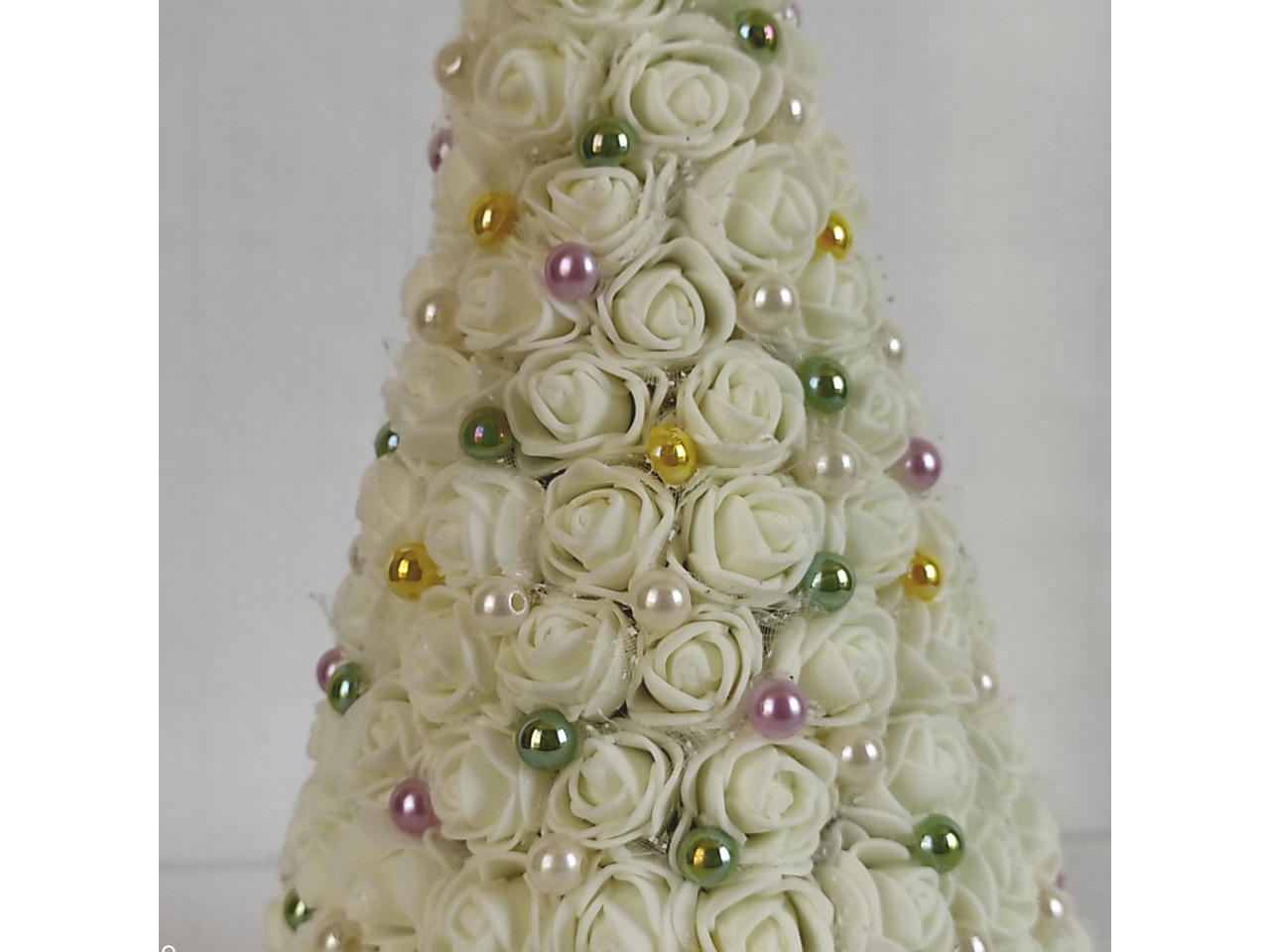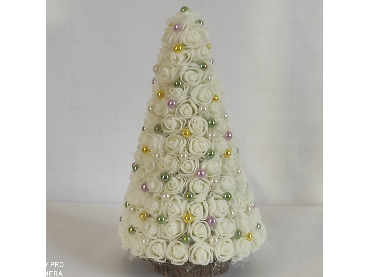 Ялинка оздоблена білими фоаміновими квіточками та різнокольоровими намистинами.