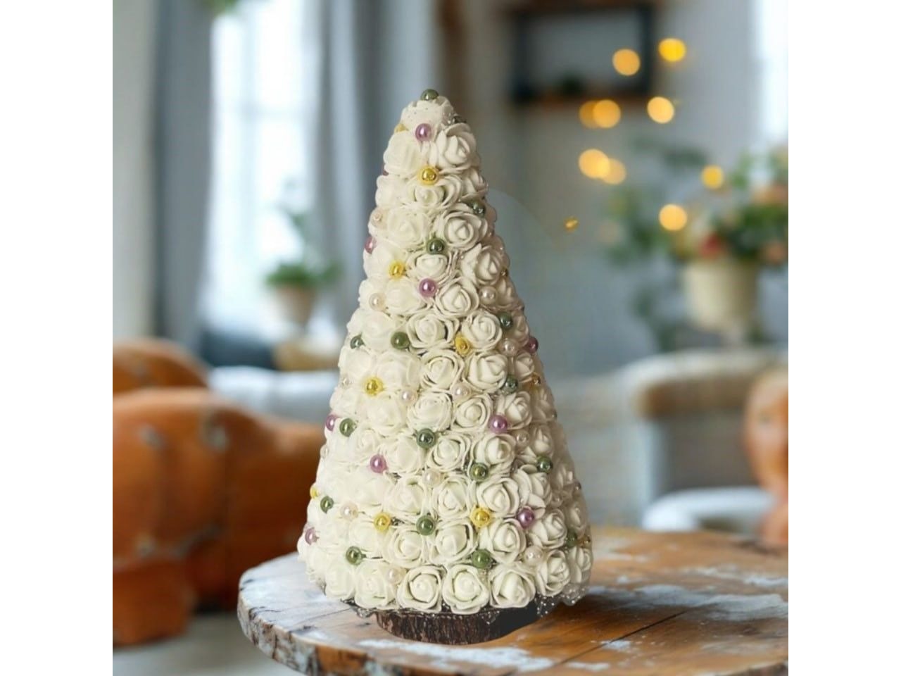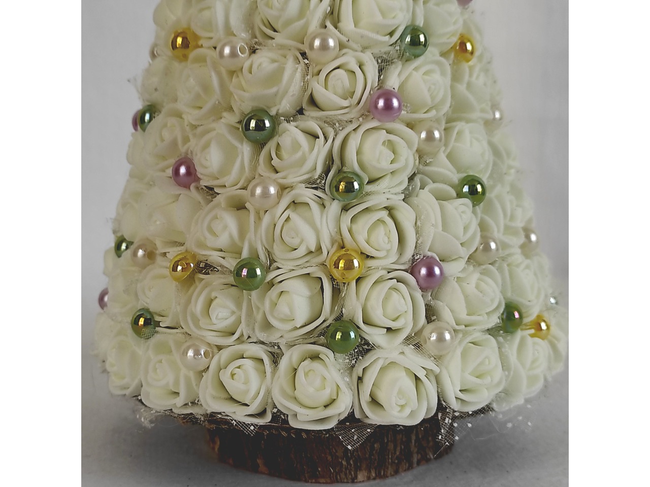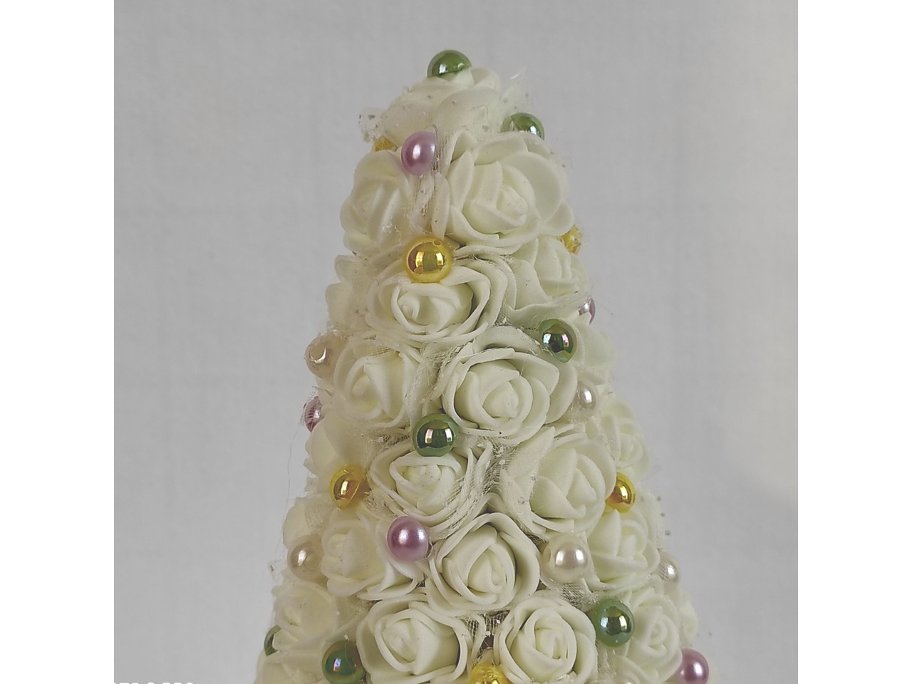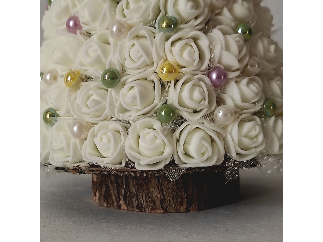 Ялинка оздоблена білими фоаміновими квіточками та різнокольоровими намистинами.