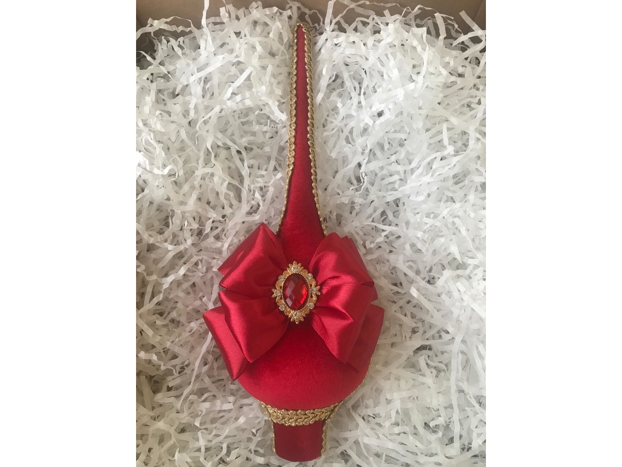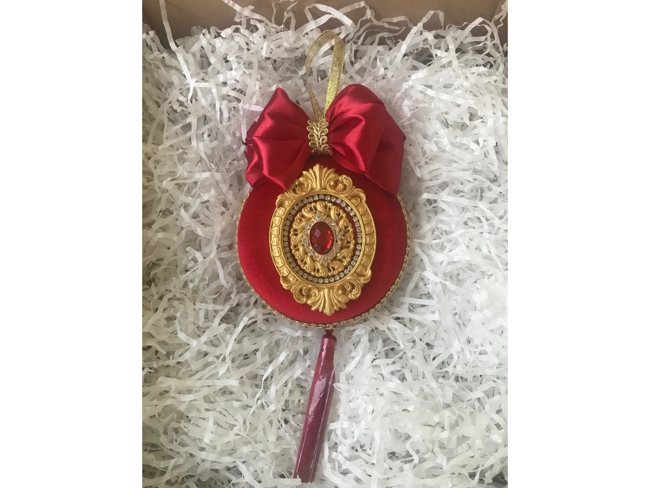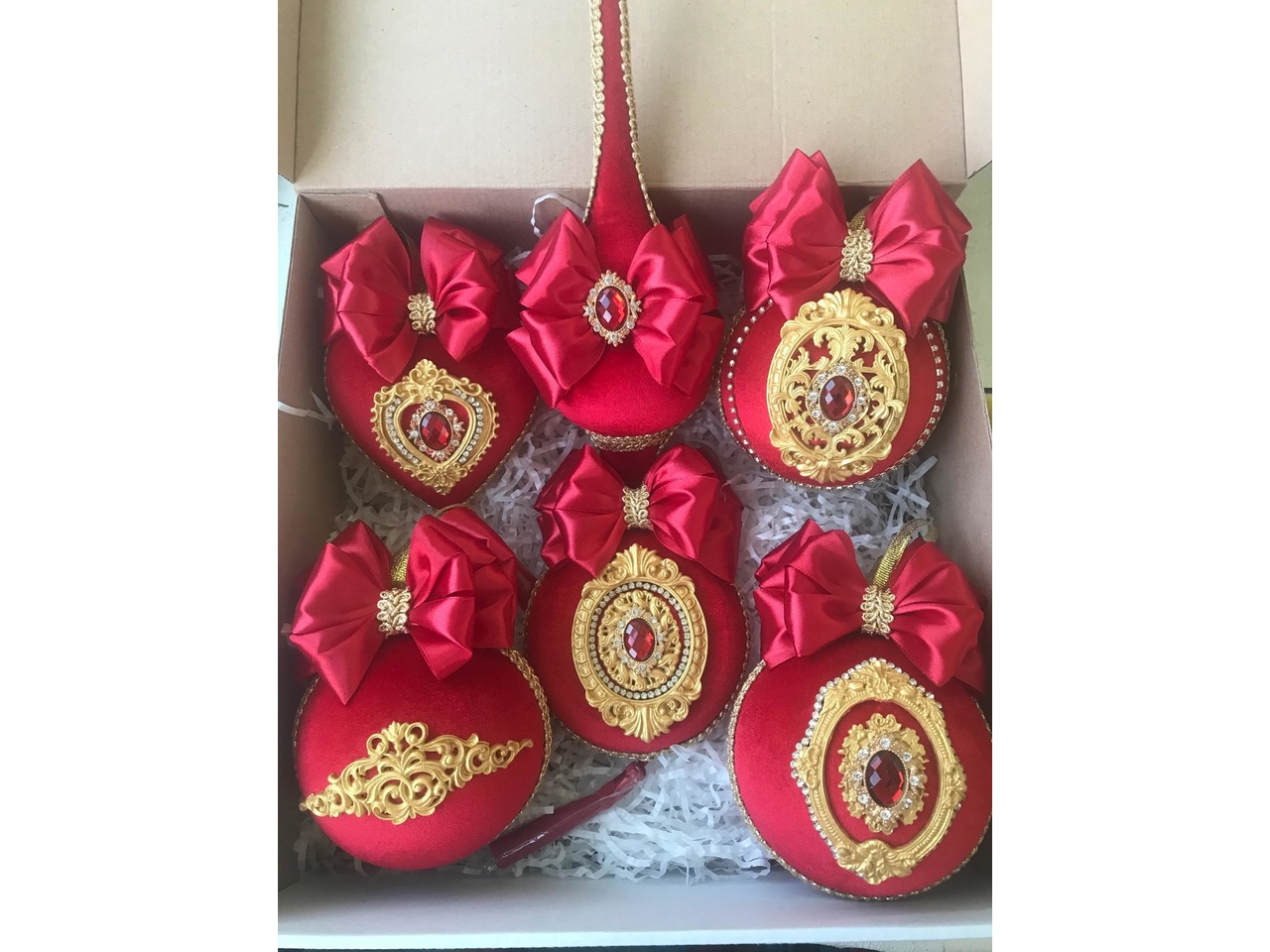 Шикарний набір ручної роботи в оксамиті. Величина іграшок 10 см. Оздоблений стразовим ланцюжком,брошкою і атласними бантами, куля пластикова обтягнута оксамитом. Кількість прикрас у наборі-6. Ціна за набір. В наявності.Для замовлення телефонуйте.