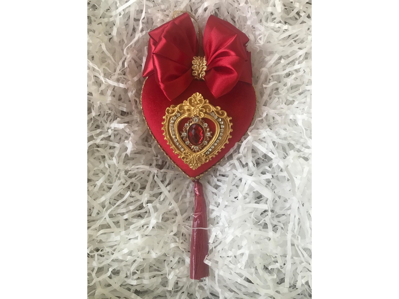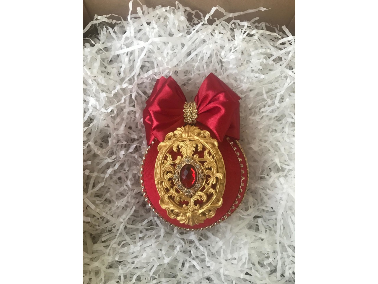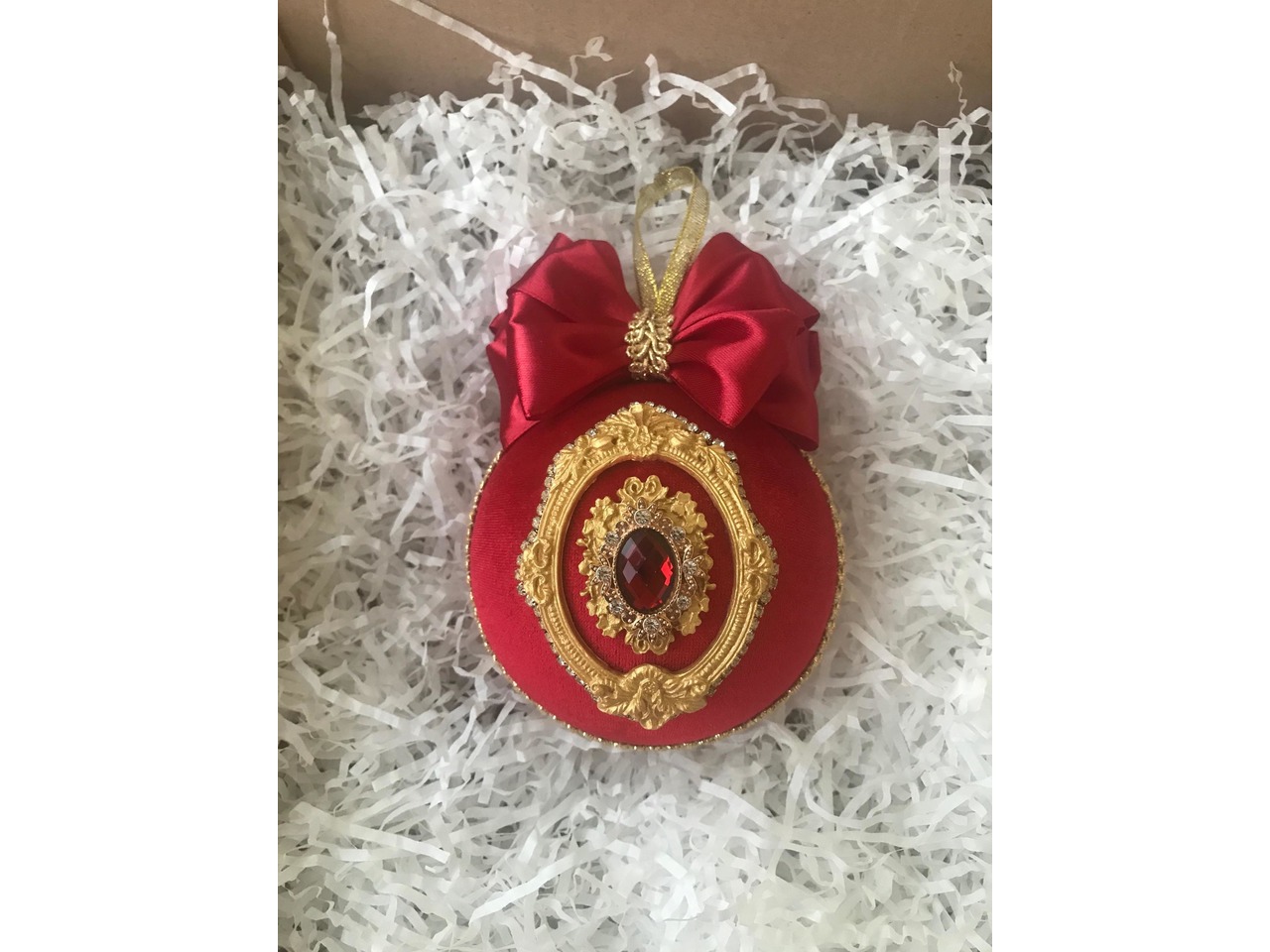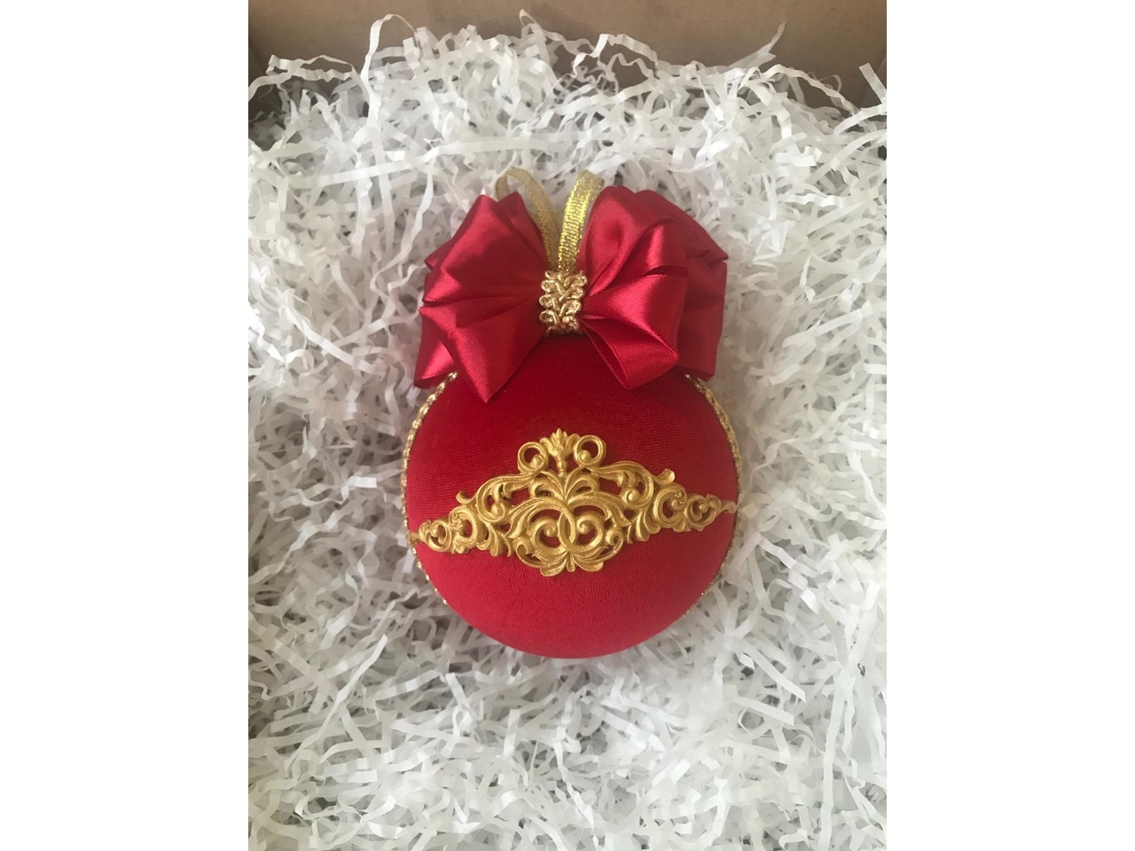 Шикарний набір ручної роботи в оксамиті. Величина іграшок 10 см. Оздоблений стразовим ланцюжком,брошкою і атласними бантами, куля пластикова обтягнута оксамитом. Кількість прикрас у наборі-6. Ціна за набір. В наявності.Для замовлення телефонуйте.