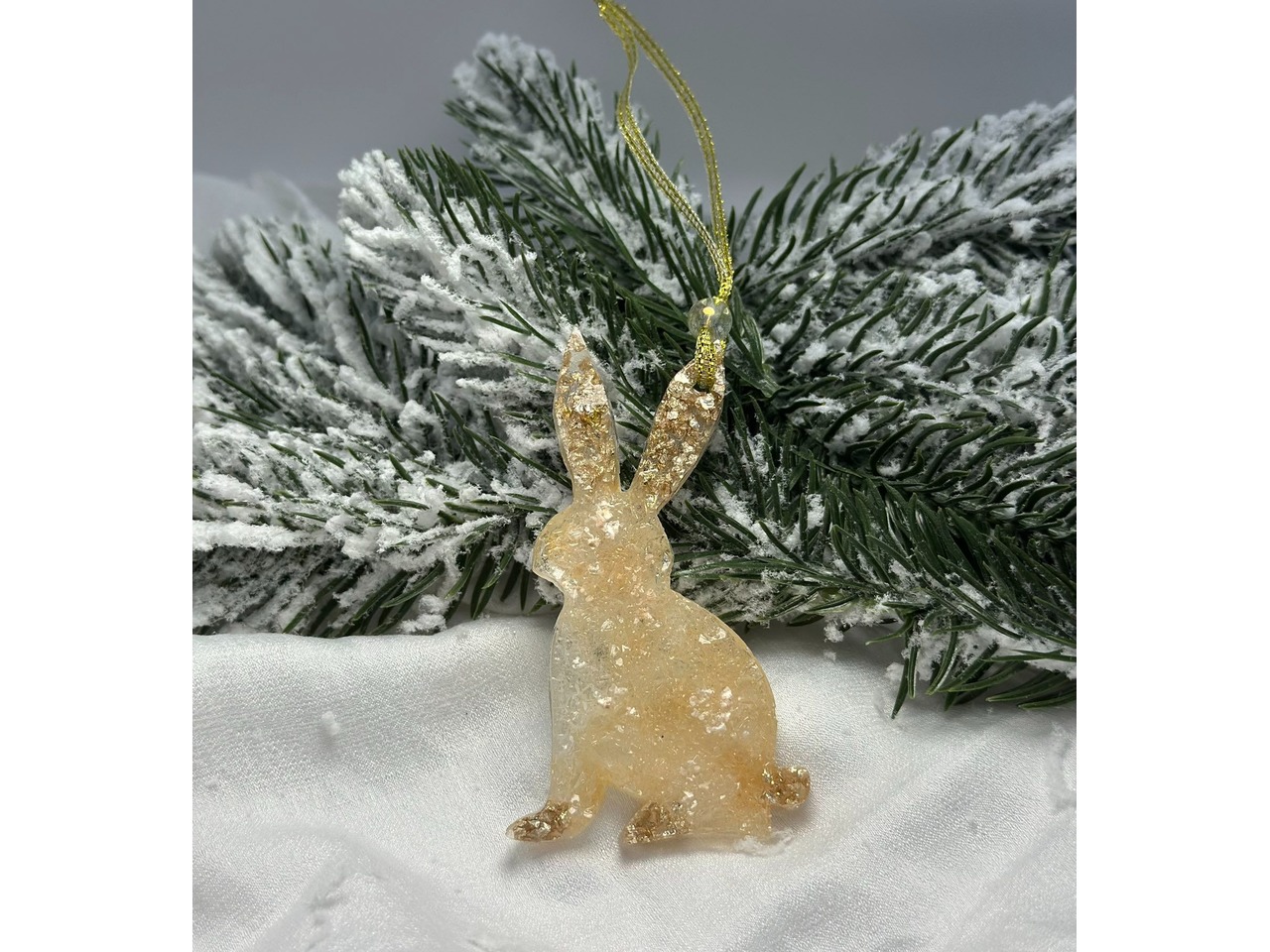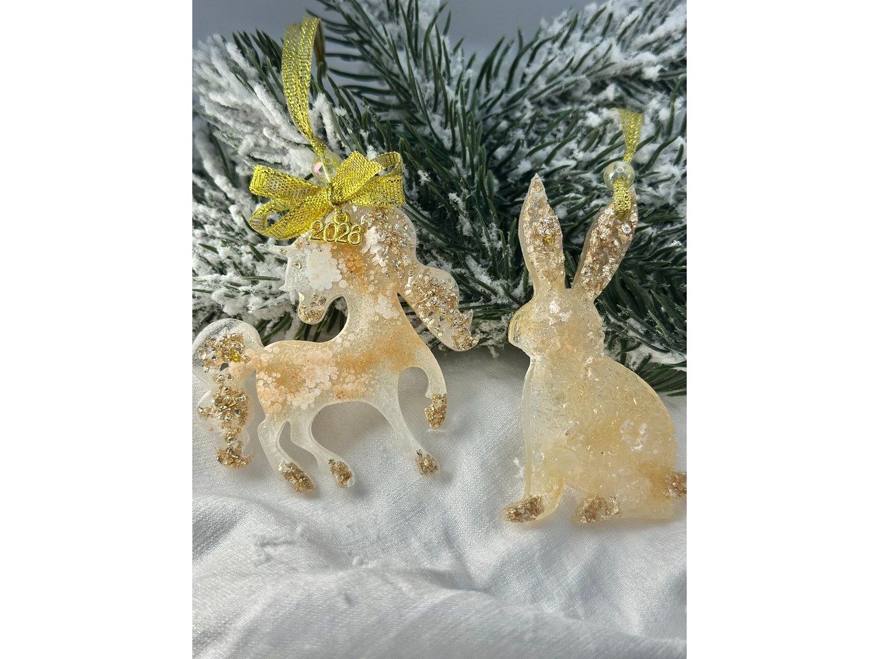 Ялинкові іграшки.У роботі використані матеріали: епоксидна смола, перламутровий пігмент, камінці, намистина, стрічка парчева, декоративна підвіска. Розмір: зайчик висота 8 см, ширина 4.5 см, кінь висота 7 см, ширина 8 см.