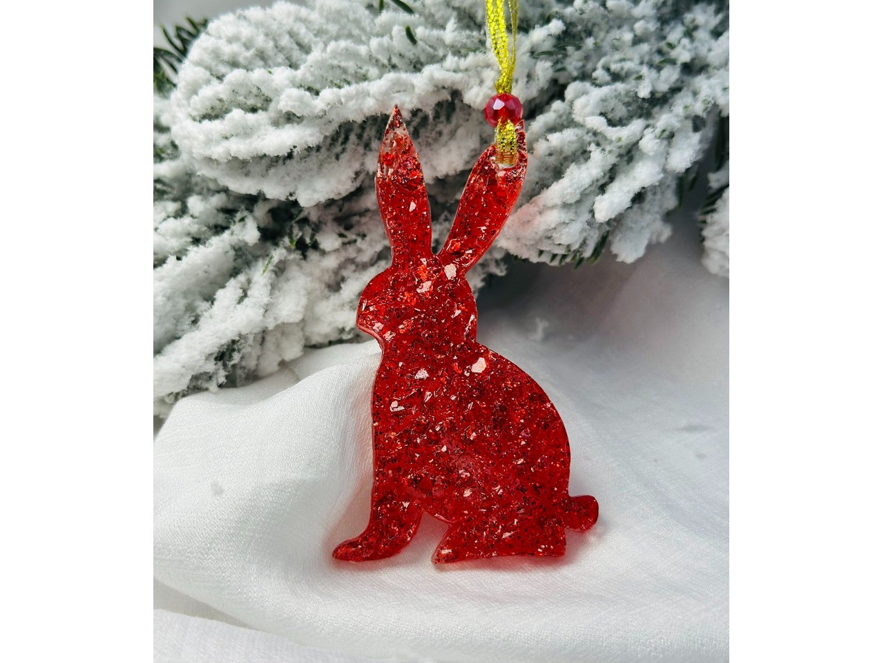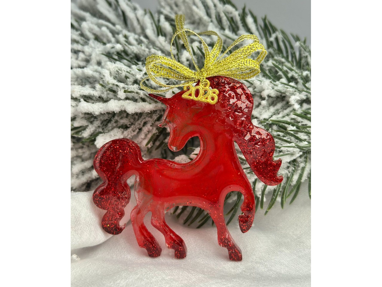 У роботі використані матеріали: епоксидна смола, сяючі блискітки, стрічка парчева, декоративна підвіска, намистини. Розмір: зайчик висота 8 см, ширина 4.5 см, рукавичка висота 6.5 см, ширина 4.5 см, кінь 1 висота 7 см, ширина 8 см, кінь 2 висота 9 см, ширина 12 см.