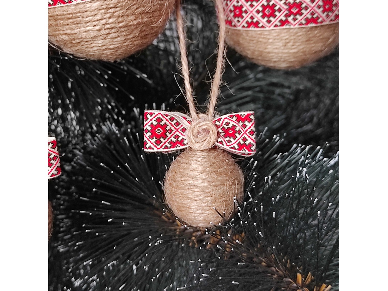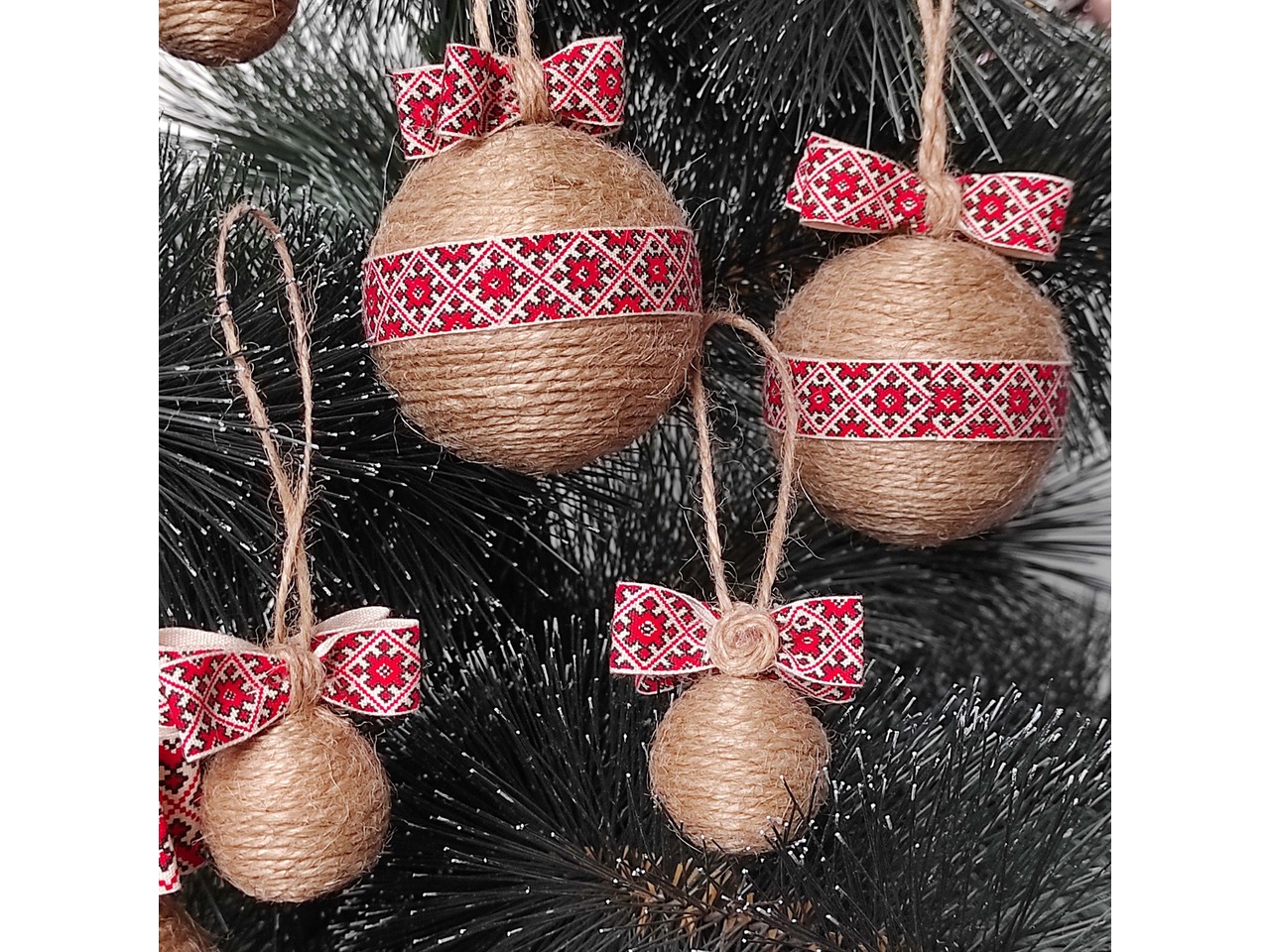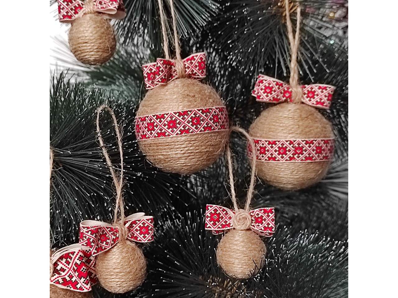 Новорічні іграшки в українському стилі — набір оригінальних ялинкових кульок (6 шт). Це стильний та незвичайний декор, створений вручну з урахуванням українських традицій.Основа кожної кульки — пінопластовий шар, який оздоблений джутом та декоративною тасьмою в українському стилі. Такий набір чудово підійде як для прикрашання власної ялинки, так і для подарунку.