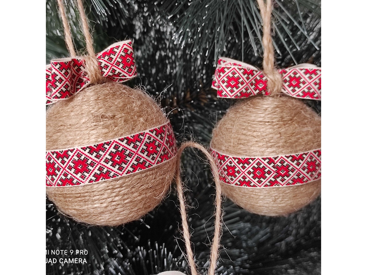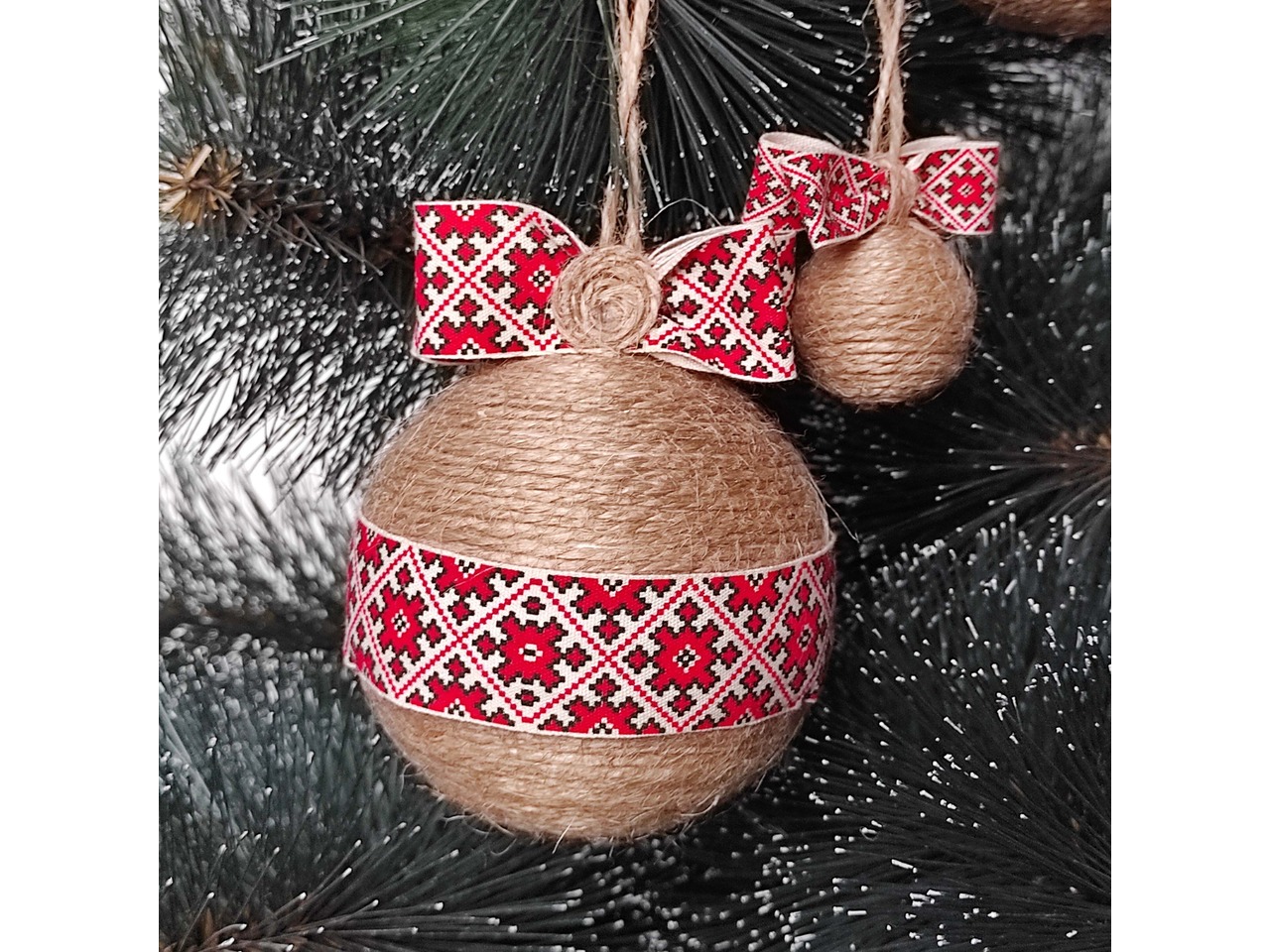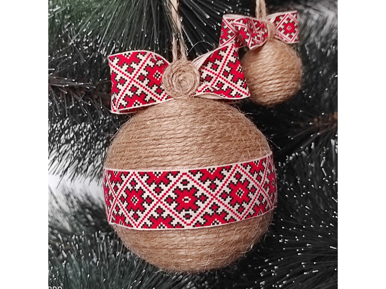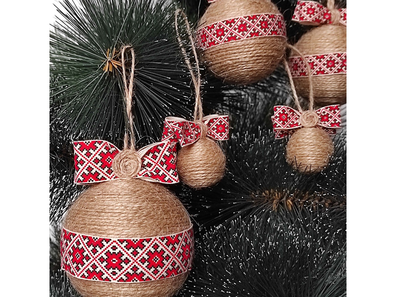 Новорічні іграшки в українському стилі — набір оригінальних ялинкових кульок (6 шт). Це стильний та незвичайний декор, створений вручну з урахуванням українських традицій.Основа кожної кульки — пінопластовий шар, який оздоблений джутом та декоративною тасьмою в українському стилі. Такий набір чудово підійде як для прикрашання власної ялинки, так і для подарунку.
