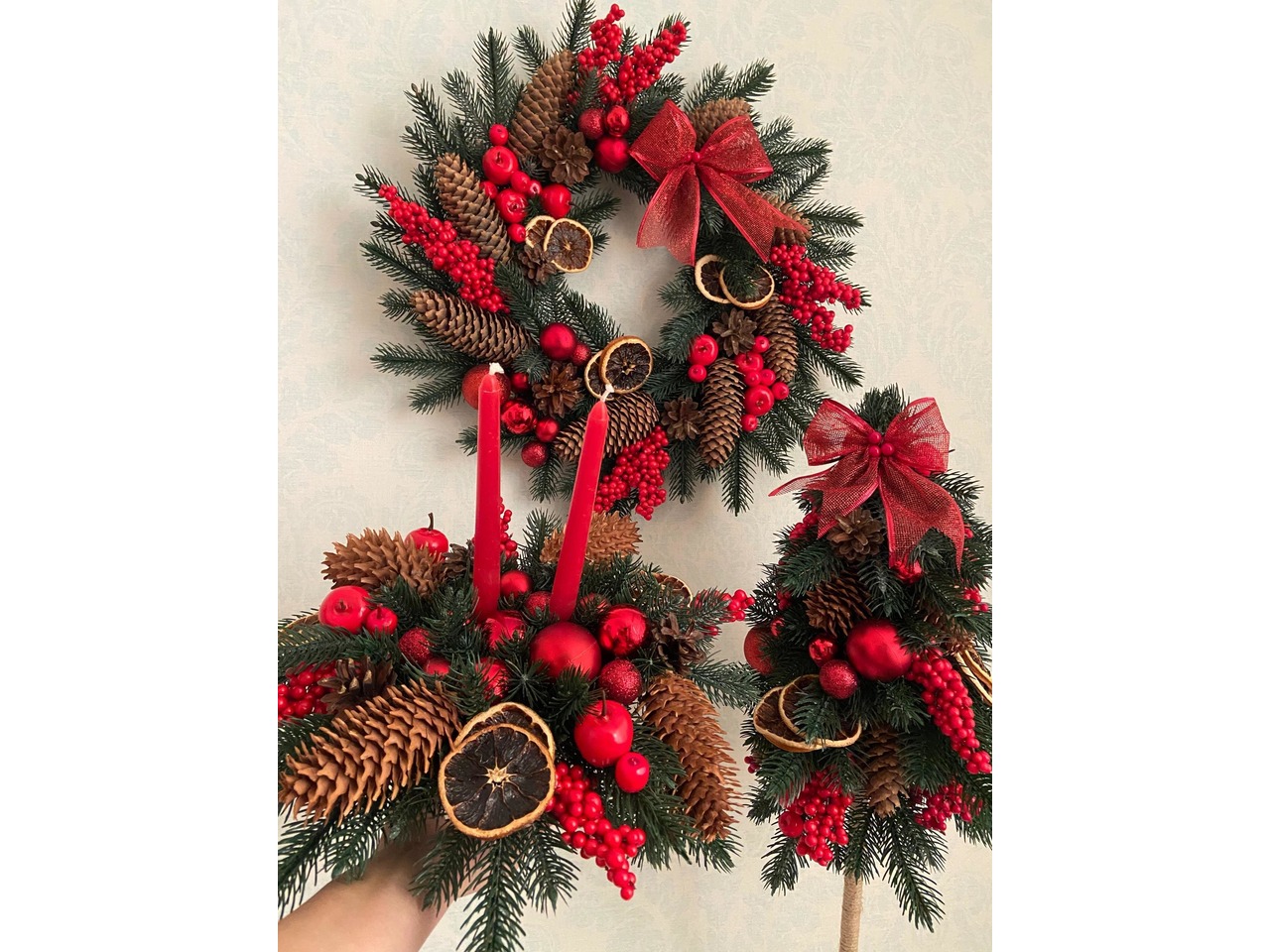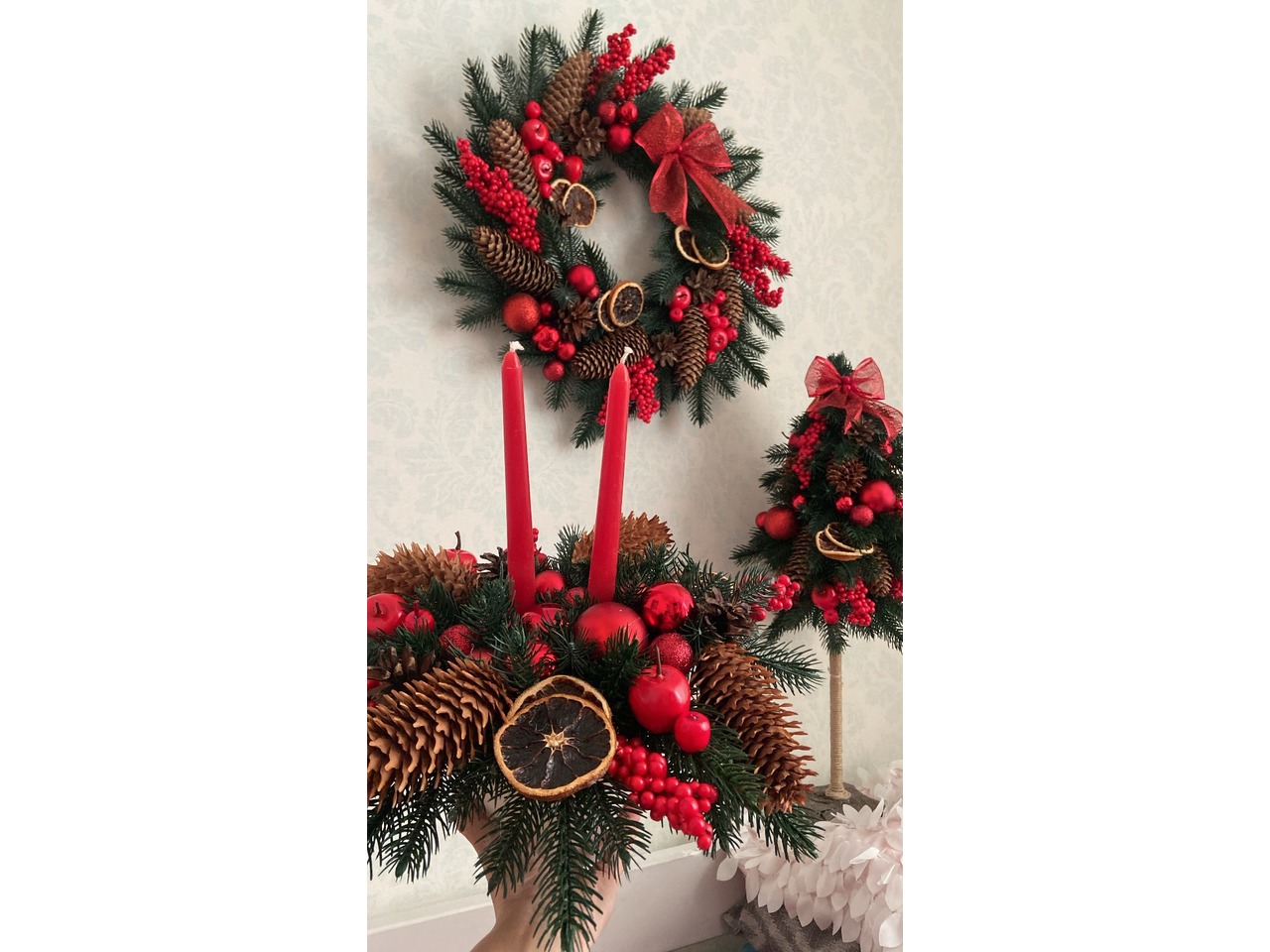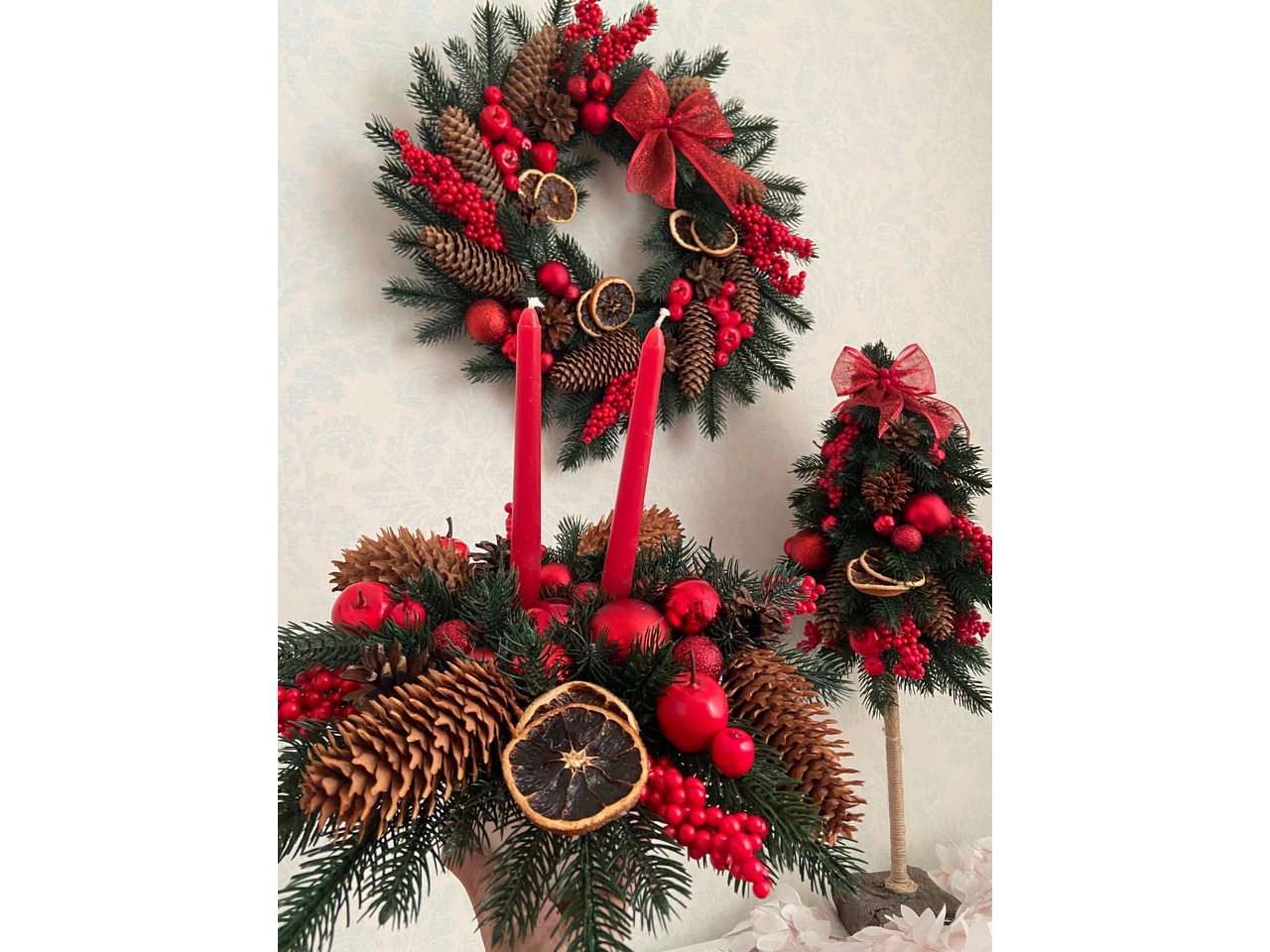 Новогодний рождественский набор венок, елка на высокой ножке и подсвечник
