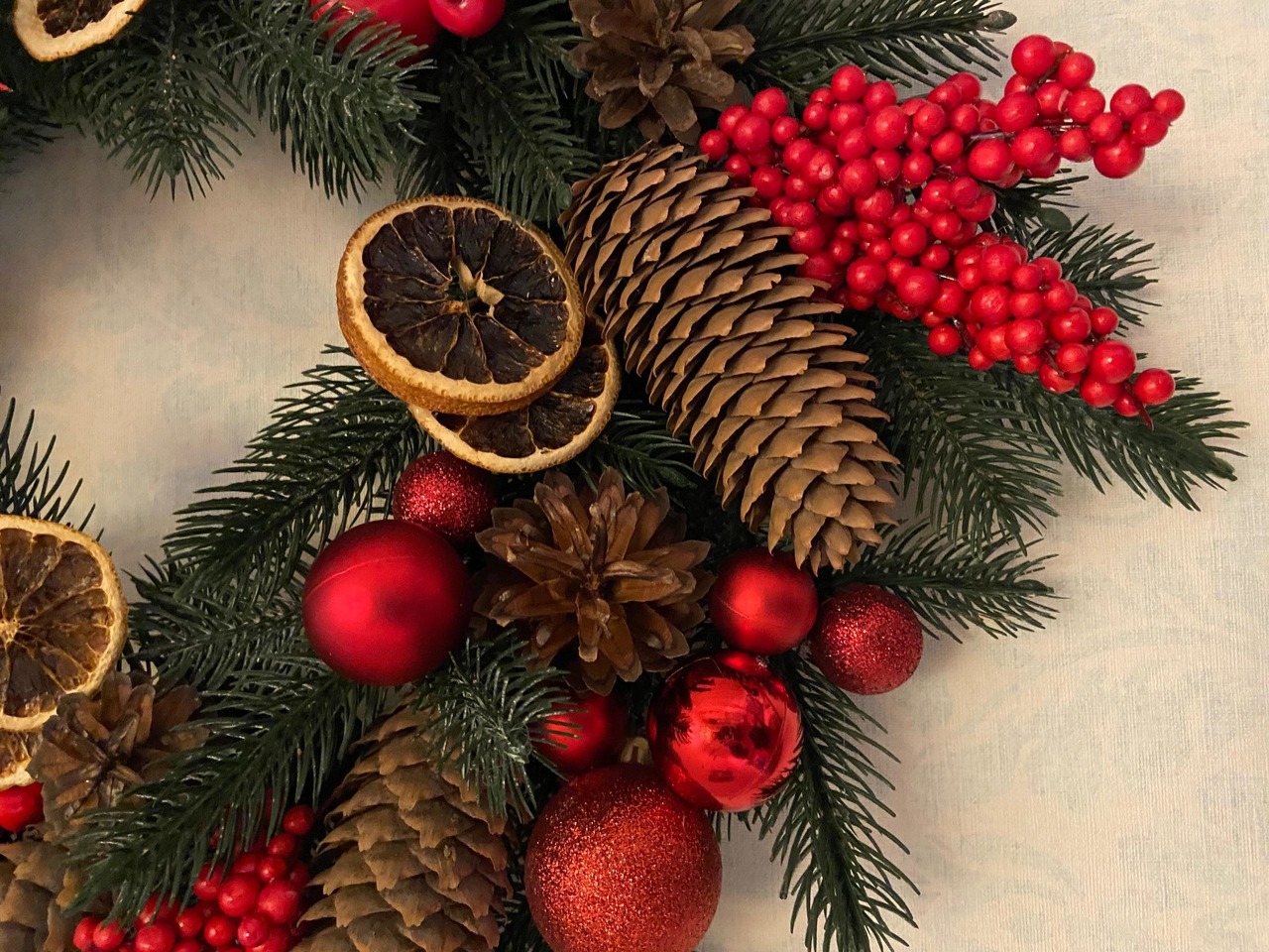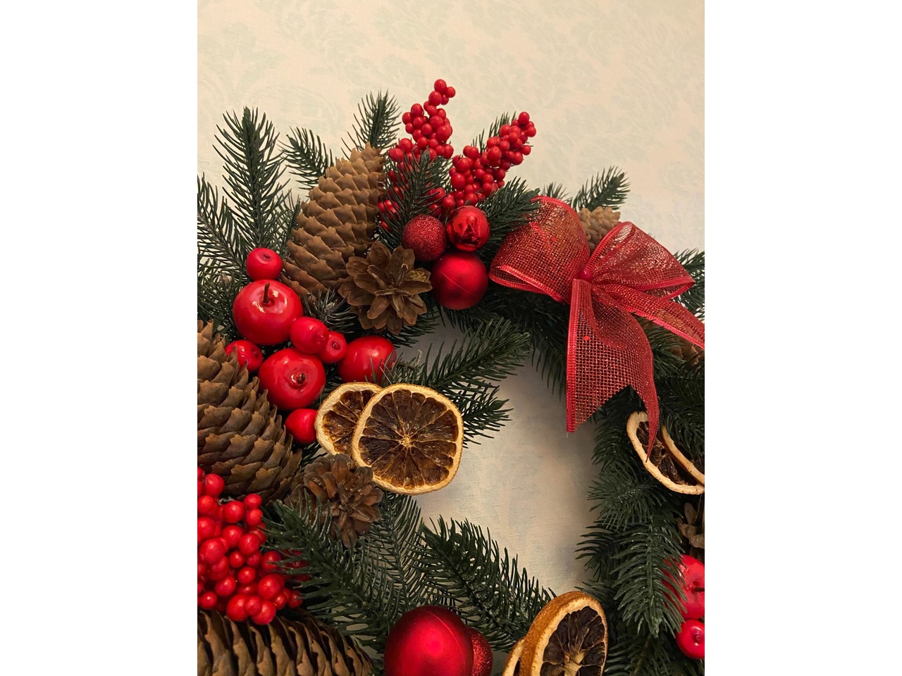 Декор: бант з новорічної стрічки-сітки з люрексом, ягідки, кульки, яблучка, шишки ялини та сосни, сушений апельсин.