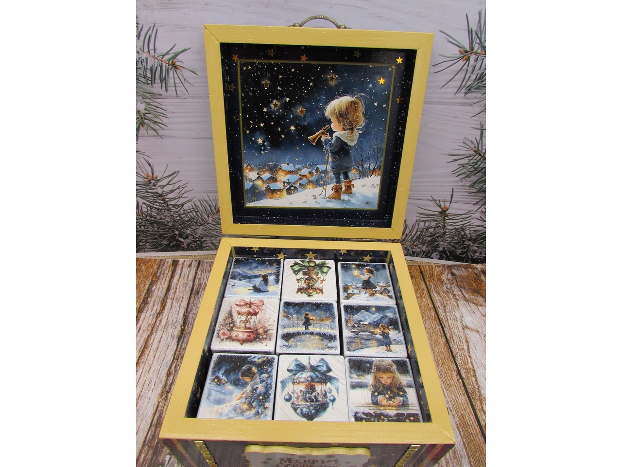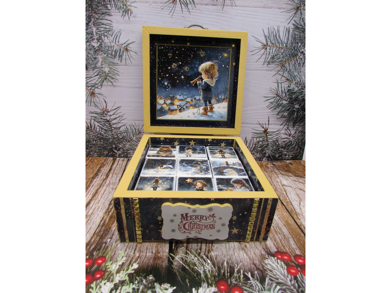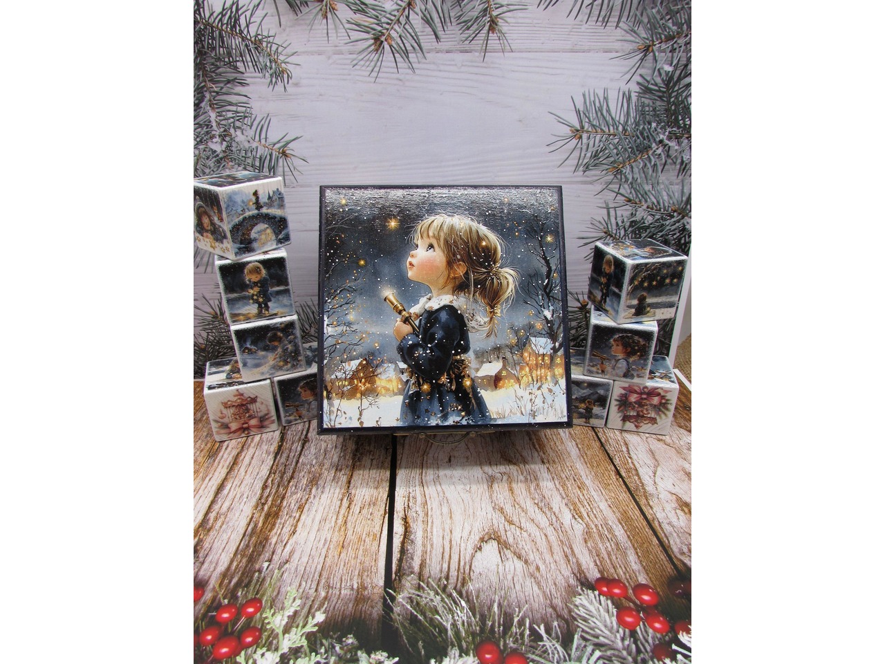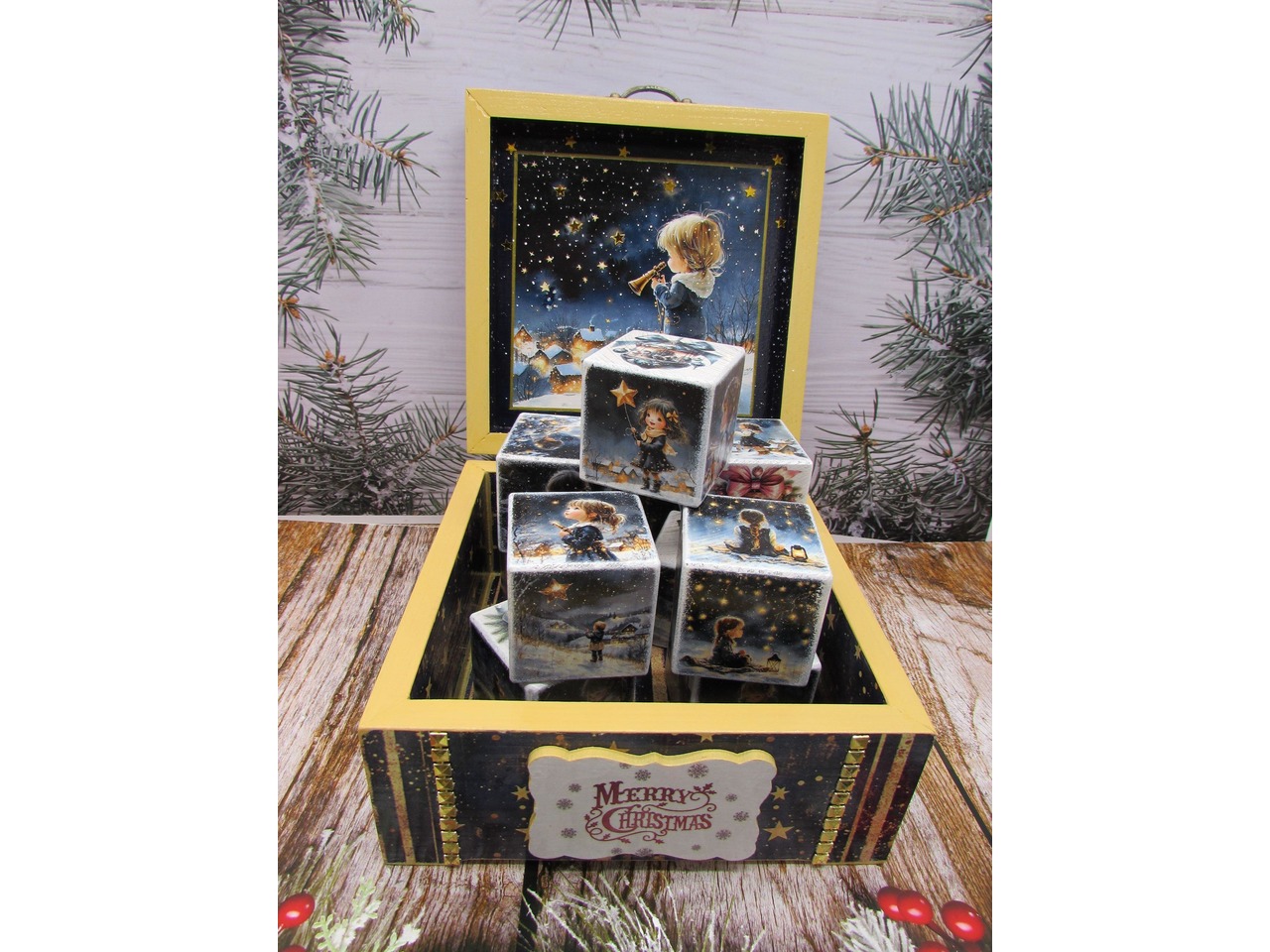Цей неймовірно ніжний набір кубиків у дерев’яній коробці створює справжню атмосферу різдвяного дива!На кожній стороні кубиків — зворушливі зимові ілюстрації з дитинством, зоряним небом і сяйвом різдвяних вогників.