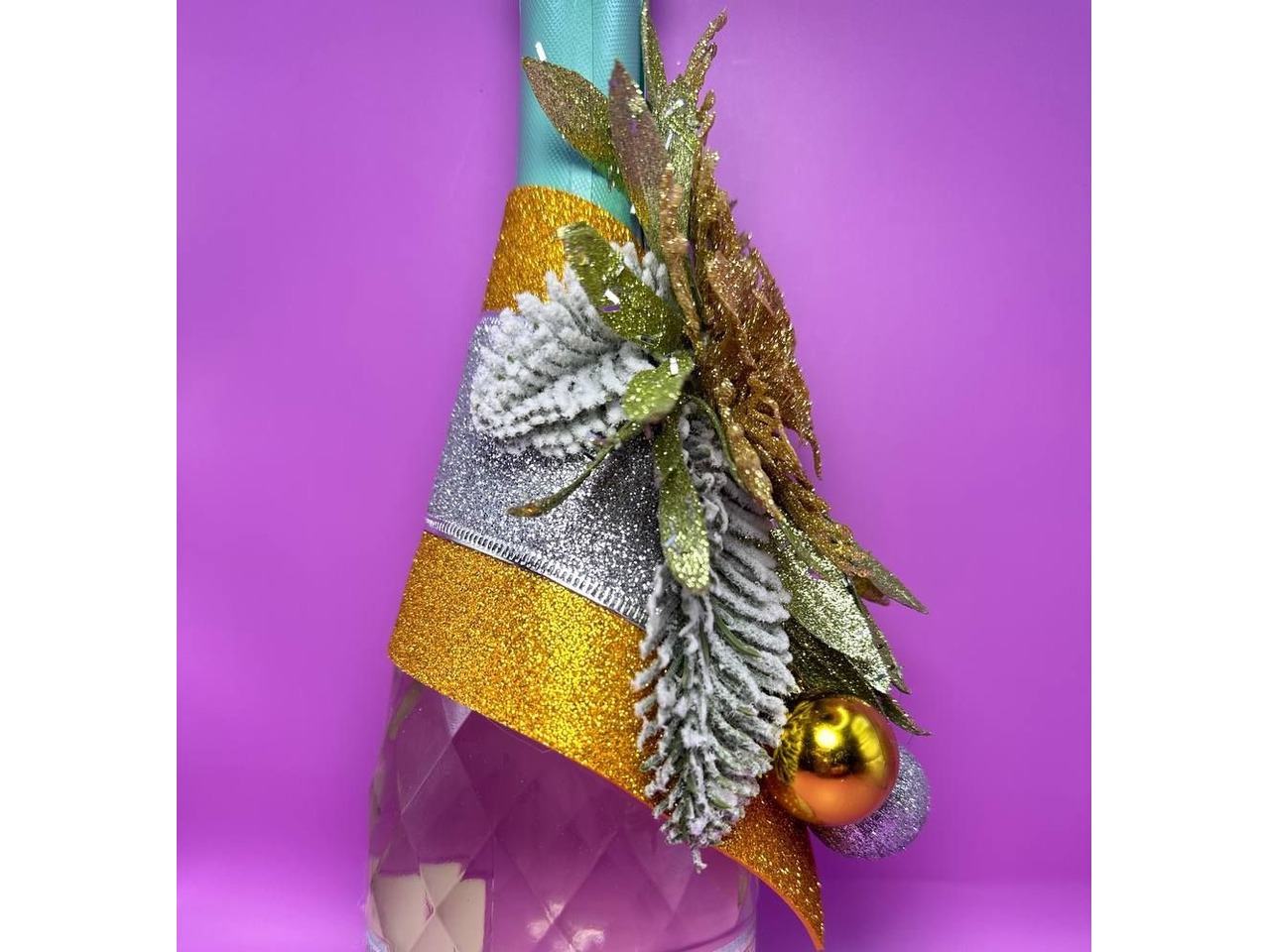 У роботі використані матеріали: глітерний фоаміран, штучна гілочка нобілісу, квітка пуансетії, стрічка (органза), блискучі гілочки, ягідки (пінопласт, глітер), ялинкові іграшки. Розмір: ширина композиції 13 см, висота 20 см, ялинкові іграшки діаметр 3 см. Жодне новорічне свято не обходиться без шампанського! Прикрасьте його гарною композицією!