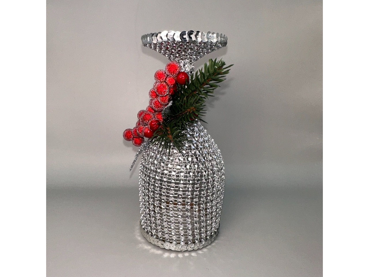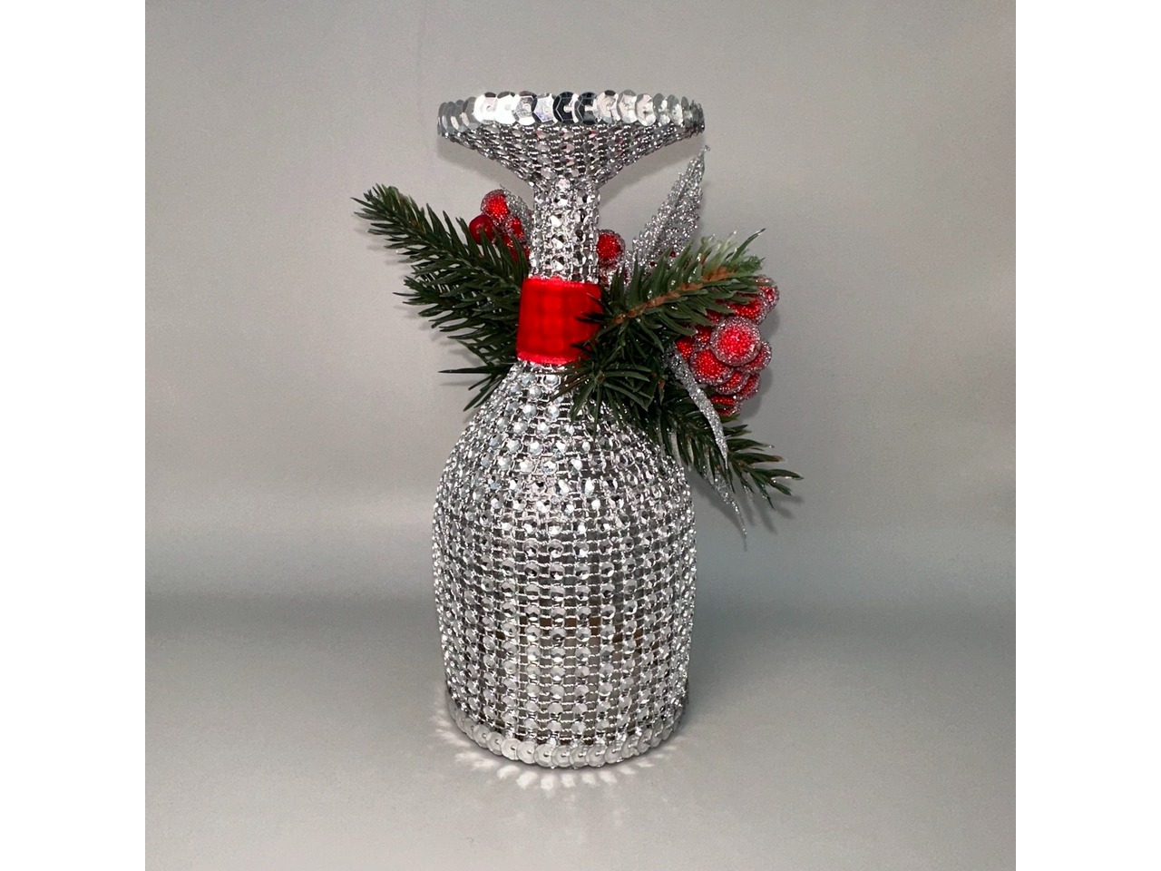 У роботі використані матеріали: основа бокал (скло), декоративні гілочки ялини (пластик), стрічка з імітацією страз, нитка з пайєтками, новорічна гілочка (пластик, глітер), цукрові ягідки, стрічка оксамитова. Розмір: висота бокала 15 см, діаметр 6,5 см, ширина композиції 10 см.