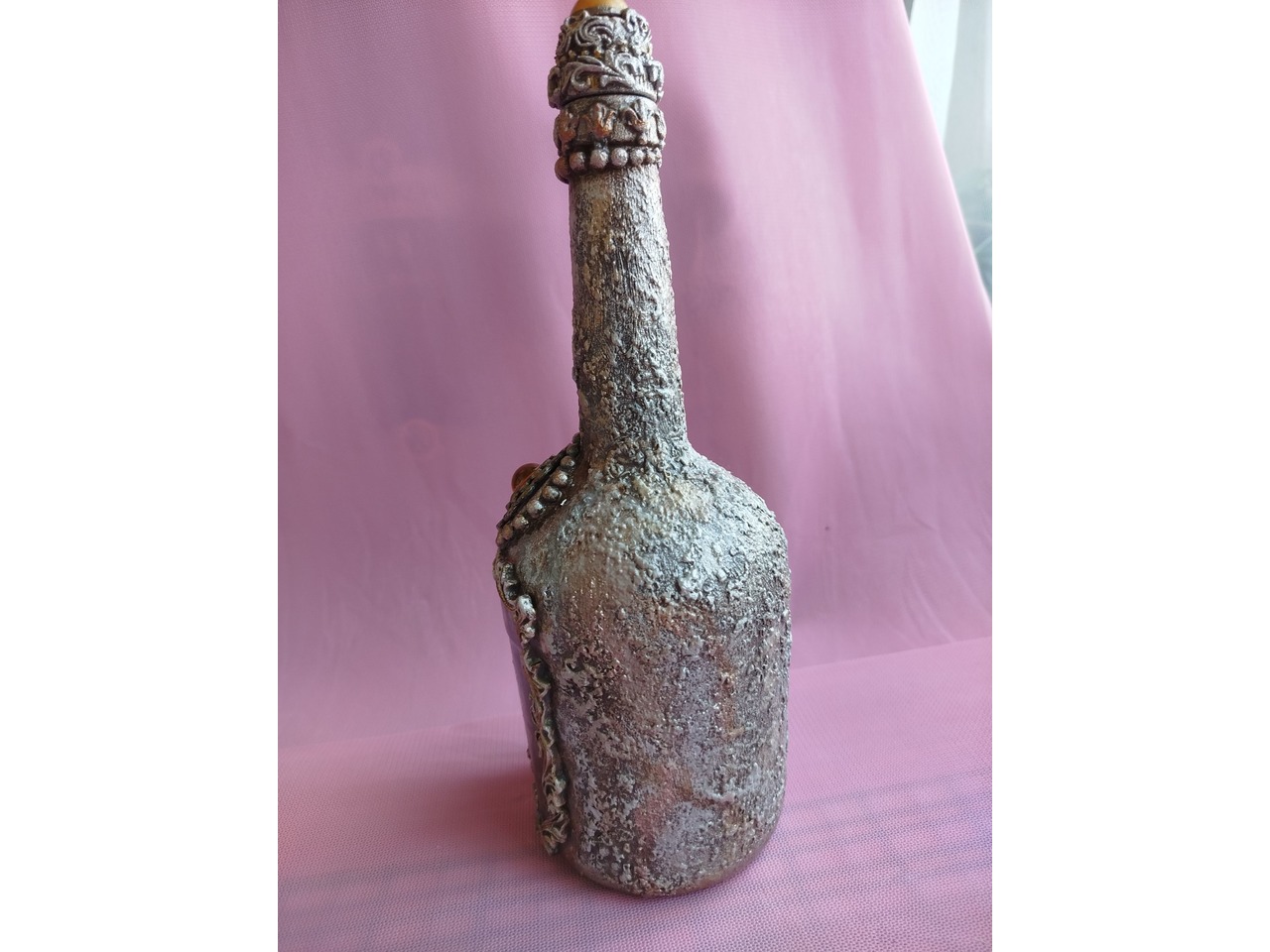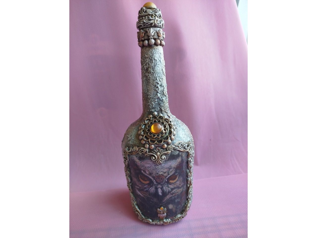 Стеклянная бутылка, на которой выполнен декупаж в виде совы. Так же в работе использовался природный материал - молотый кофе. Внешний вид бутылки напоминает о старине, как будто этой вещи много, много лет. Станет украшением вашего стола и приятно удивит гостей.