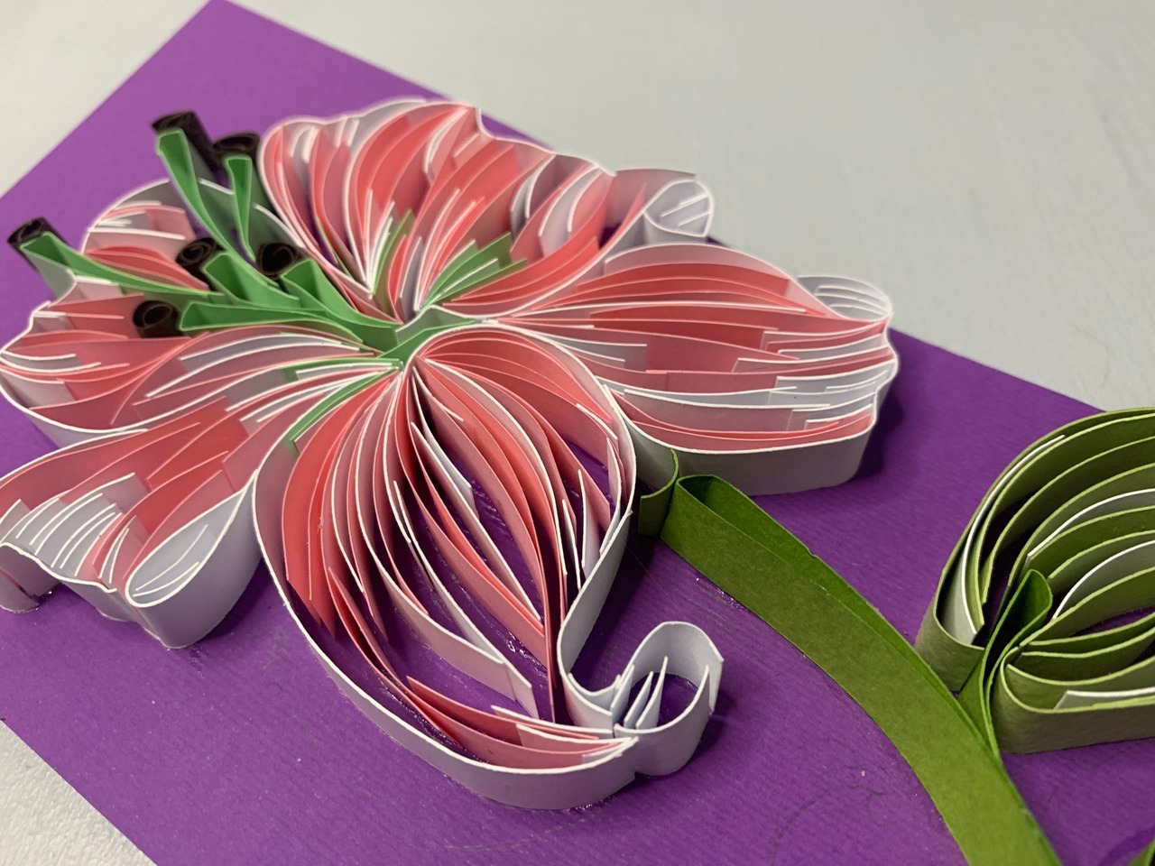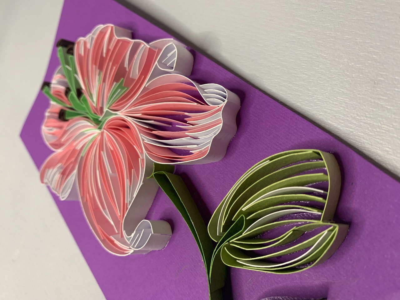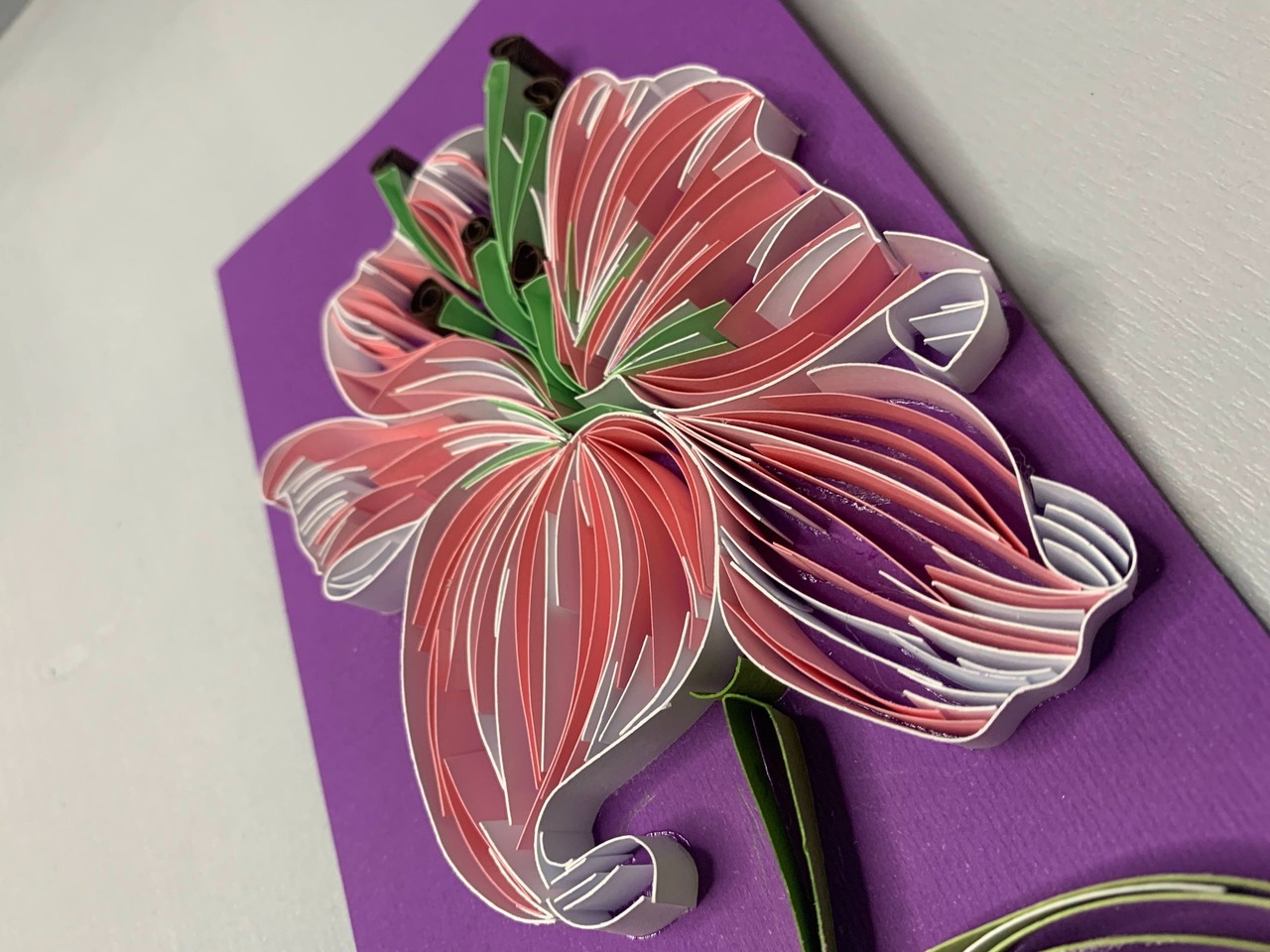 Вишукана листівка у техніці квілінг з ніжною об’ємною лілією — символом краси та витонченості. Пелюстки виконані з тонких паперових смужок, що створюють ефект легкості та глибини. Насичений фіолетовий фон підкреслює м’які рожево-білі відтінки квітки.Ідеальний варіант для привітання з Днем народження — виглядає як маленька декоративна картина, яку хочеться зберегти.