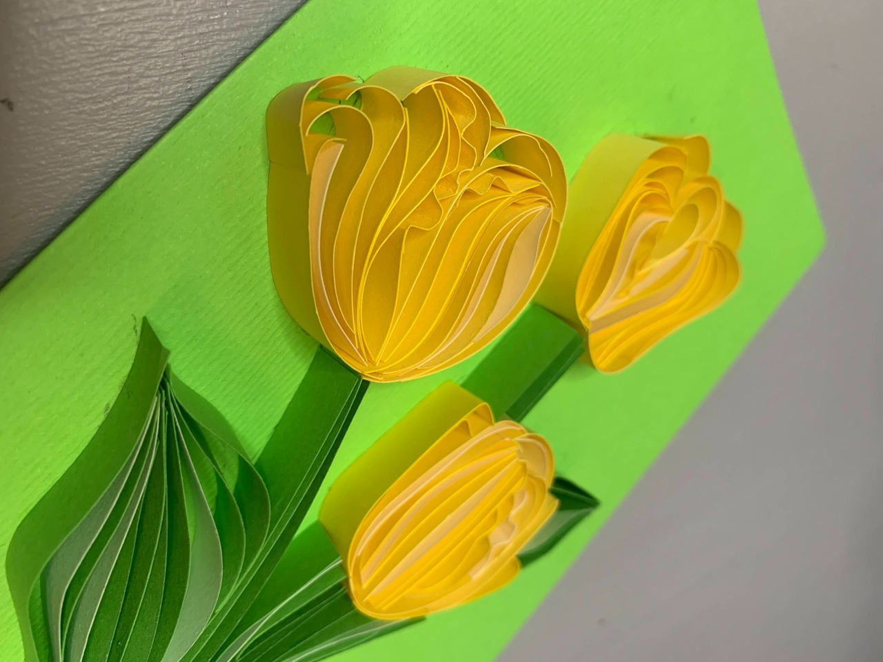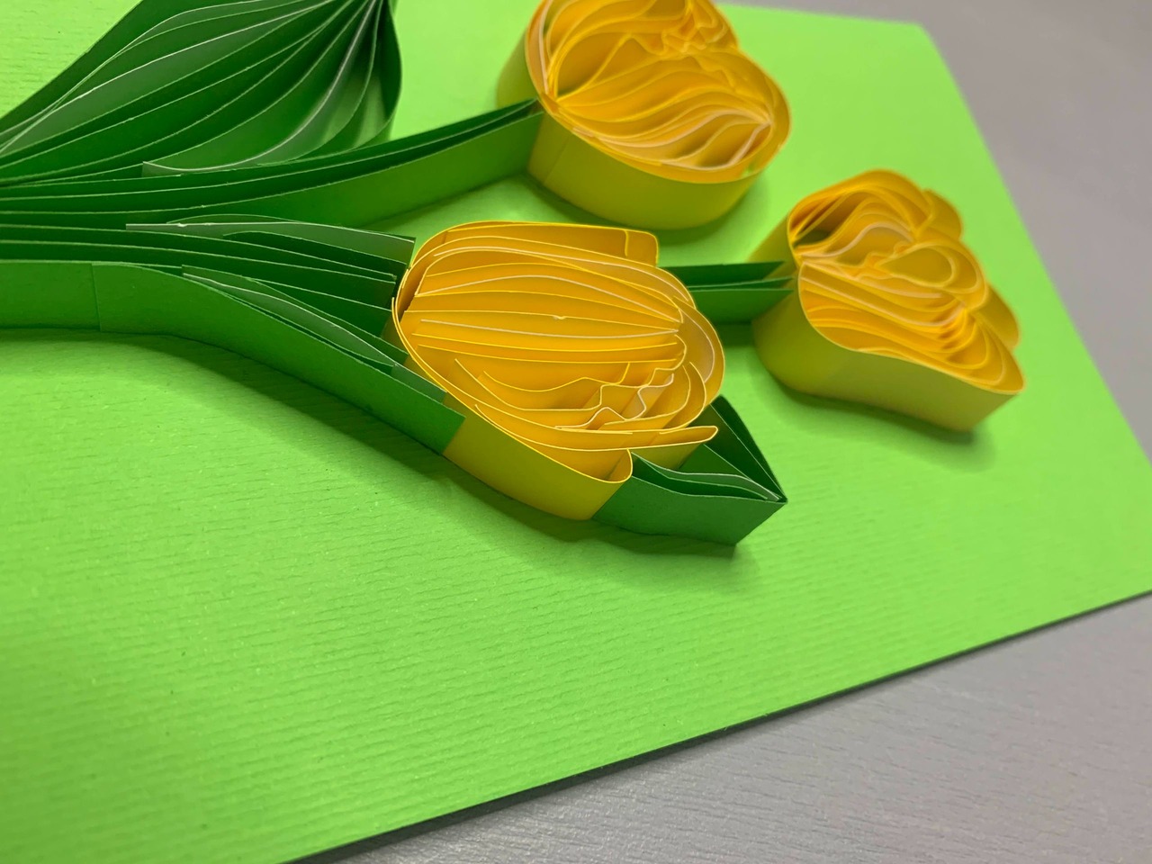 Ніжна та свіжа листівка у техніці квілінг з об’ємними жовтими тюльпанами. Кожна пелюстка сформована вручну, створюючи ефект живих квітів, що ніби щойно розкрились. Яскравий зелений фон підсилює відчуття весни, тепла та щирих емоцій.Ідеально підійде як універсальне привітання — “від щирого серця” для близької людини, мами, подруги або колеги.