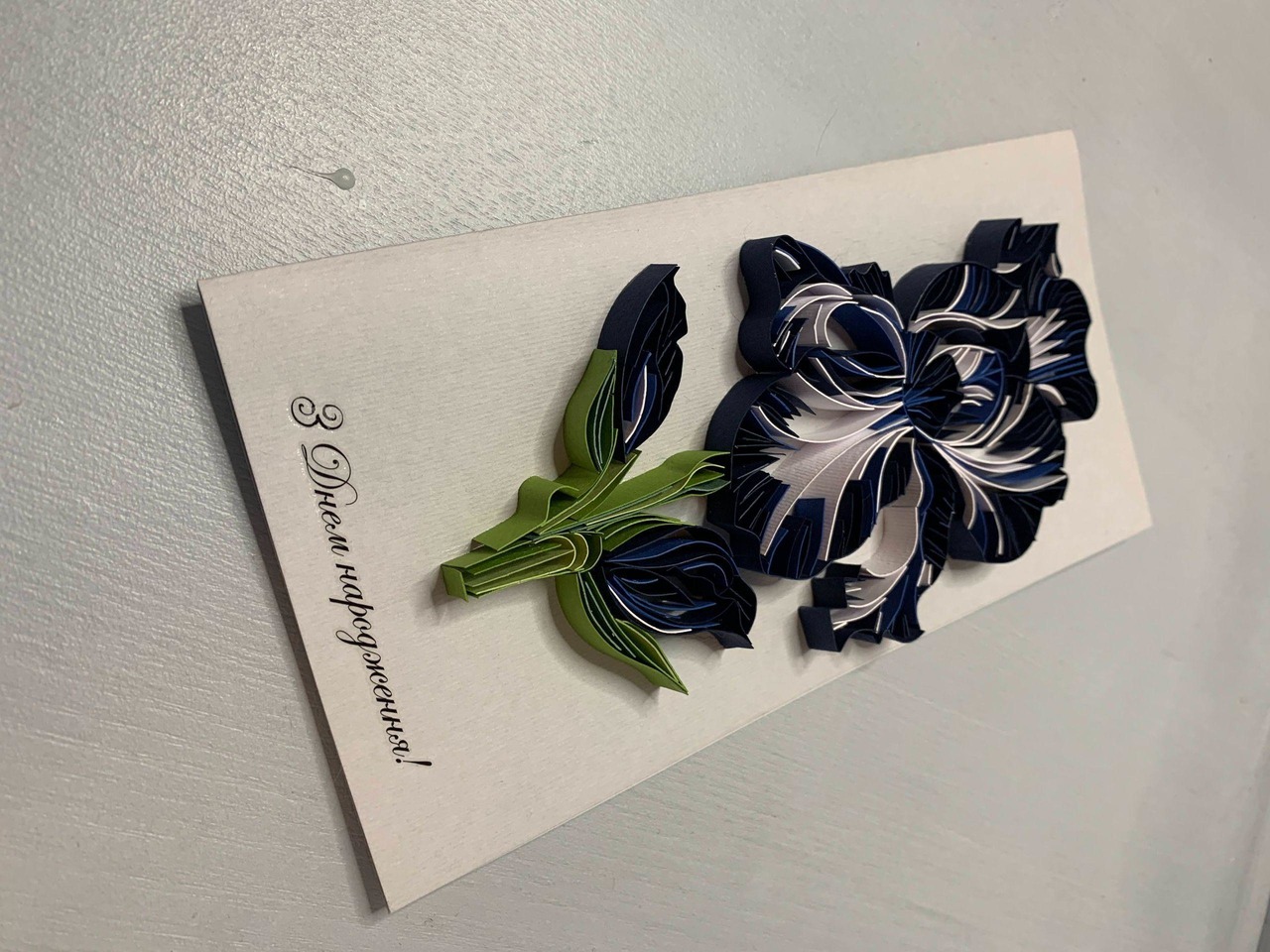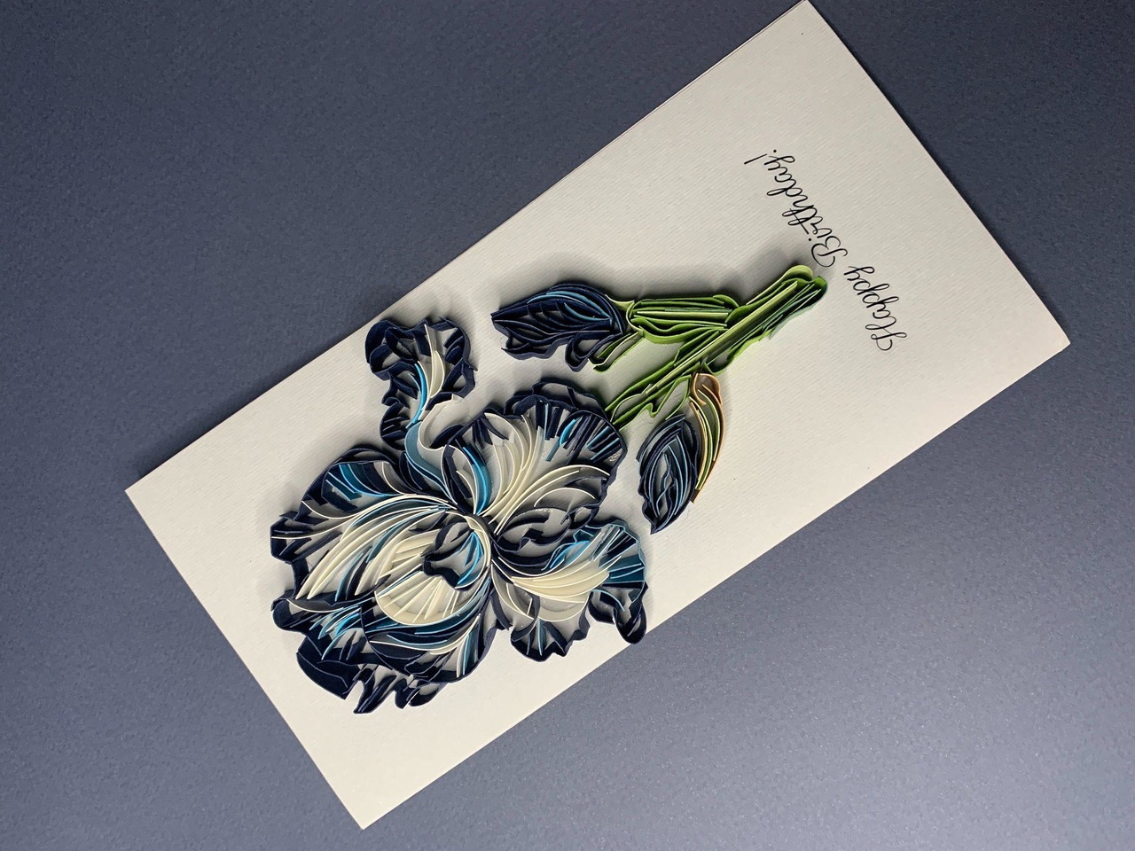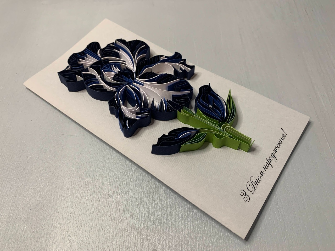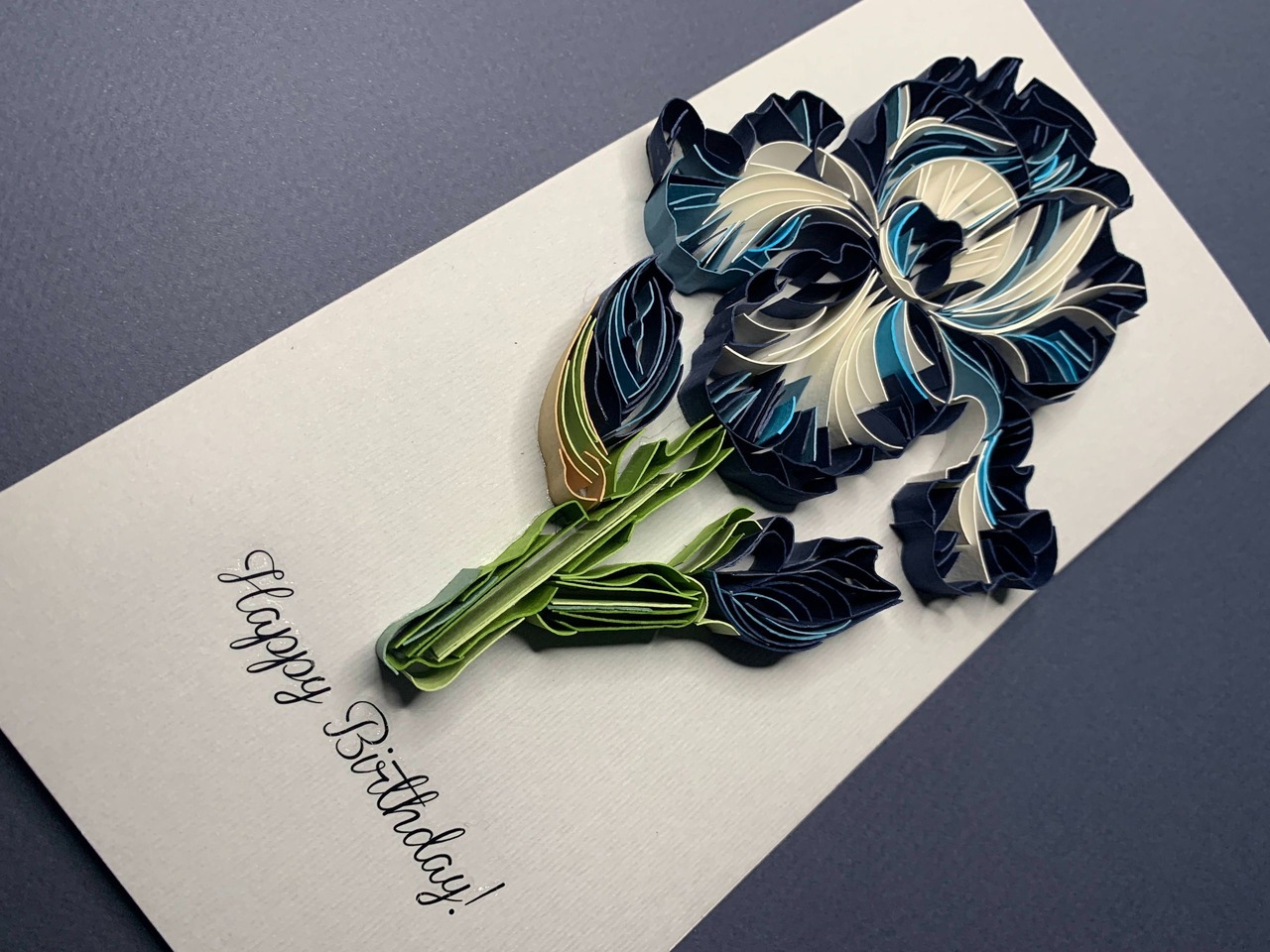Квілінг листівка “З Днем народження” з об’ємною ірисом у темно-синіх відтінках Опис: