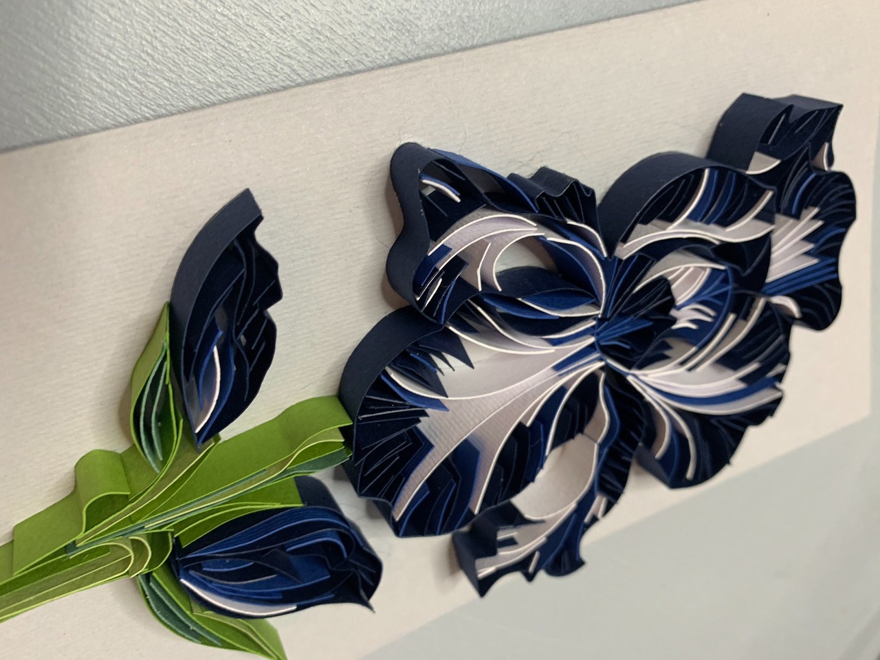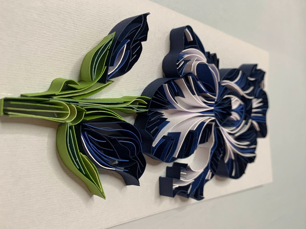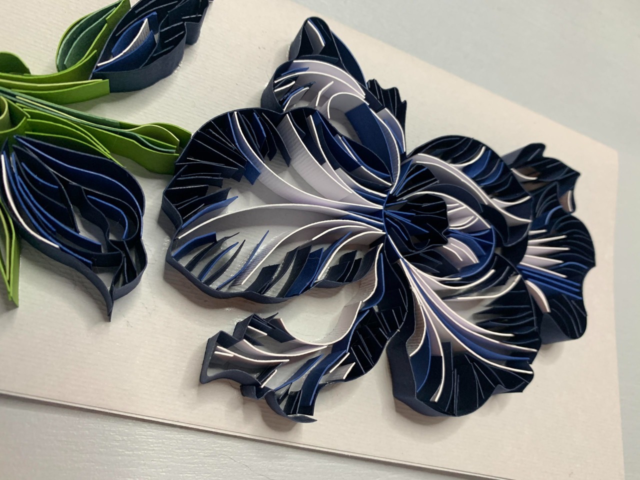 Стильна авторська листівка у техніці квілінг з розкішною об’ємною квіткою ірису. Поєднання глибокого темно-синього, чорного та білого створює контрастний, майже графічний ефект, який виглядає дуже елегантно та сучасно.Кожна деталь виконана вручну, що додає листівці унікальності та об’ємності. Ідеальний варіант для тих, хто цінує стриману красу та нестандартні подарунки.