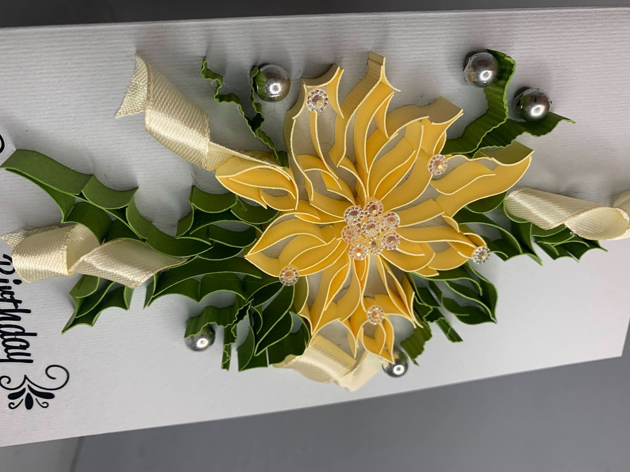 Ефектна святкова листівка у техніці квілінг з великою об’ємною квіткою в жовтих відтінках. Композицію доповнюють декоративні елементи: ніжні стрічки, перлинні акценти та глибоке зелене листя, що створює відчуття об’ємного букету.Виглядає дорого та урочисто — ідеально для подарунка на День народження, коли хочеться вразити та залишити емоцію надовго. Це не просто листівка, а повноцінний декоративний елемент.