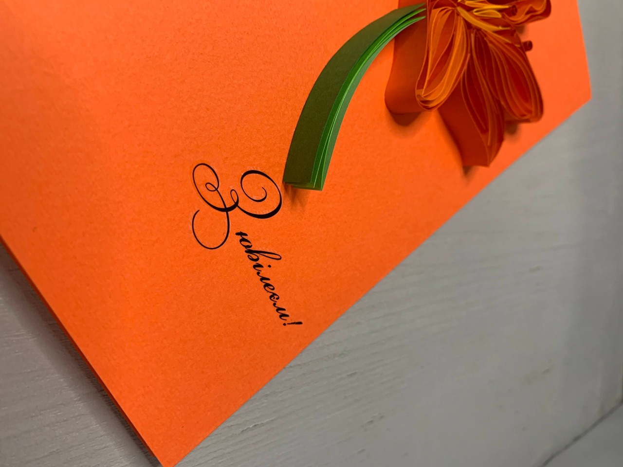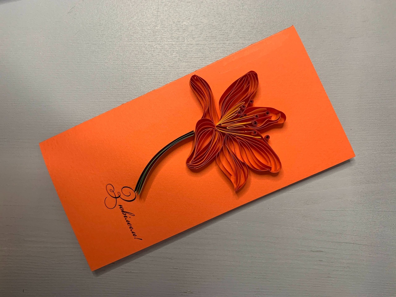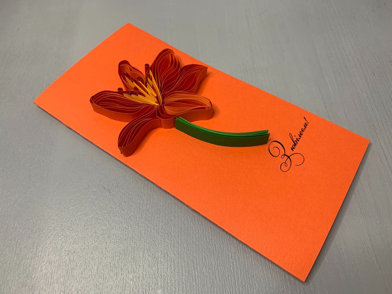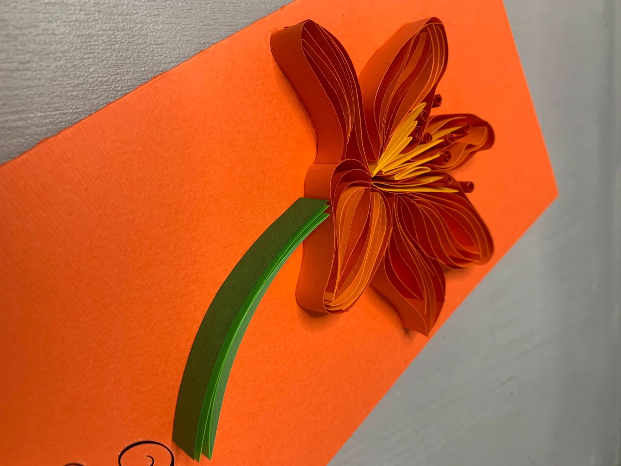 Яскрава святкова листівка у техніці квілінг з великою об’ємною лілією в насичених помаранчево-червоних відтінках. Чіткі лінії пелюсток і контрастний фон створюють ефект глибини та привертають увагу з першого погляду.