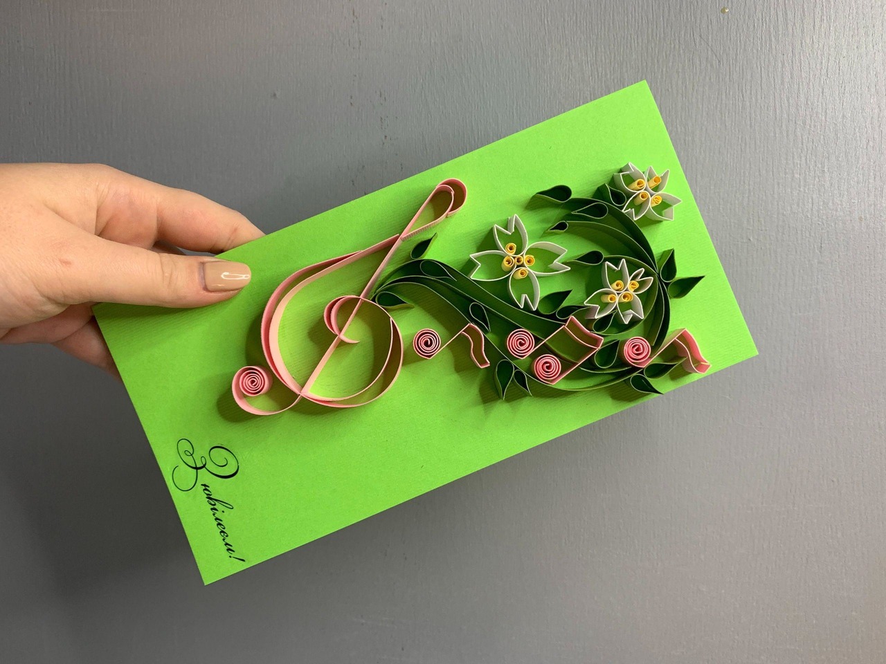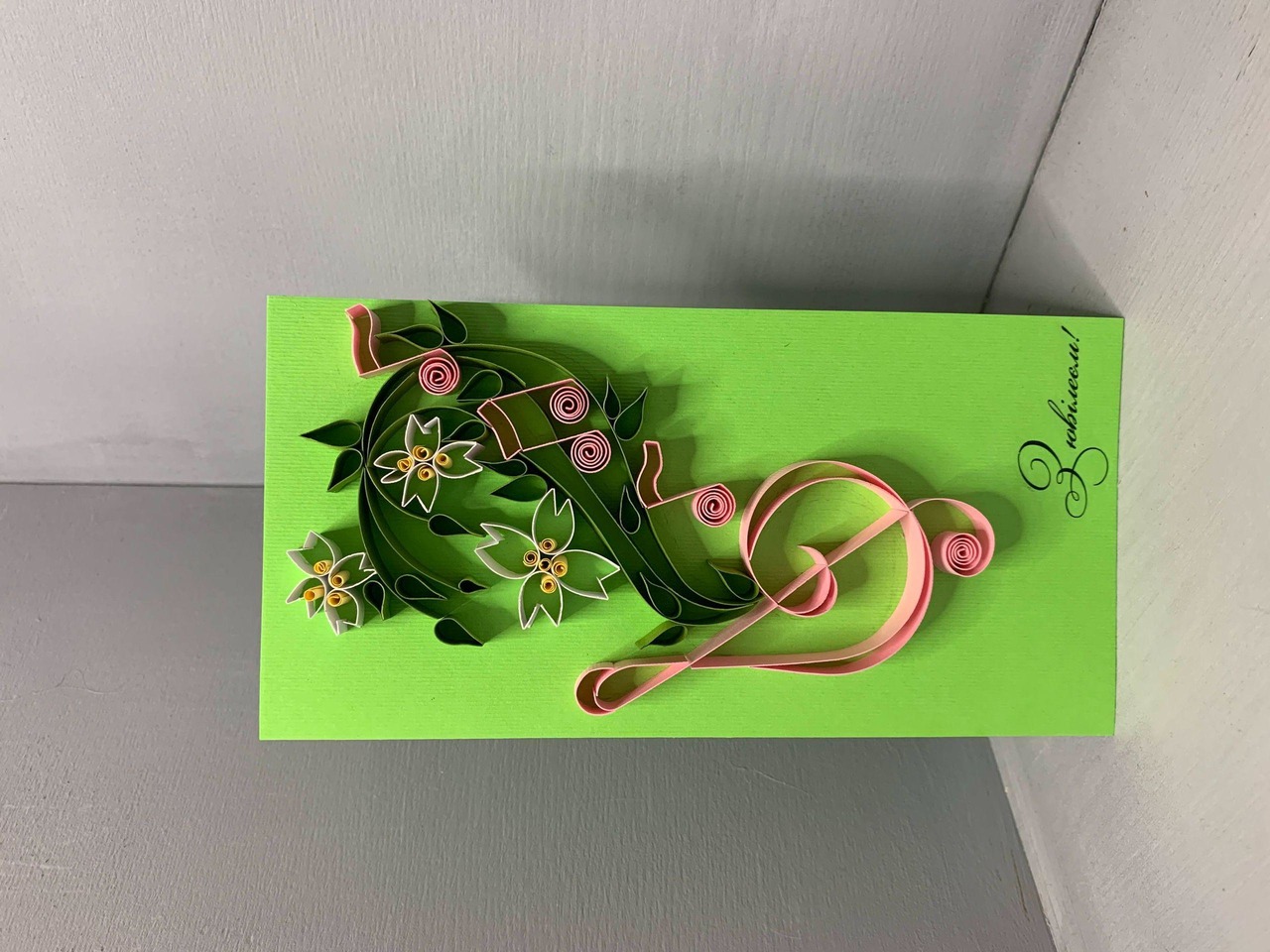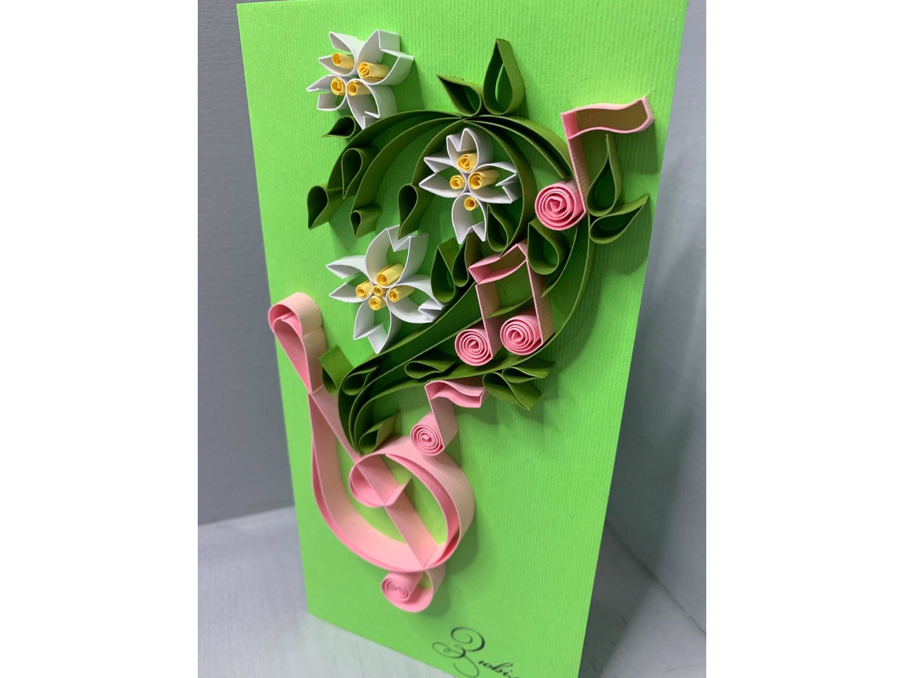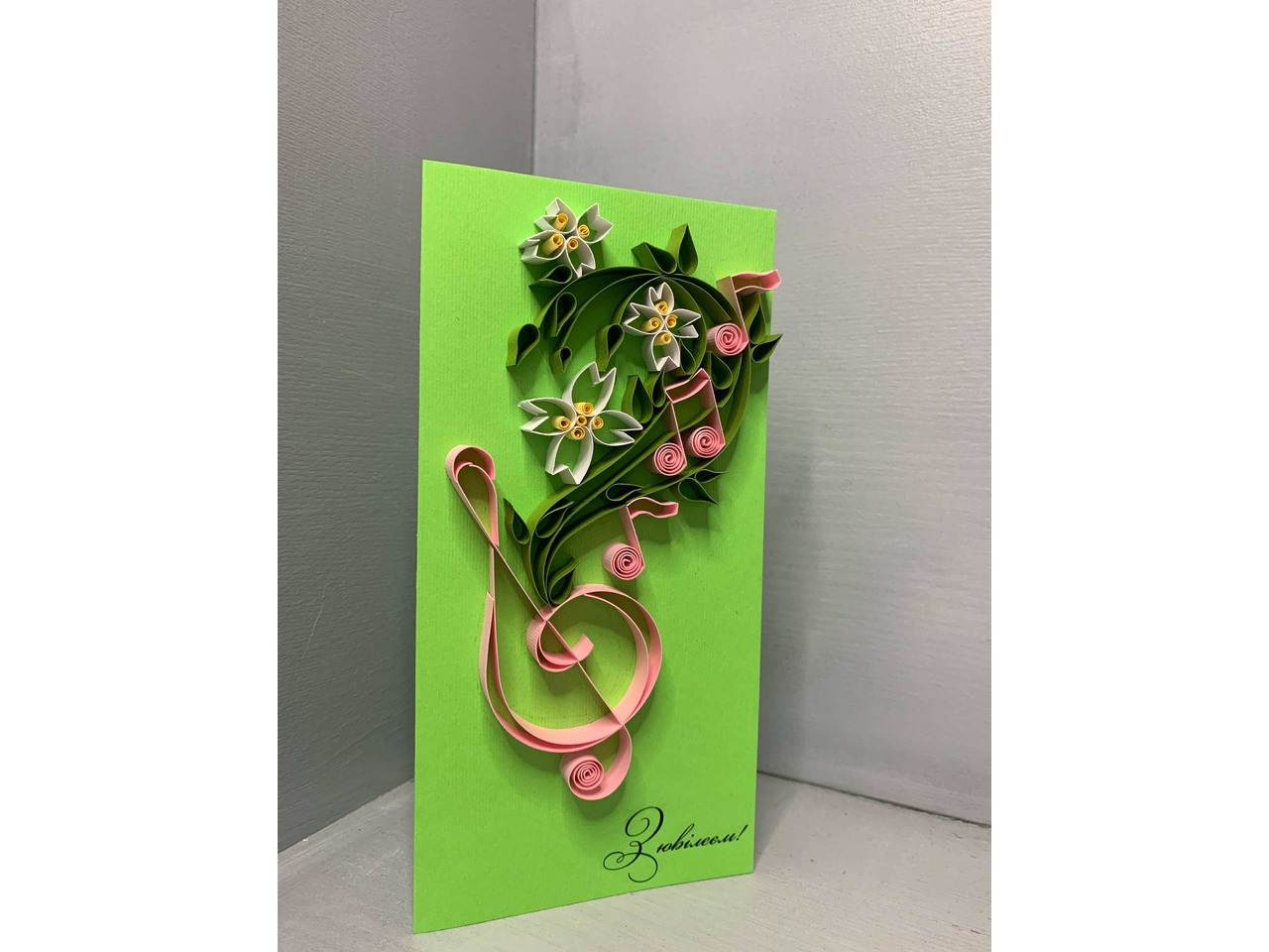 Легкість, як музика, що розквітаєВитончена листівка у техніці квілінг з оригінальною композицією у вигляді скрипкового ключа, доповненого ніжними квітами та зеленню. Поєднання плавних ліній і об’ємних елементів створює відчуття руху та гармонії.