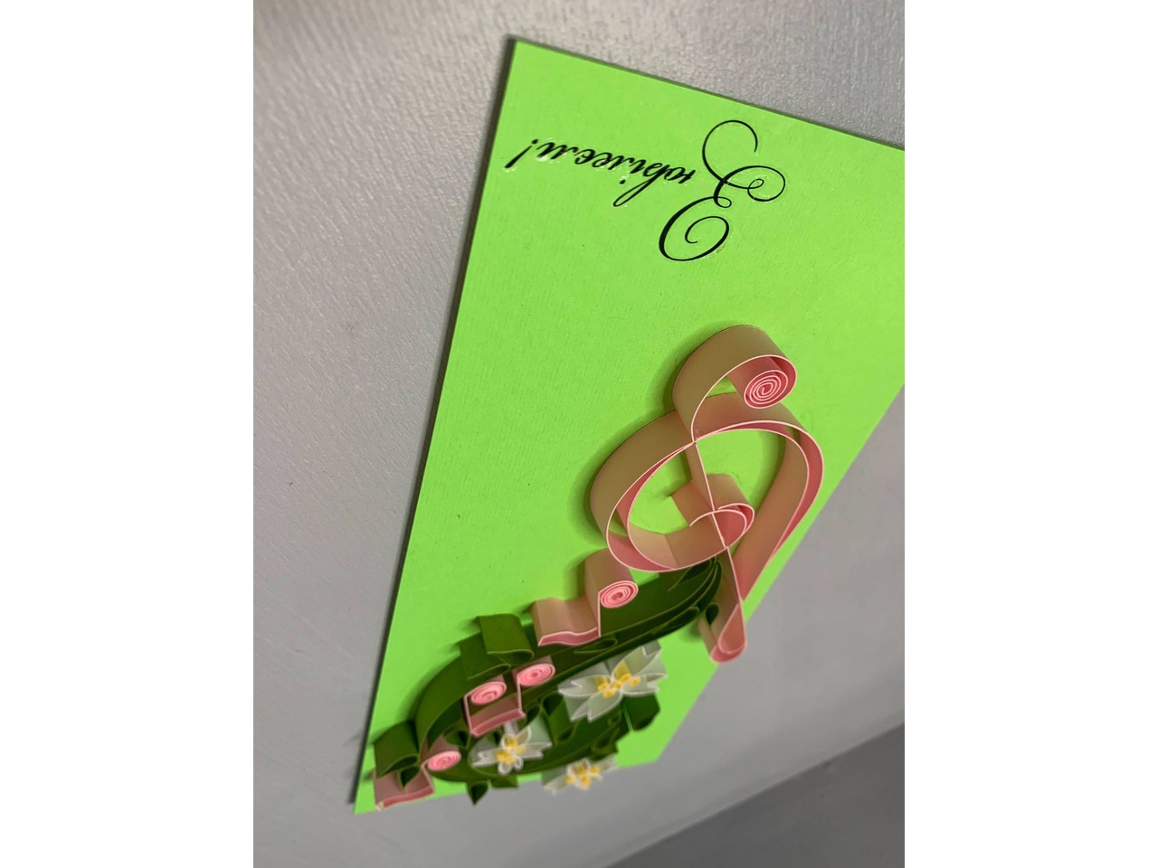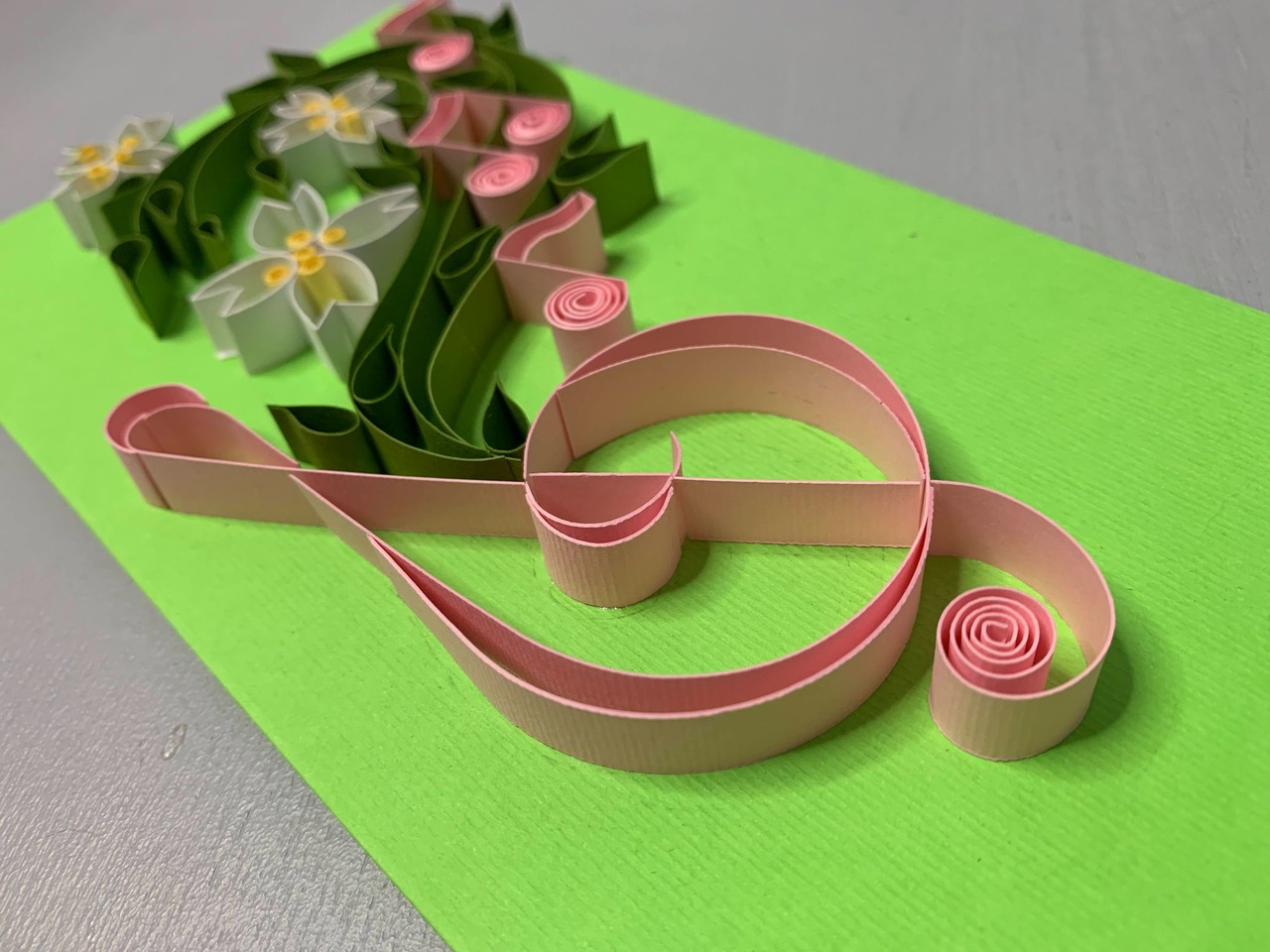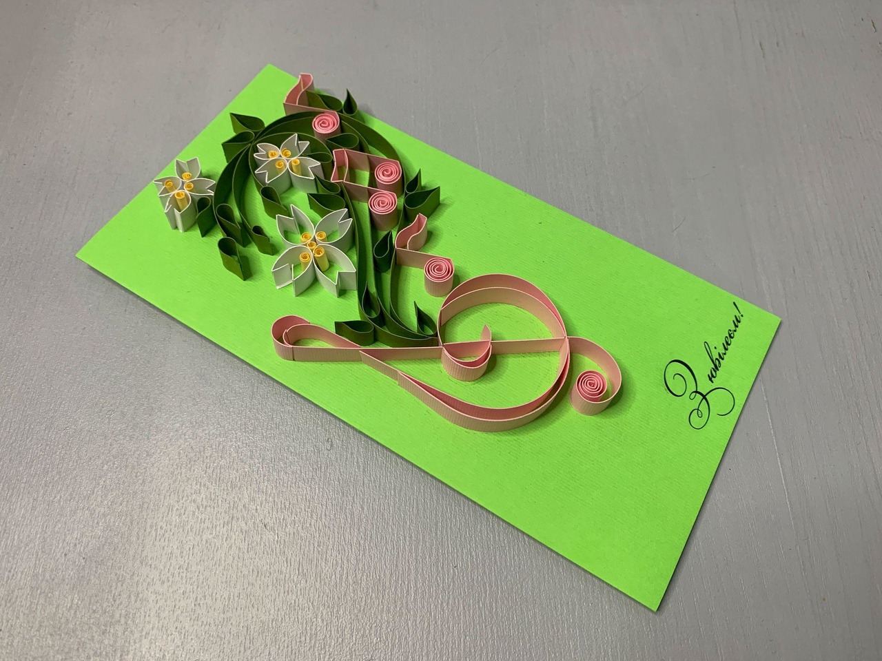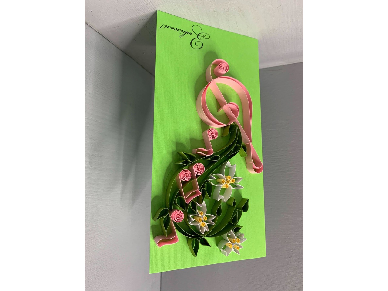 Легкість, як музика, що розквітаєВитончена листівка у техніці квілінг з оригінальною композицією у вигляді скрипкового ключа, доповненого ніжними квітами та зеленню. Поєднання плавних ліній і об’ємних елементів створює відчуття руху та гармонії.