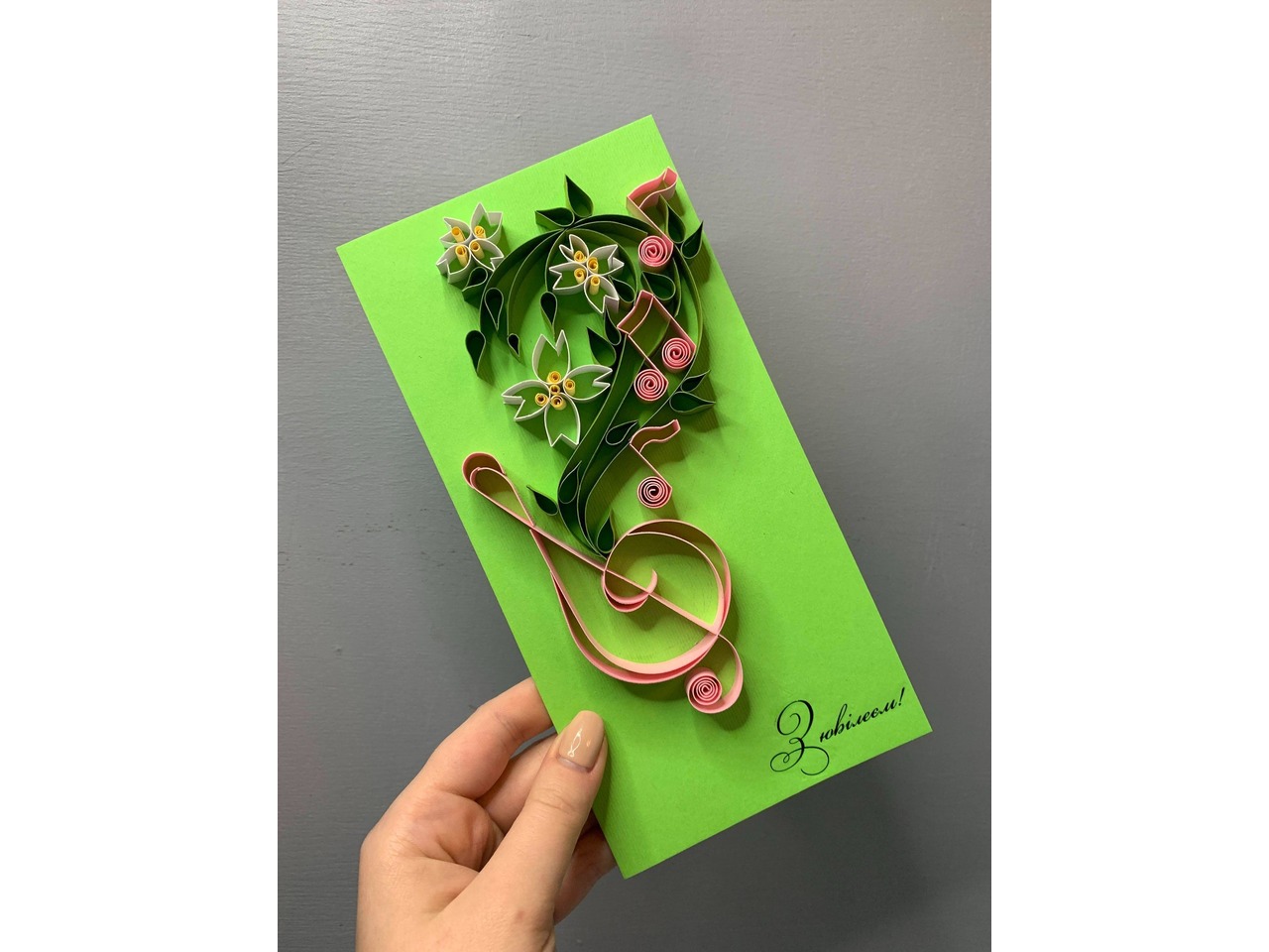 Квілінг листівка “З ювілеєм!” з декоративною композицією у формі скрипкового ключа