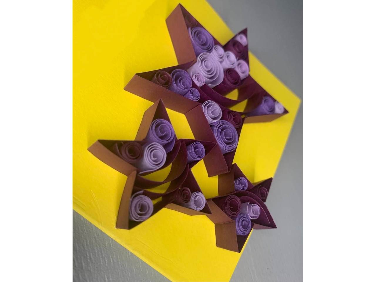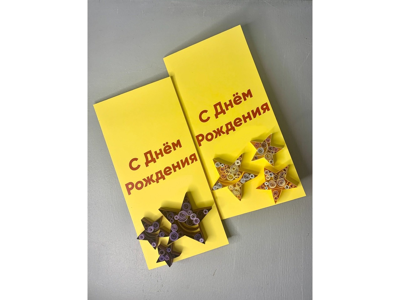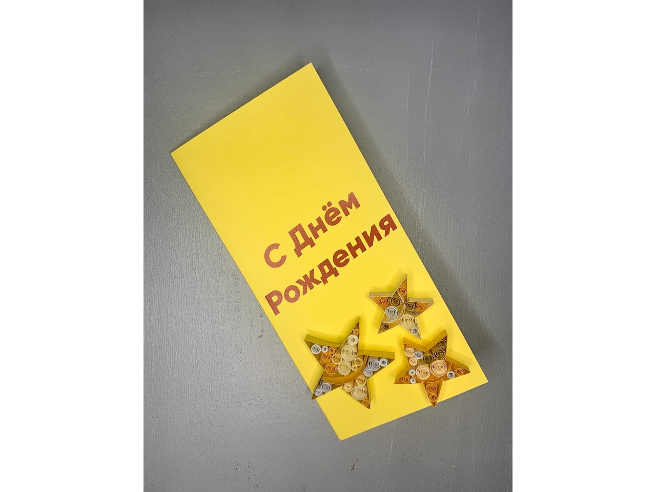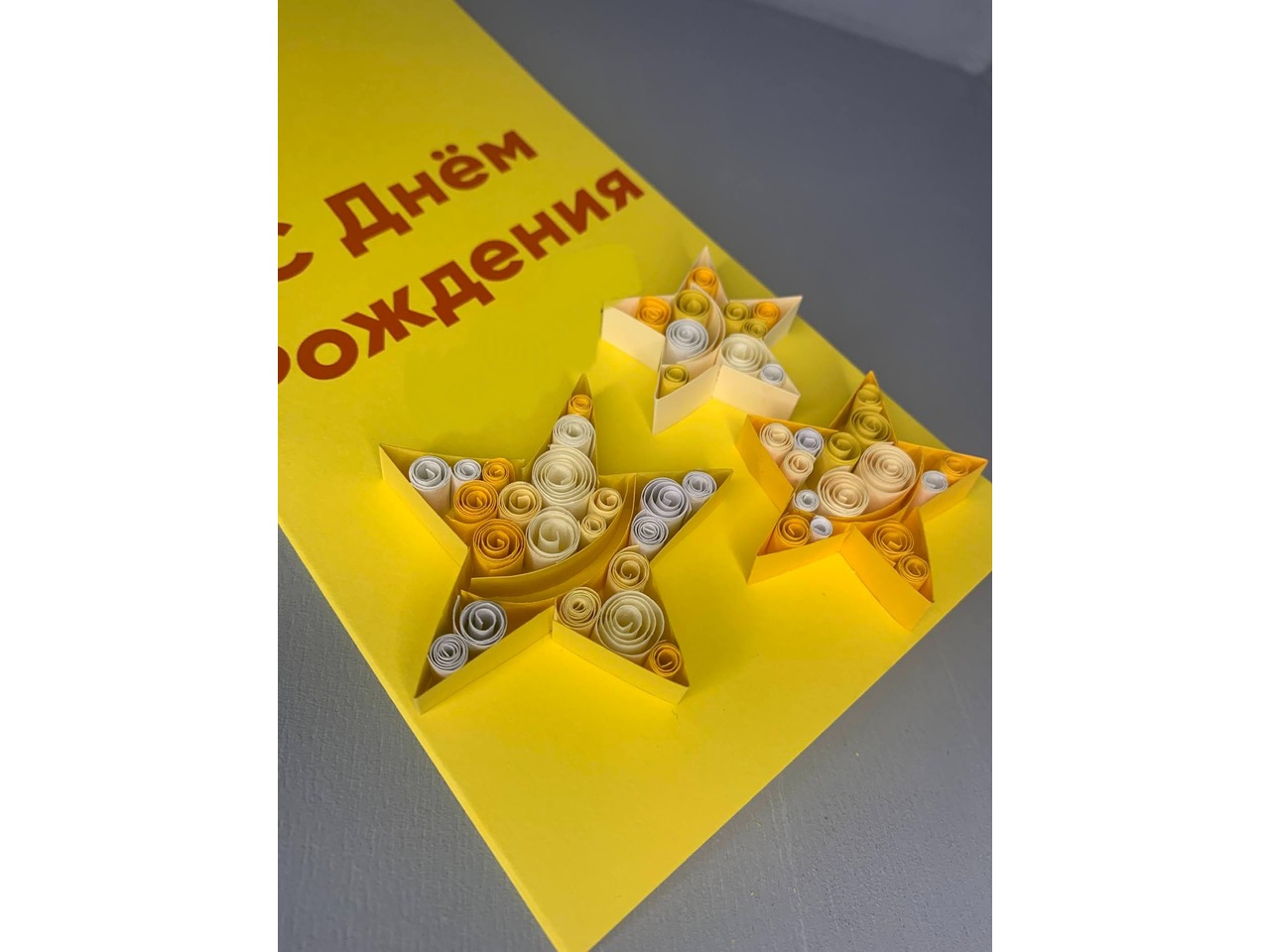 Яскрава листівка ручної роботи в техніці квілінг з об’ємними зірками.Мінімалістичний дизайн у жовто-золотій гамі,що виглядає святково та сучасно.Підійде для універсального подарунка або корпоративного привітання.Можливе виготовлення під замовлення та оптом.