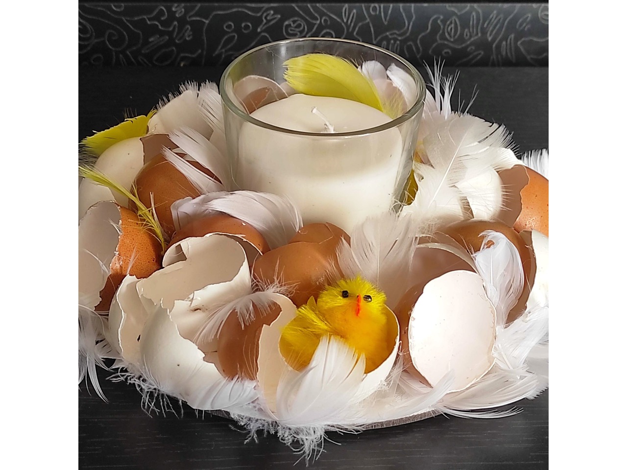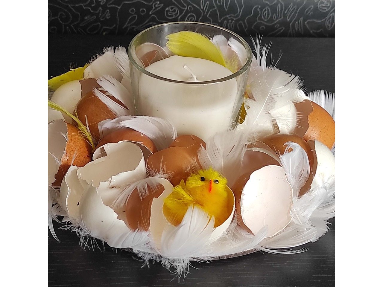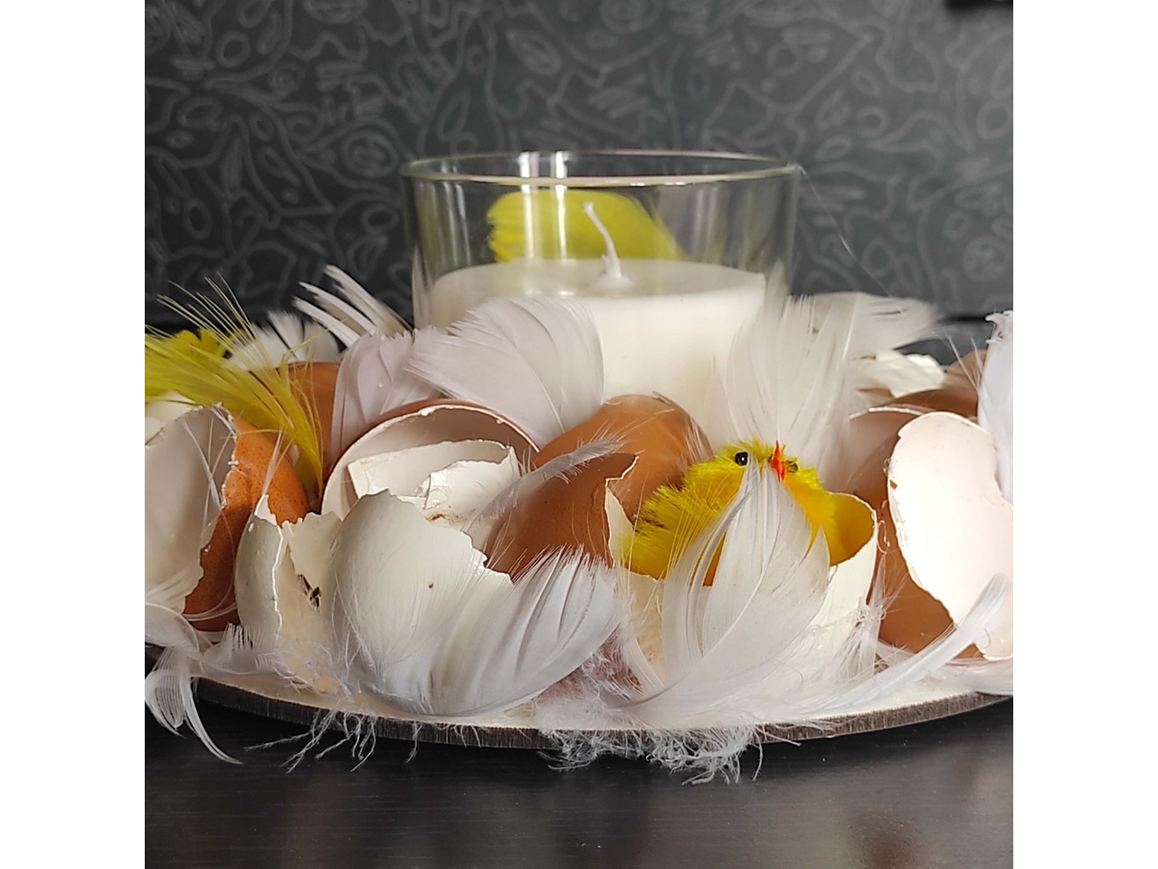 Підставка діаметром 20 см, у центрі — скляний підсвічник. Декор виконаний із натуральної яєчної шкаралупи, укріпленої клеєм, пір’ячка білого та жовтого кольору та маленького штучного курчати.