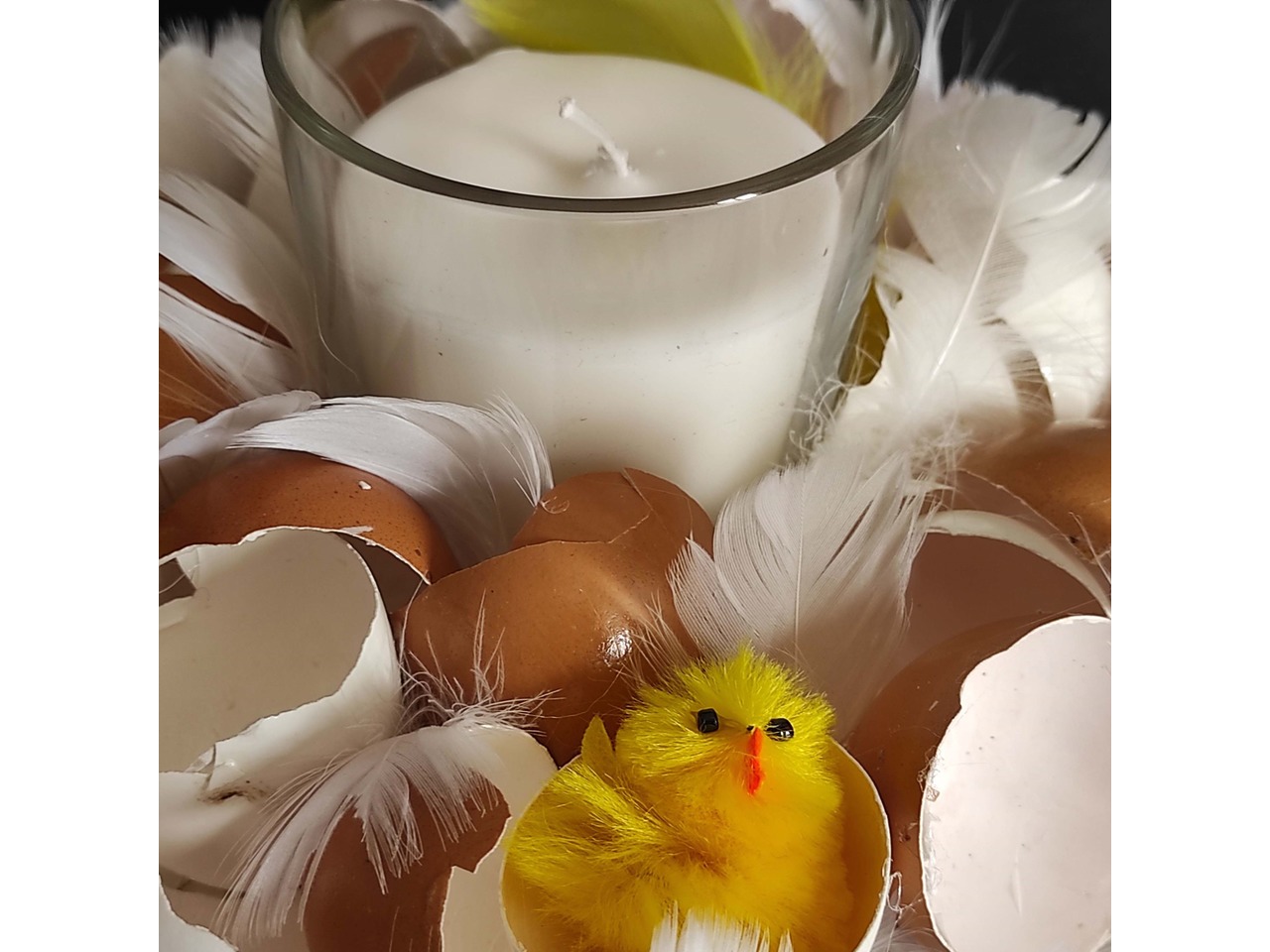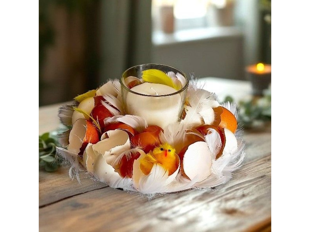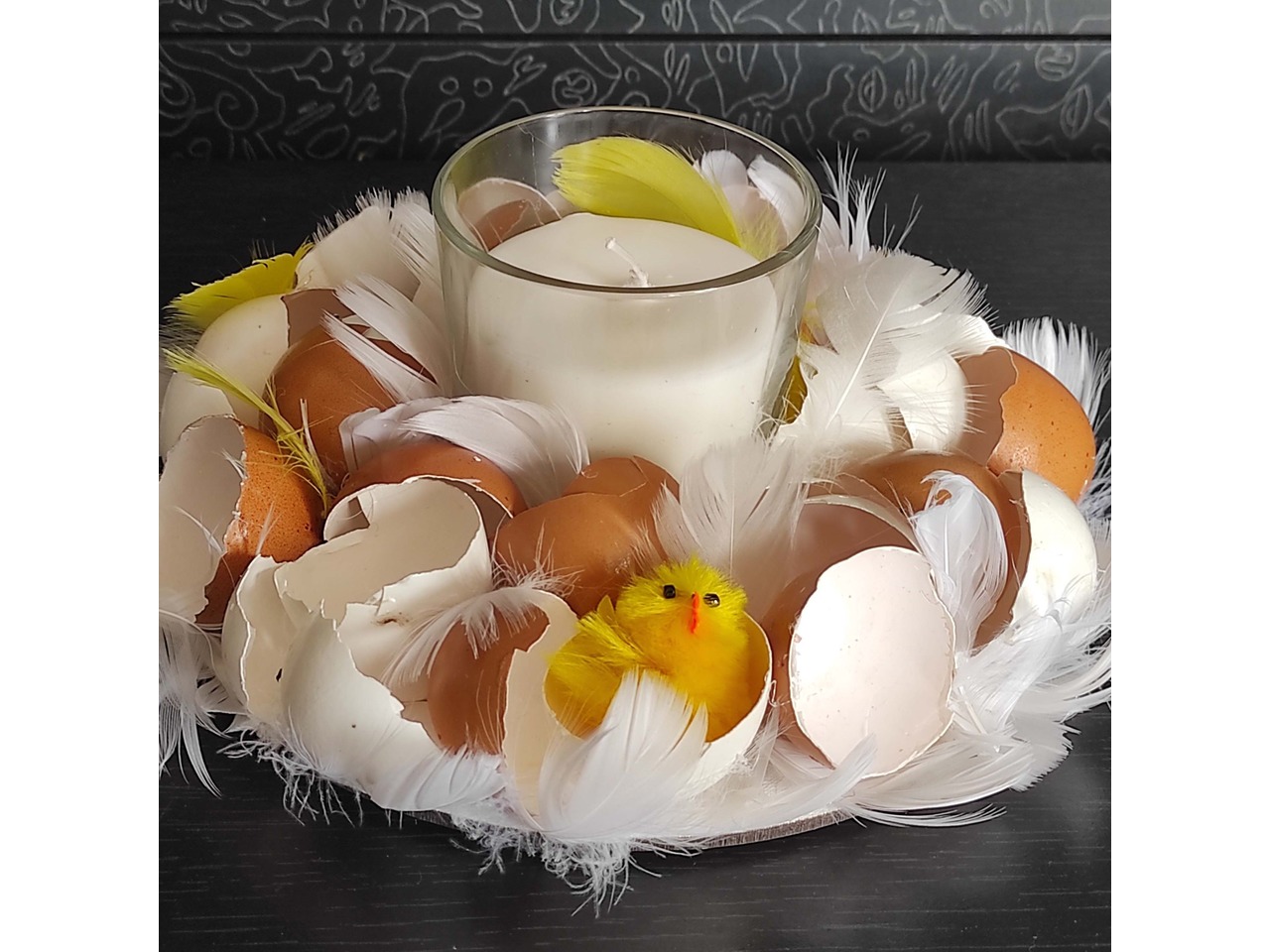Підставка діаметром 20 см, у центрі — скляний підсвічник. Декор виконаний із натуральної яєчної шкаралупи, укріпленої клеєм, пір’ячка білого та жовтого кольору та маленького штучного курчати.