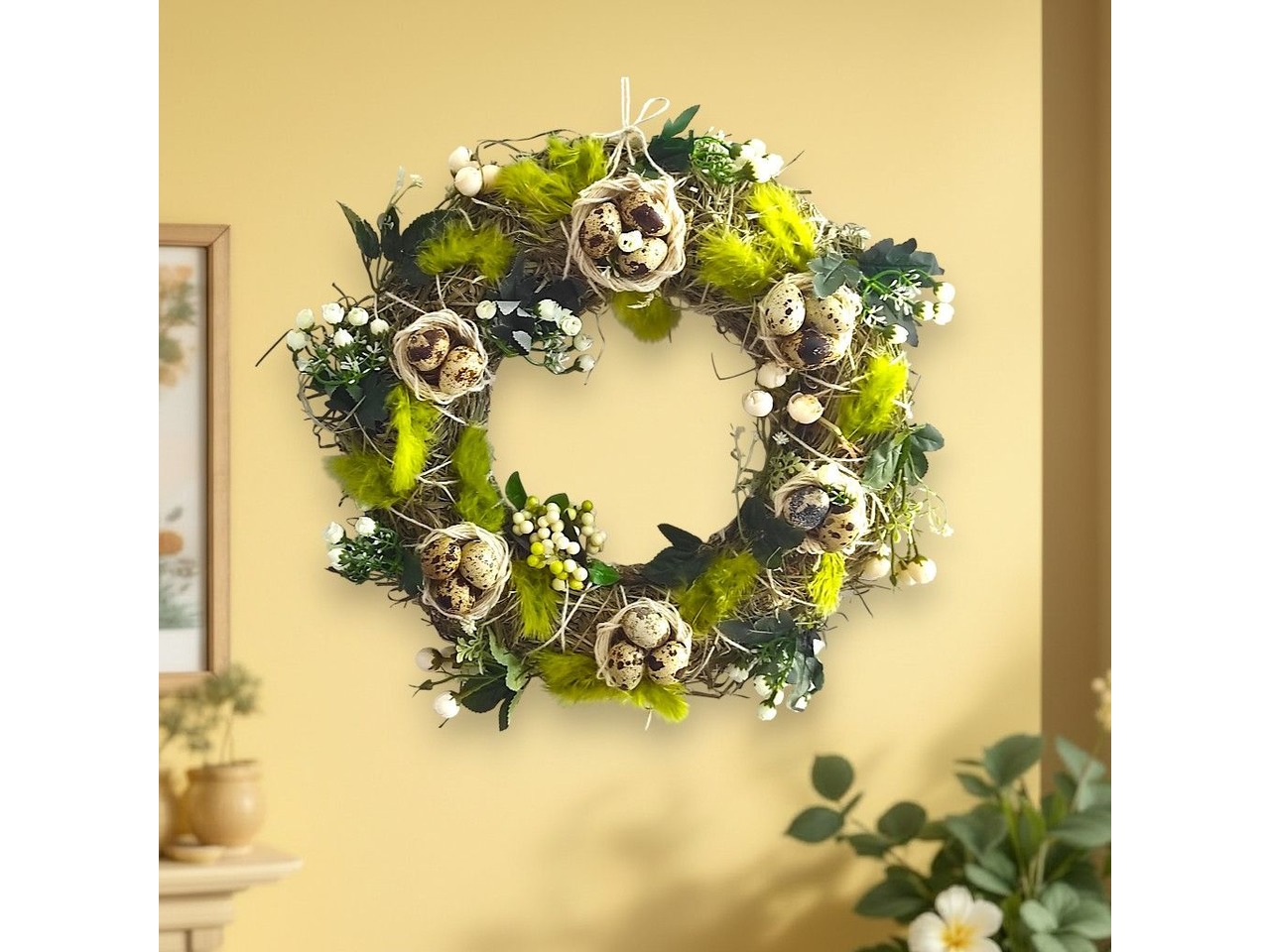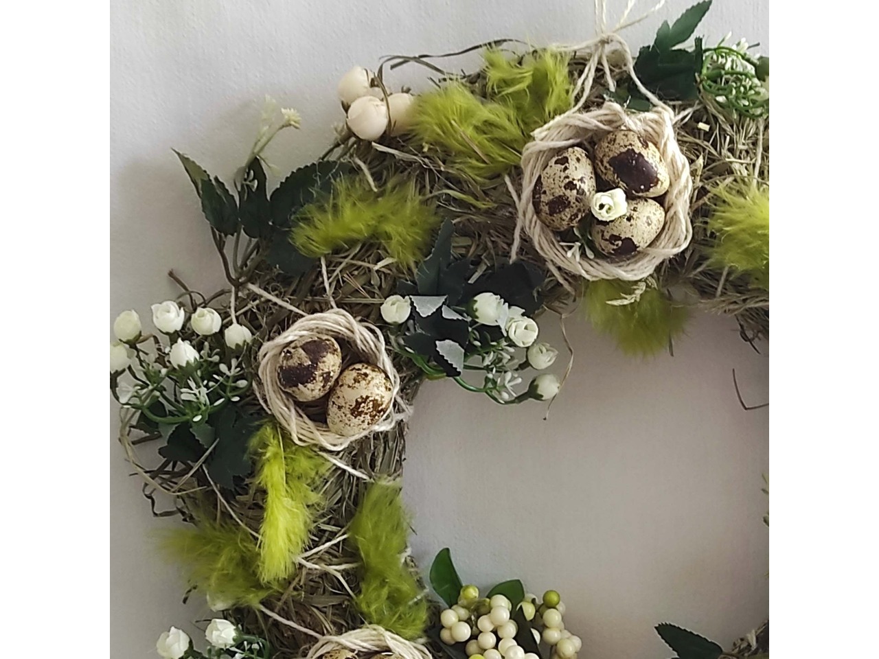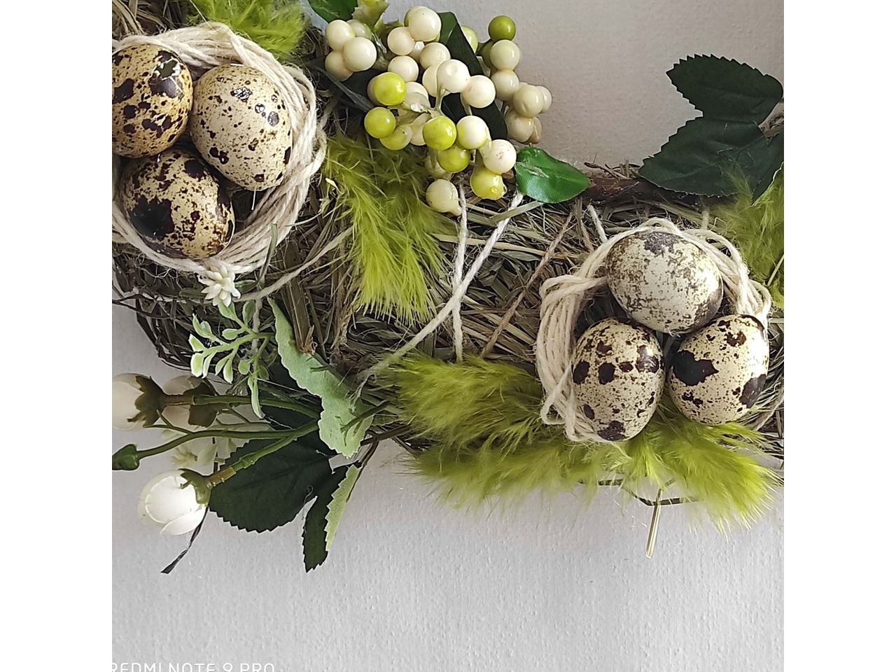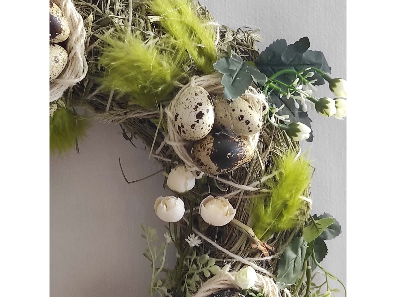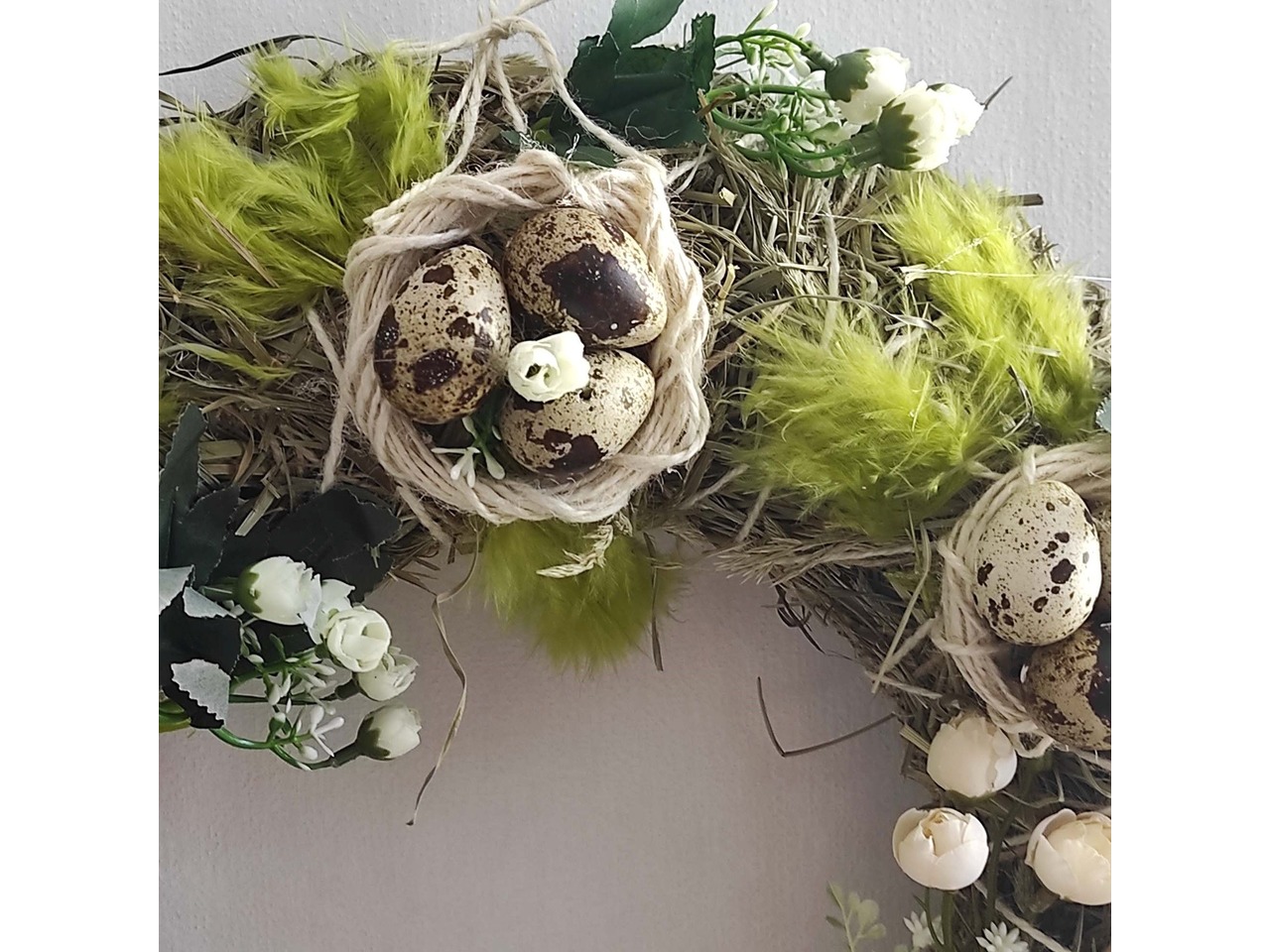 Великодній вінок з перепелиними яйцями – ексклюзивний подарунок ручної роботиЕксклюзивний великодній вінок ручної роботи, створений із зеленої соломи, білого джутового шпагату, штучних квітів та пір’я кольору хакі. Натуральні перепелині яйця оброблені клеєм для міцності та довговічності.
