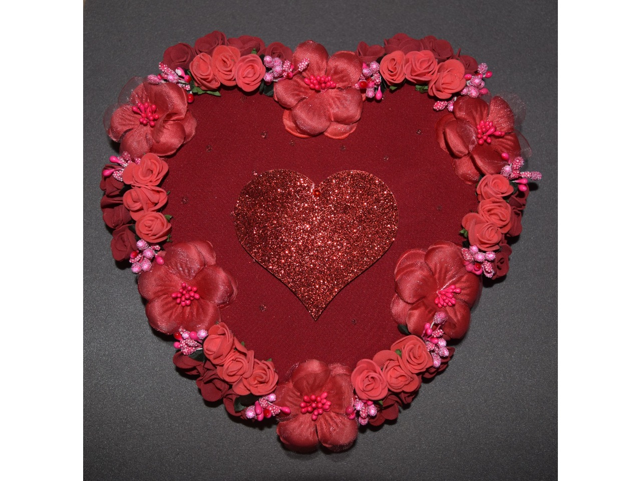 Материал: основа - сердце из пенопласта, обтянуто тканью. Сердце украшено: розочки из латекса, цветы из ткани, тычинки, деревянное сердце покрыто глиттером. Размер: высота 23 см, ширина 24 см. Оригинальный подарок для Любимых к празднику Влюблённых!