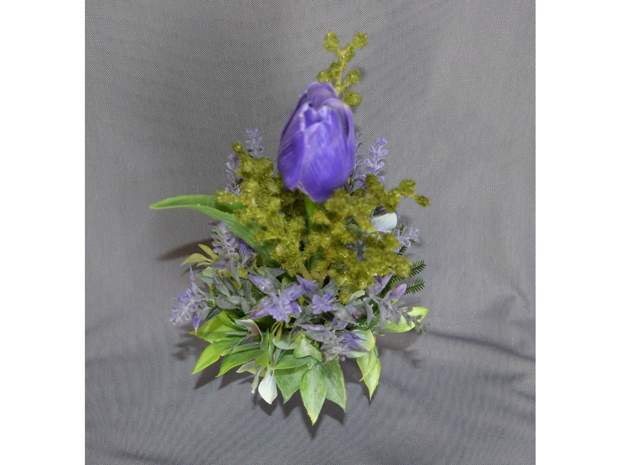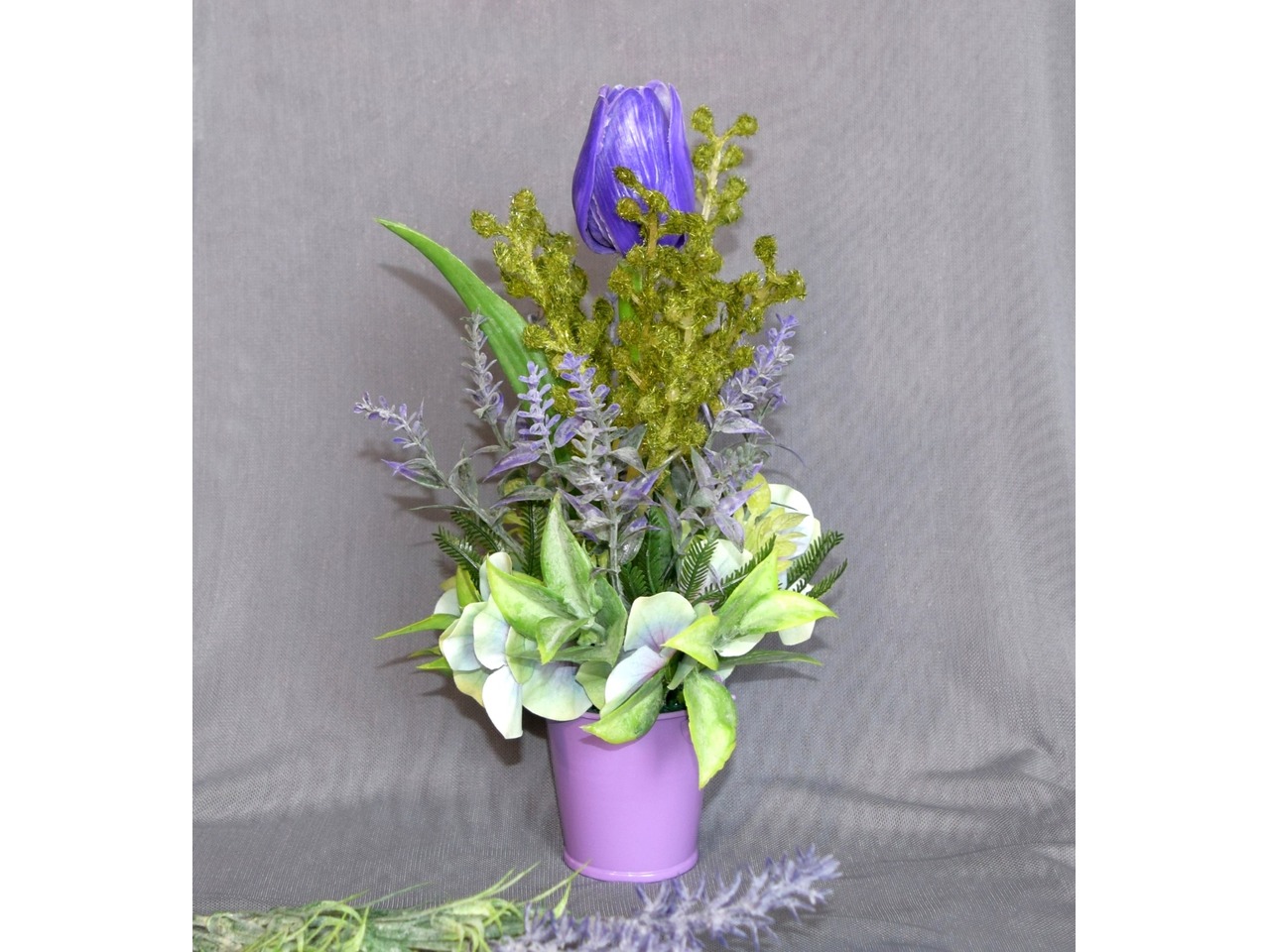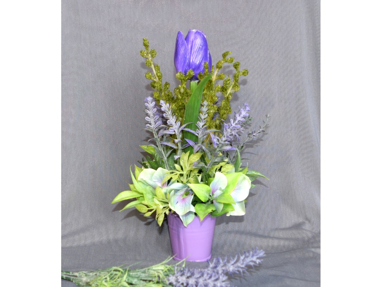 У роботі використані матеріали: відерце (метал), тканинні та пластикові квіточки, штучна зелень. Розмір: висота композиції 24 см, діаметр 13 см. Чарівний букетик для тих, хто любить весняні квіти та оригінальні подарунки!