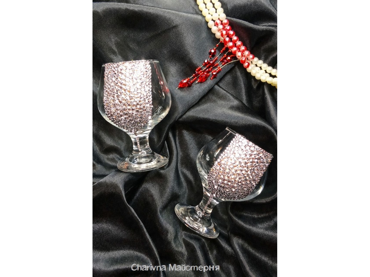 Новий напрямок у творчій діяльності Charivn_oї Майстерні – робота зі стразами. Неймовірне захоплення і краса!Келихи, інкрустовані стразами, - це не просто посуд, а справжній арт-об’єкт! Кожен страз дбайливо і з натхненням викладається вручну, створюючи живе сяяння, яке фантастично виблискує при будь-якому освітленні