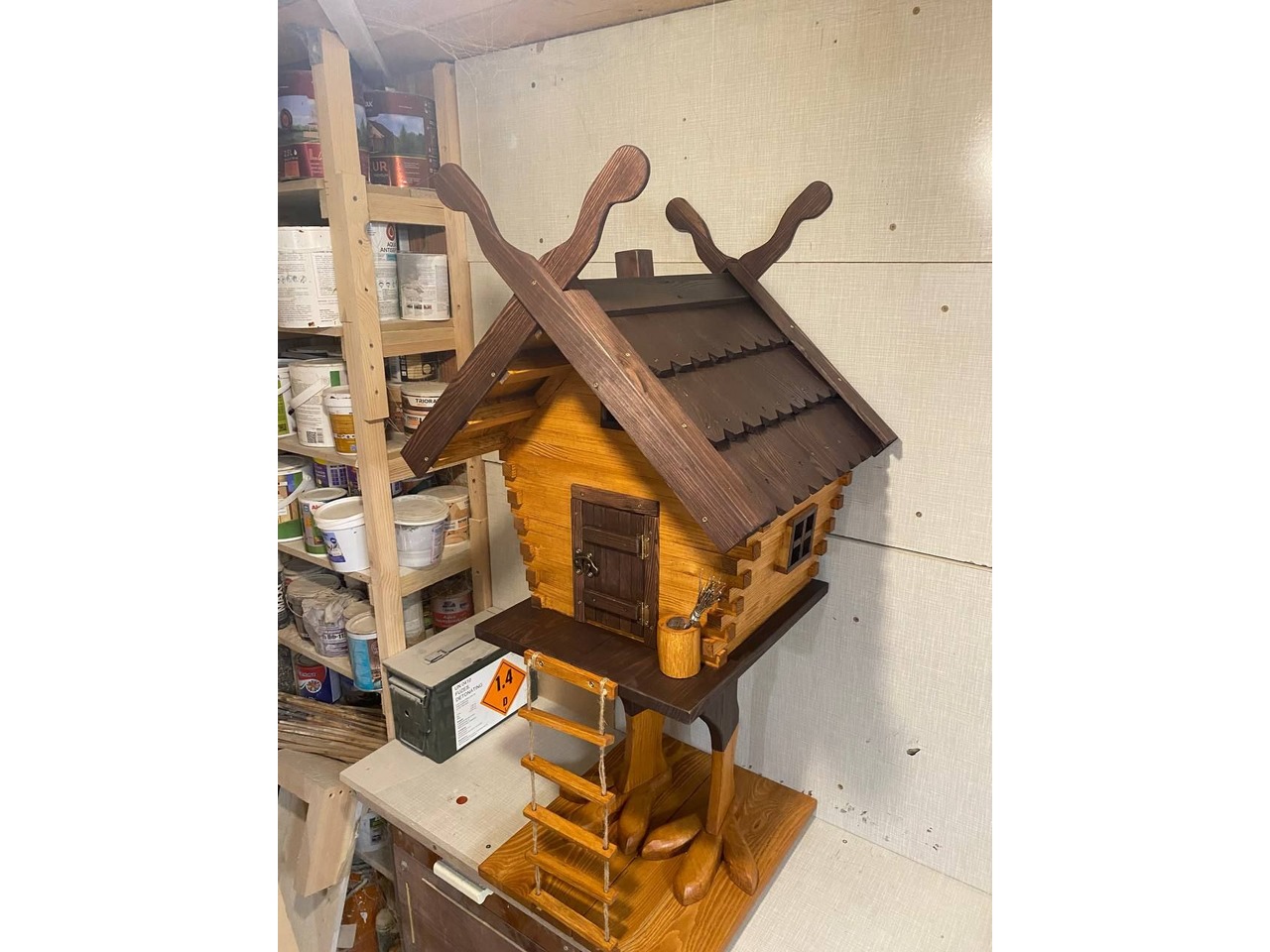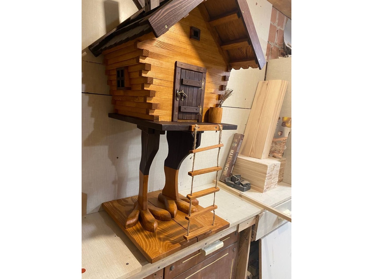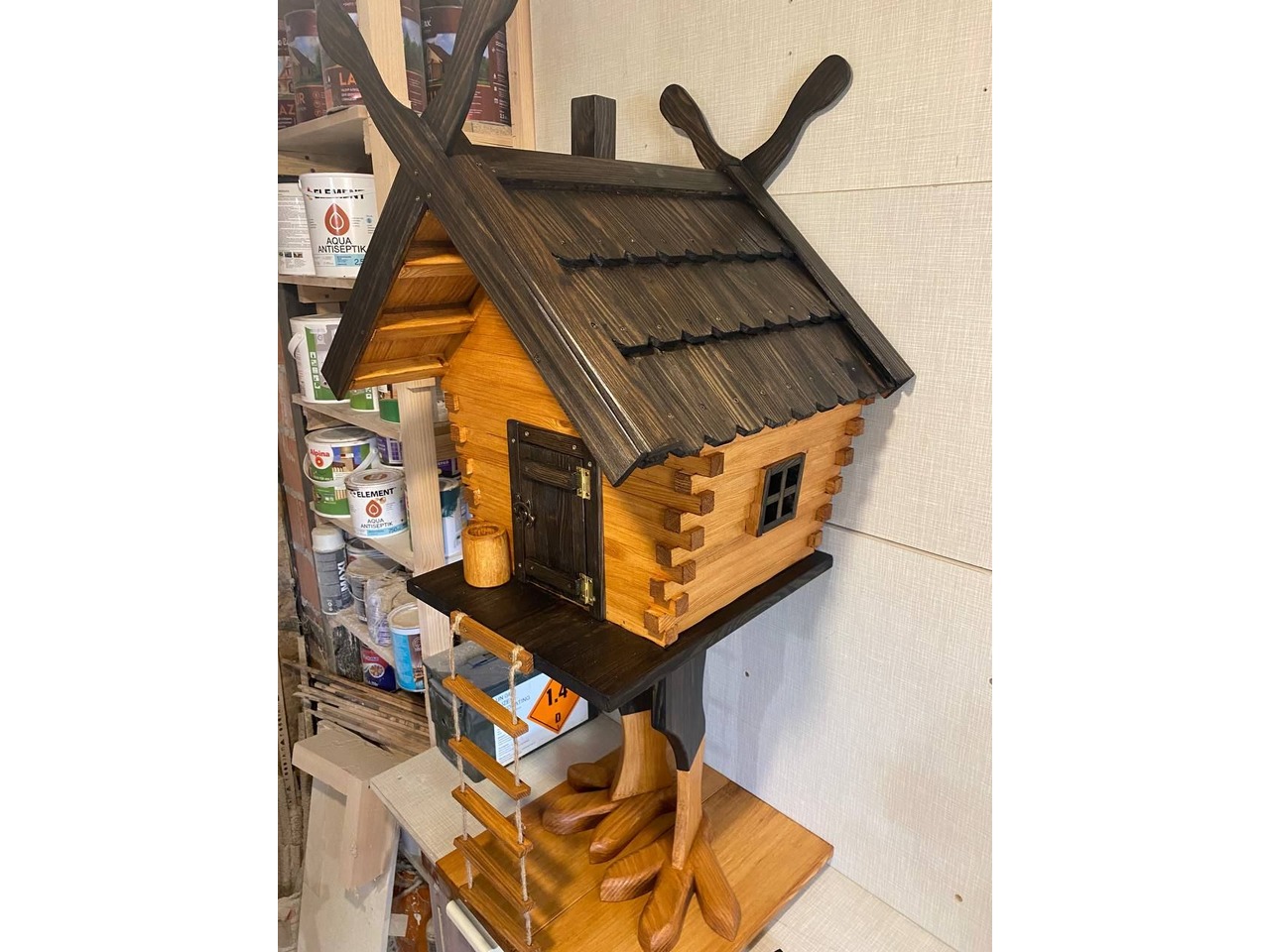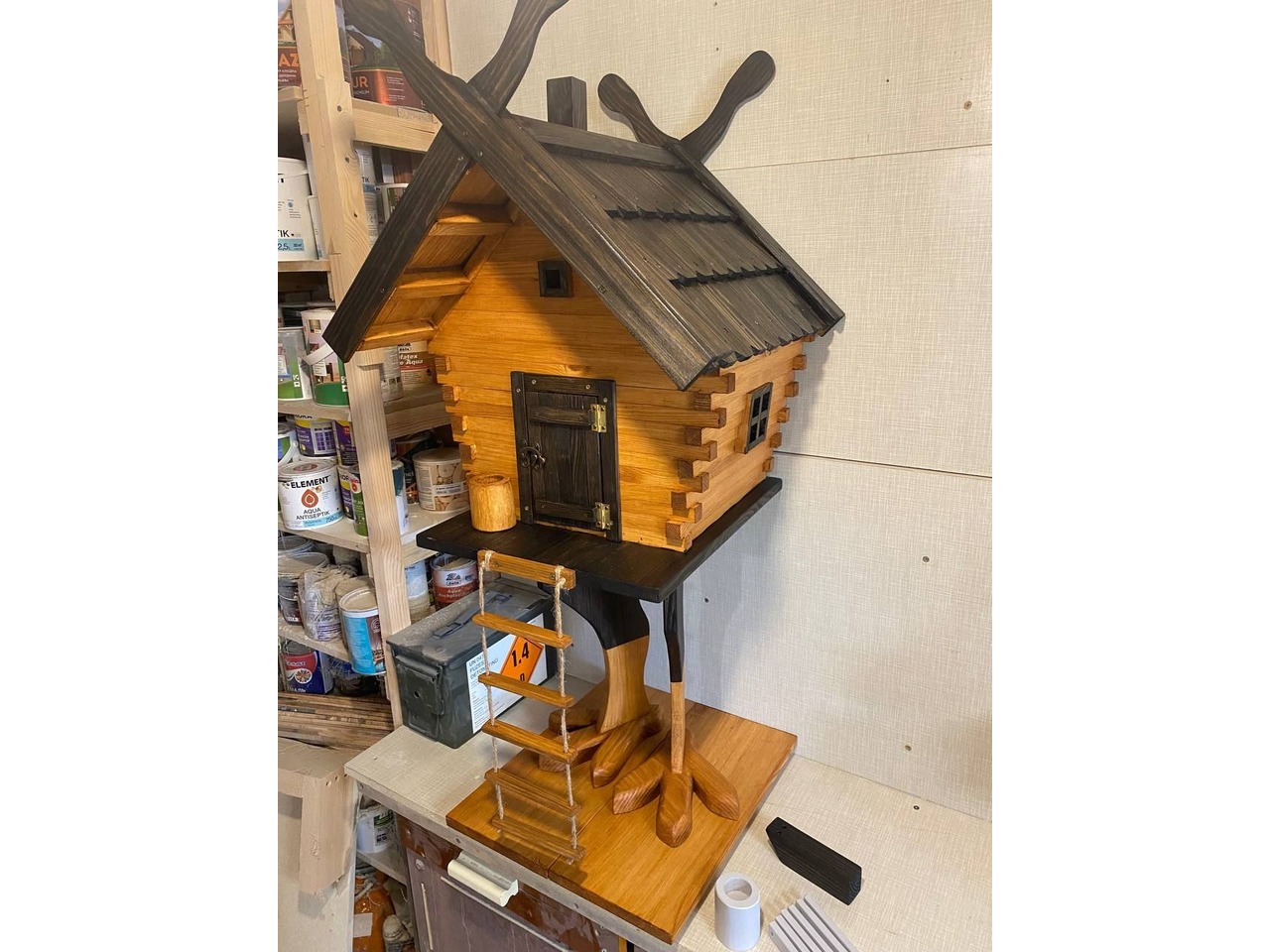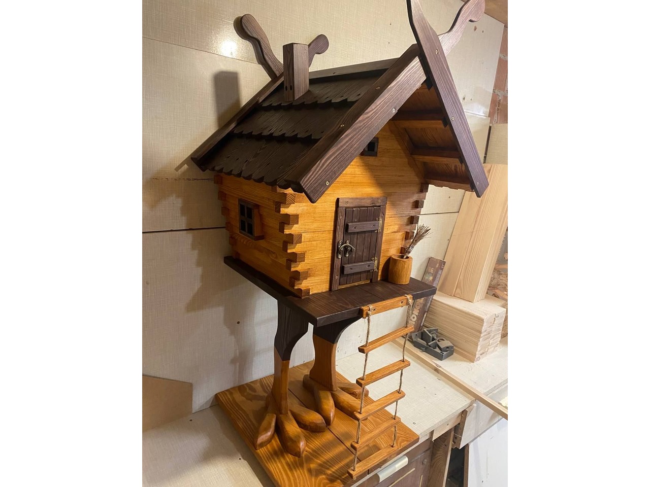 Хатинка на курячих ніжках 2-1Казковий елемент декору - дерев’яна хатинка на курячих ніжках. Створена вручну з натуральної деревини. Це оригінальний декоративний акцент, який гармонійно впишеться у сад, подвір’я, фотозону чи тематичний простір для дорослих. Брусочки, з яких зроблені стіни хатинки, - тонкіші і дах зроблений із черепичок.