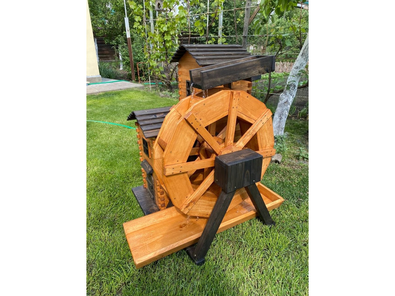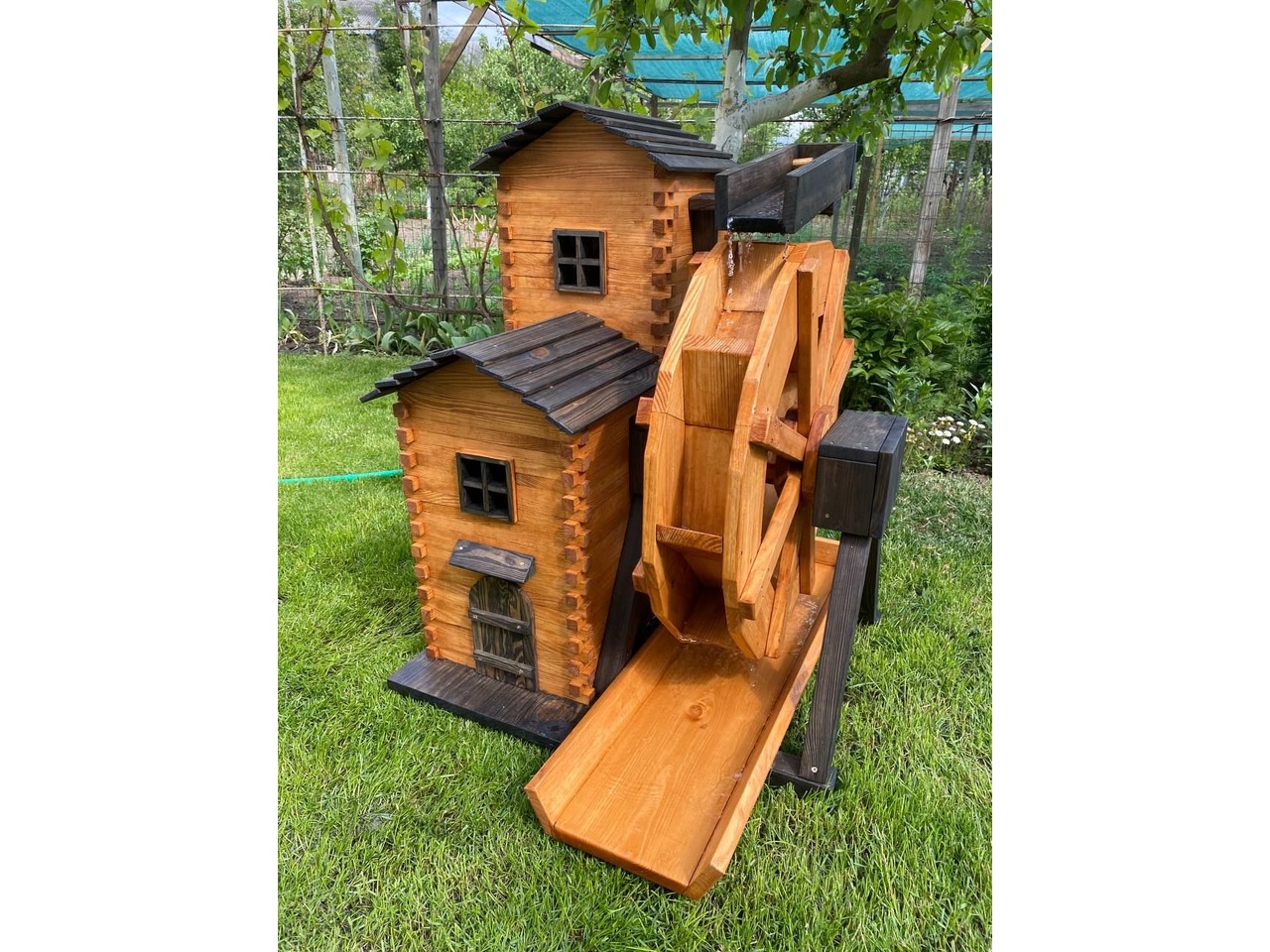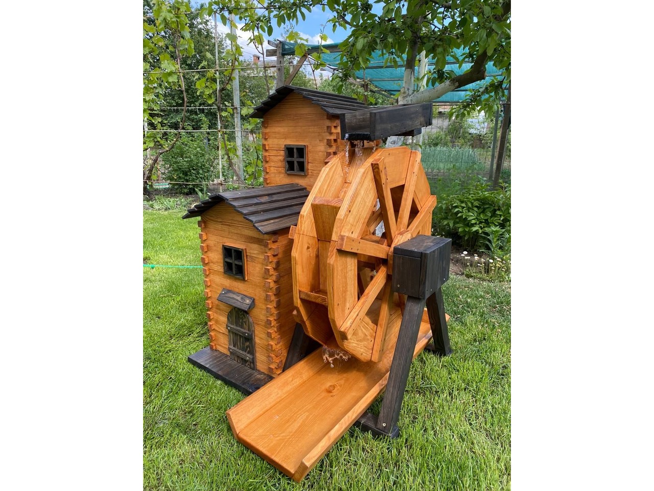 Продам декоративний водяний млин ручної роботи, виготовлений із сосни та покритий акваантисептиком на водній основі (кольори Венге та Тік).Млин повністю функціональний: вода подається по трубці на верхній жолоб, стікає на колесо, яке крутиться на підшипниках, і повертається у водойму. Можна поставити насос і зробити замкнений круг.