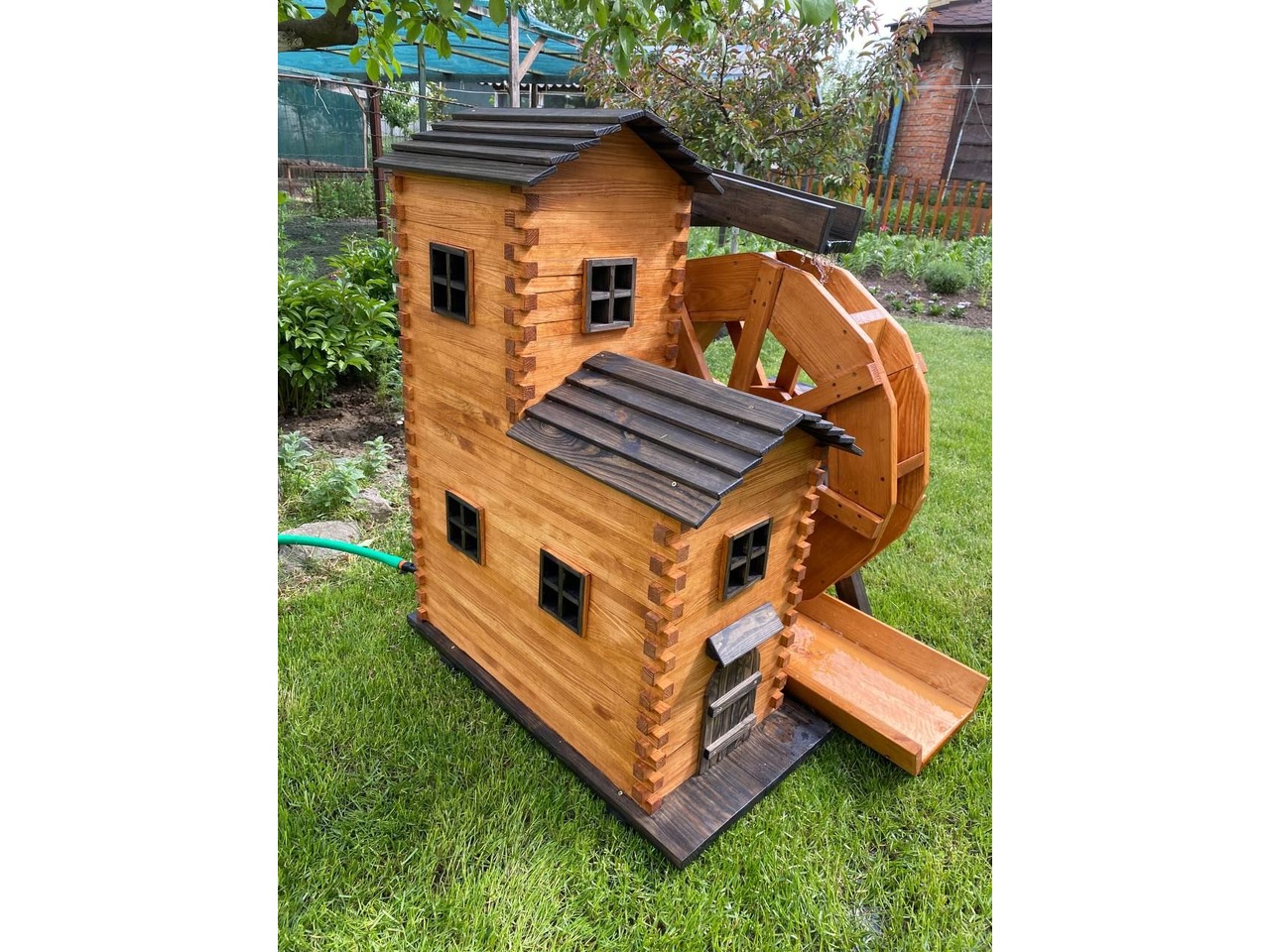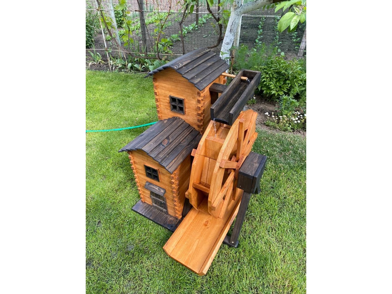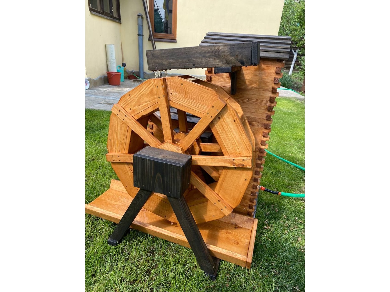 Продам декоративний водяний млин ручної роботи, виготовлений із сосни та покритий акваантисептиком на водній основі (кольори Венге та Тік).Млин повністю функціональний: вода подається по трубці на верхній жолоб, стікає на колесо, яке крутиться на підшипниках, і повертається у водойму. Можна поставити насос і зробити замкнений круг.