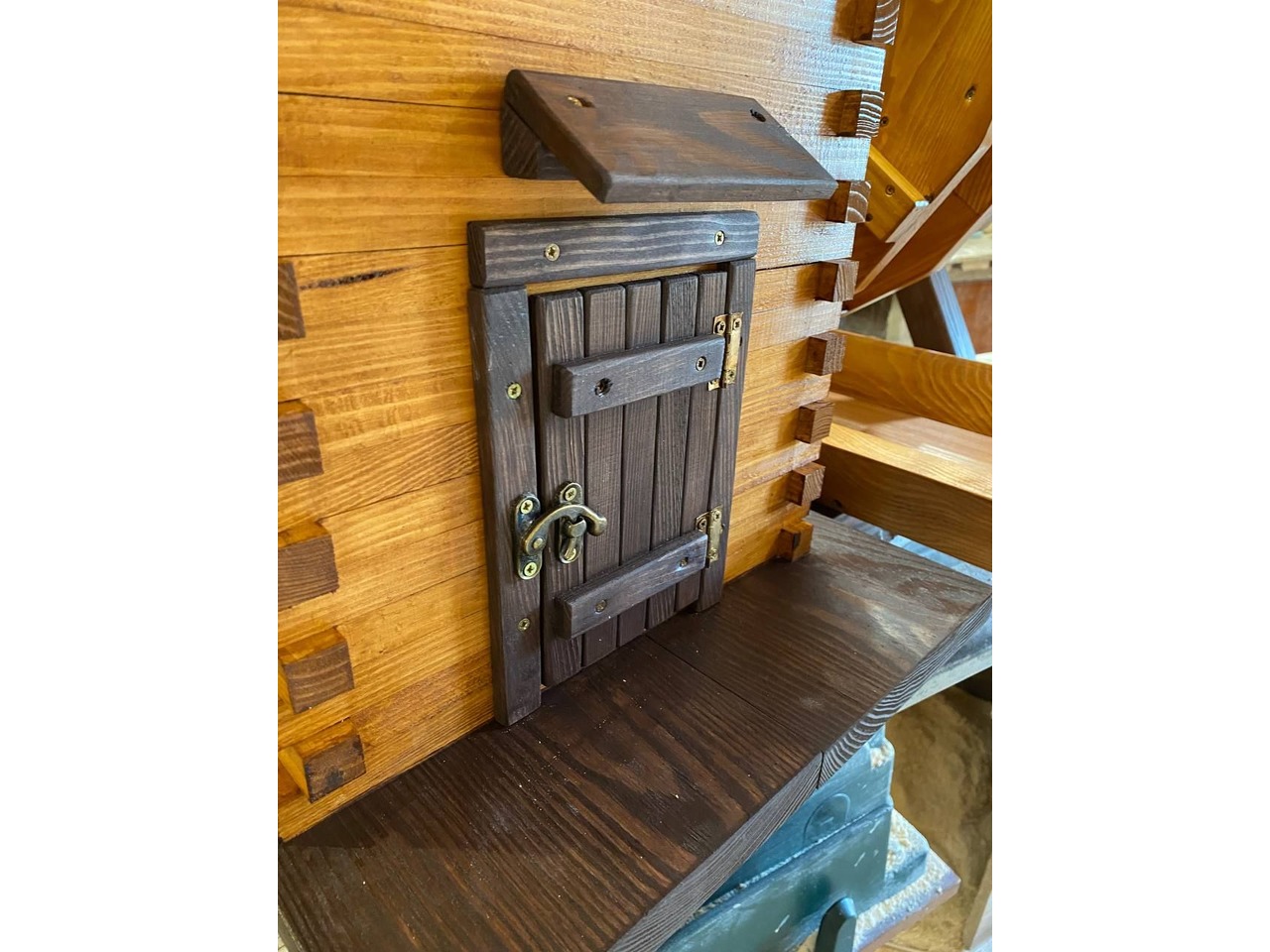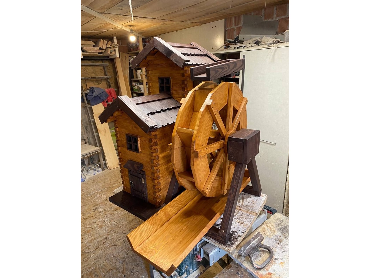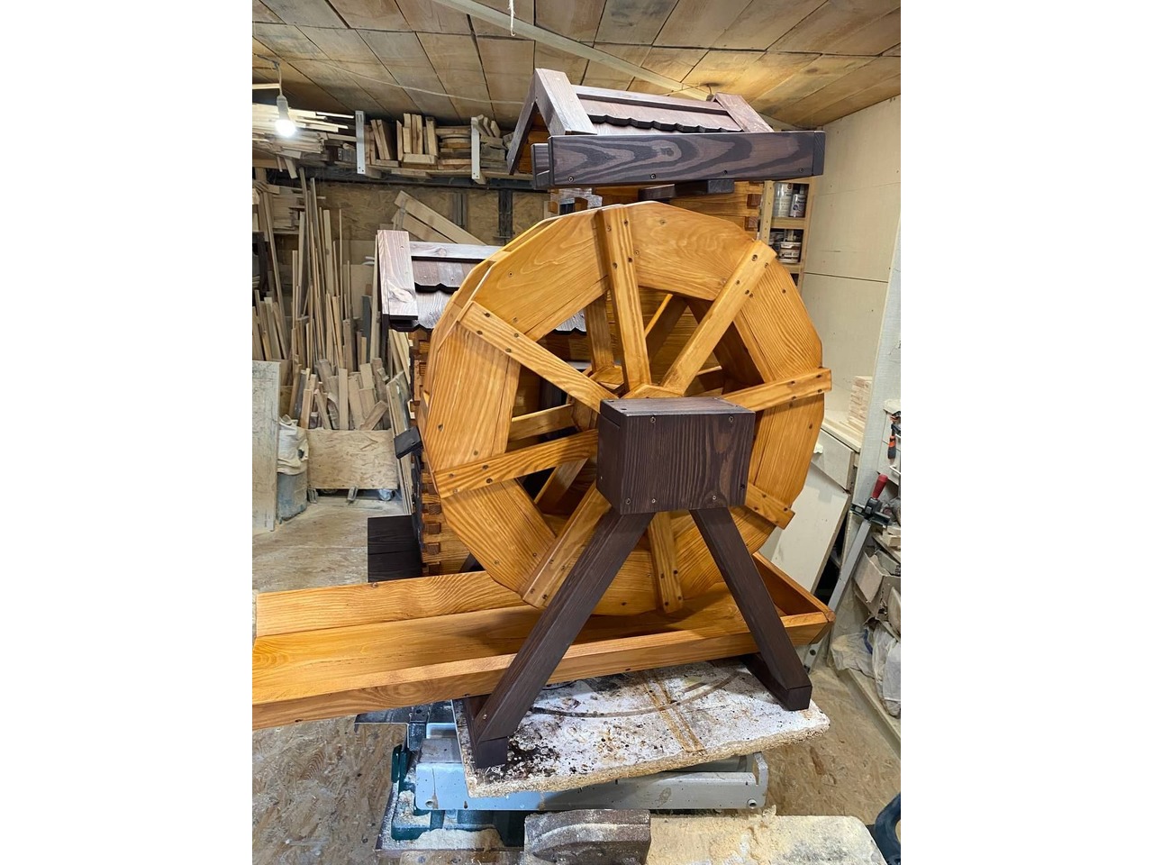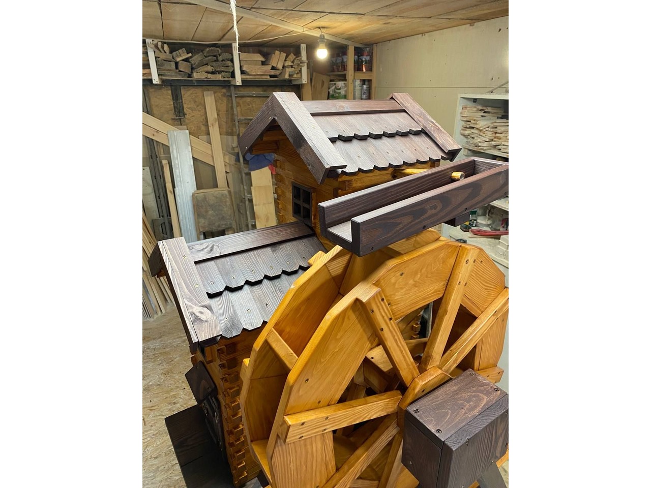 Пропоную декоративний водяний млин №2, виготовлений із сосни та покритий водним акваантисептиком (Венге + Тік).Цей млин має покращений дизайн:
