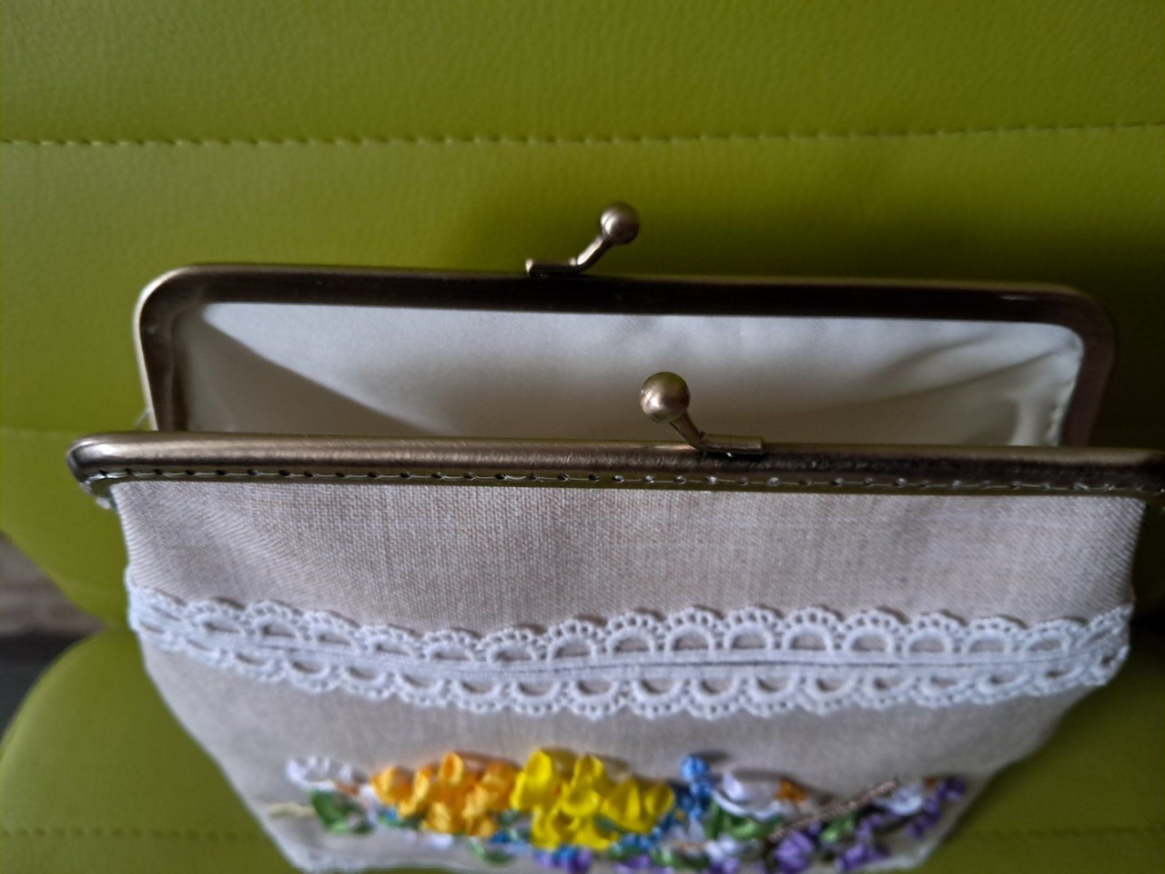 Косметичка виготовлена з бежевого льону з фермуаром, прикрашена вишивкою стрічками і мереживом, підкладка атласна ущільнена дублеріном. Такий подарунок мамі, своїй дружині або свекрусі - зробить жінку щасливою на довгий час!!!Дарю чудную вещичку,