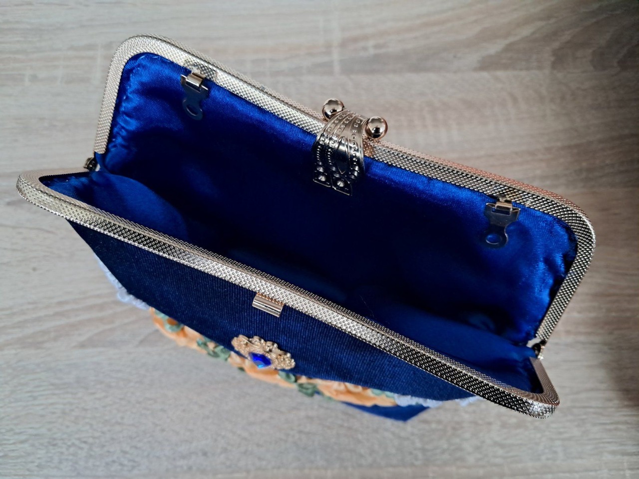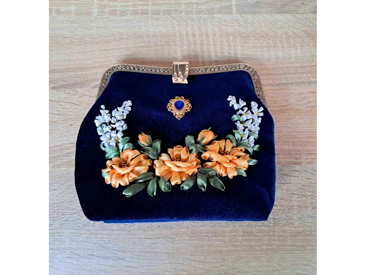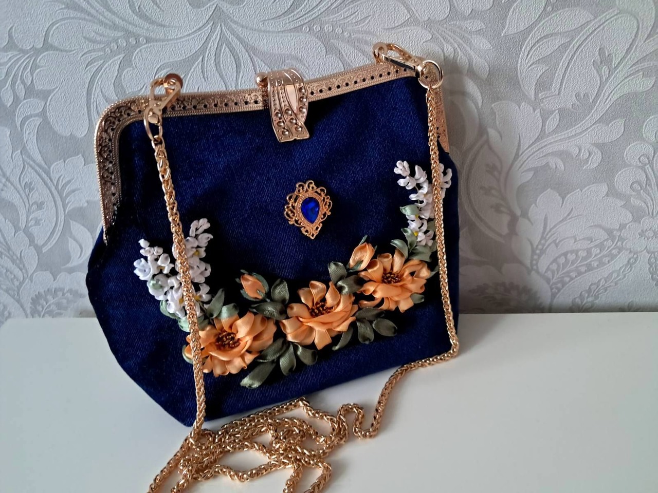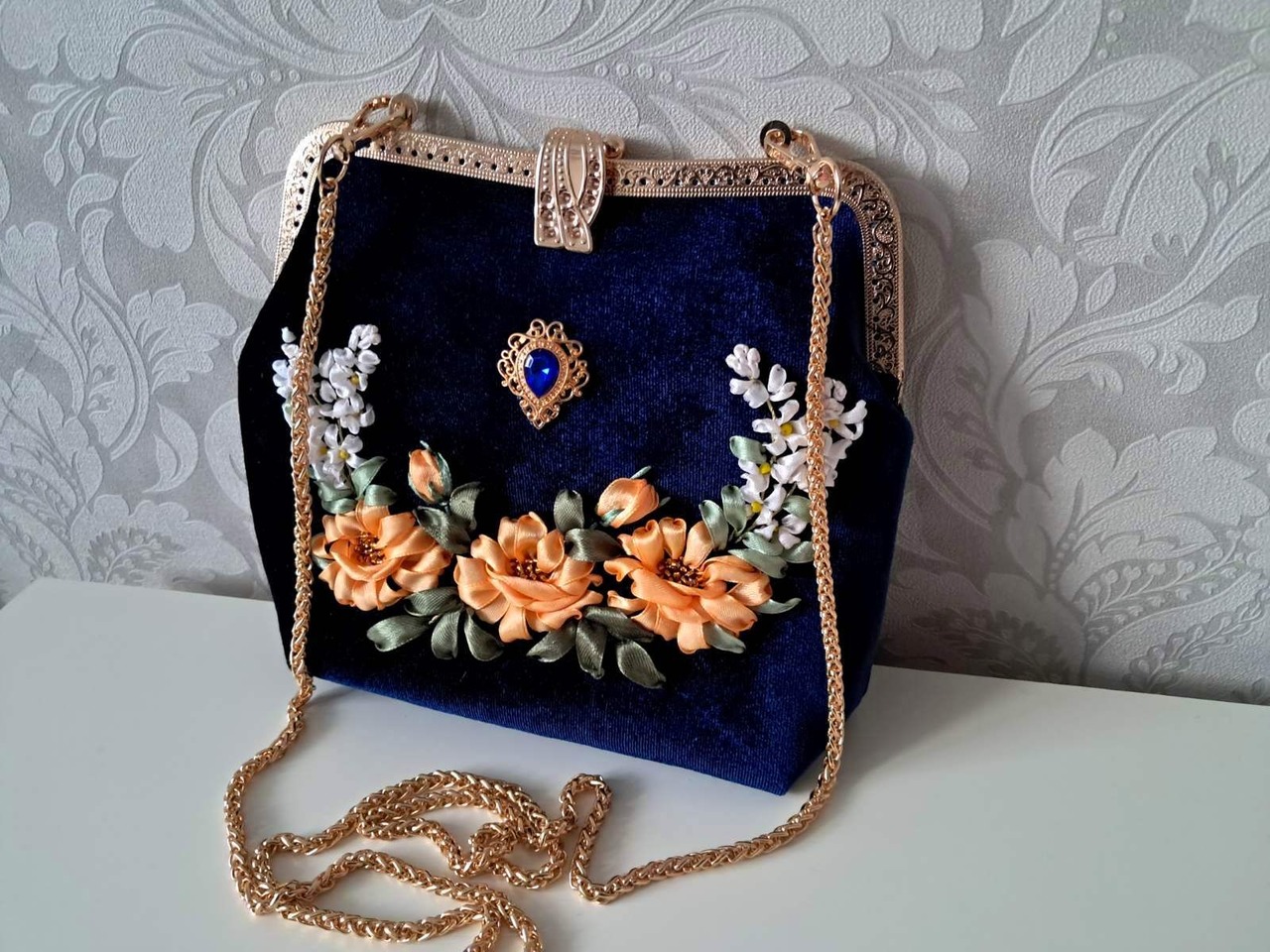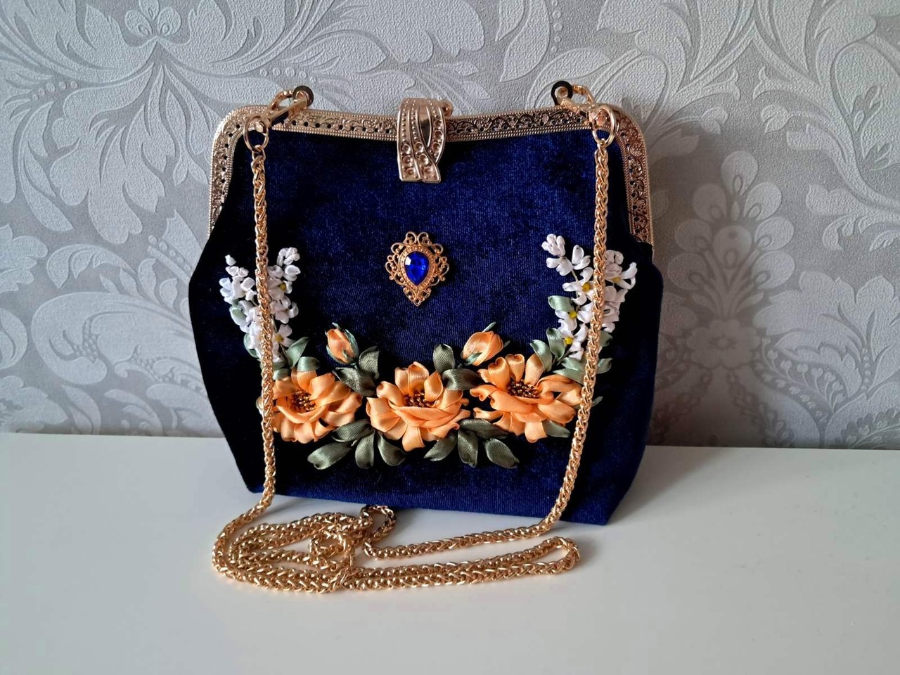 Сумочка виготовлена з велюру синього кольору, з ексклюзивним фермуаром, прикрашена вишивкою стрічками, ущільнена дублеріном, підкладка атласна. Такий аксесуар будь-якій дівчині і жінці припаде до смаку. Стильно, красиво, оригінально!Не шукайте банальний фабричний подарунок!! Ручна робота - в єдиному екземплярі, ваша жінка буде в захваті! Розмір 19*23см