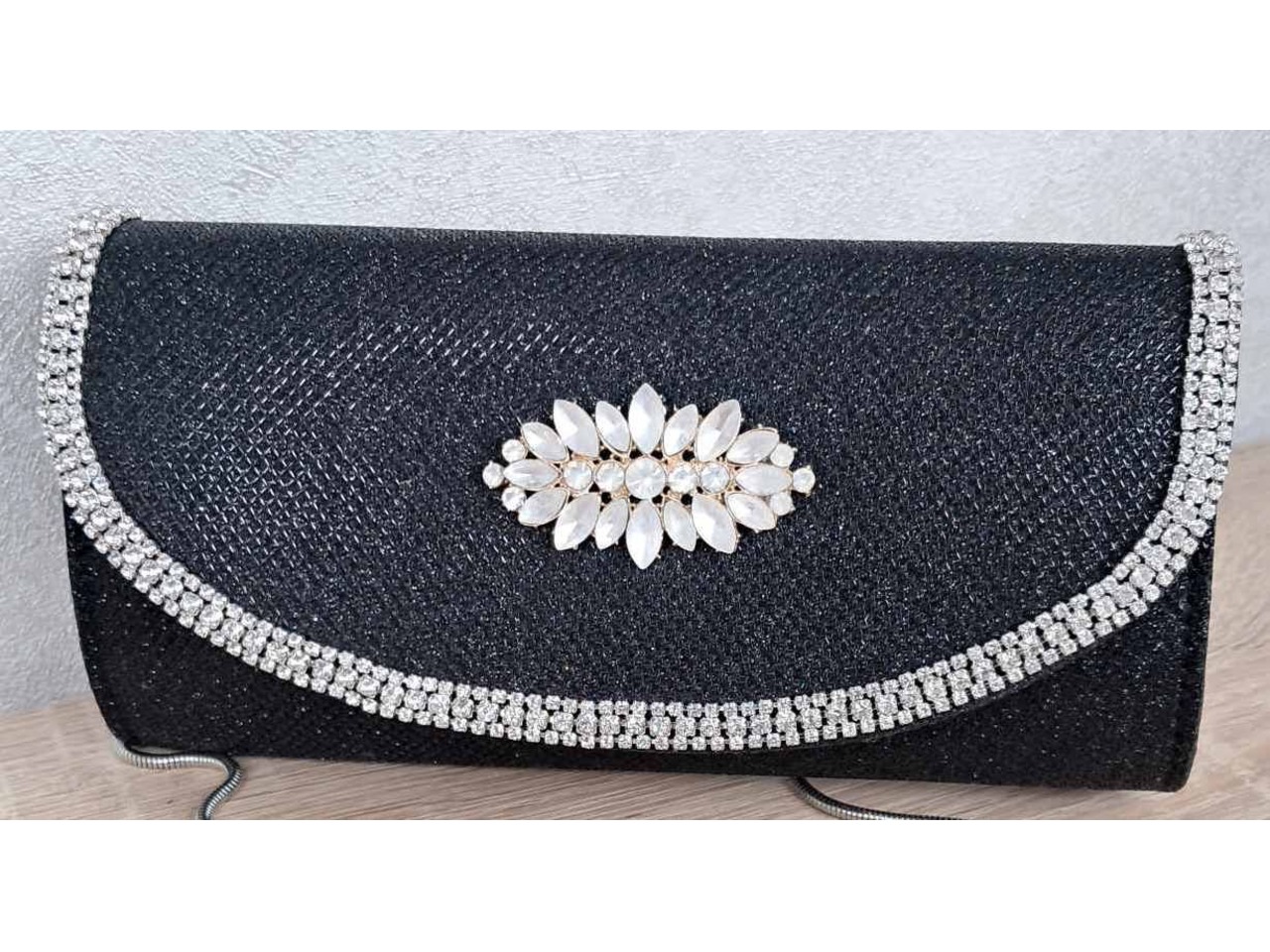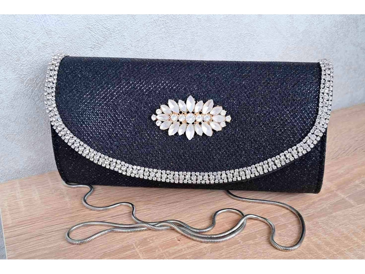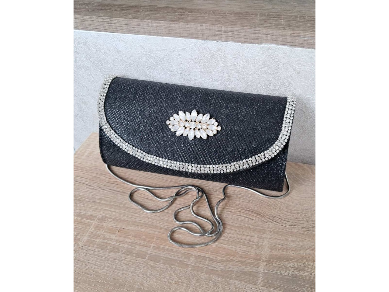 Елегантна жіноча сумочка-клатч чорного кольору, з ланцюжком через плече та магнітним замком. Призначена для виходу в театр, кіно, офіційних вечірок, універсальна річ, що підходить до будь-якого одягу. Стильний дизайн, оксамитова тканина, прикрашений патч-брошкою срібного кольору та стразовою стрічкою. Всередині невелика кишенька, містка, розмір - 12*20см.