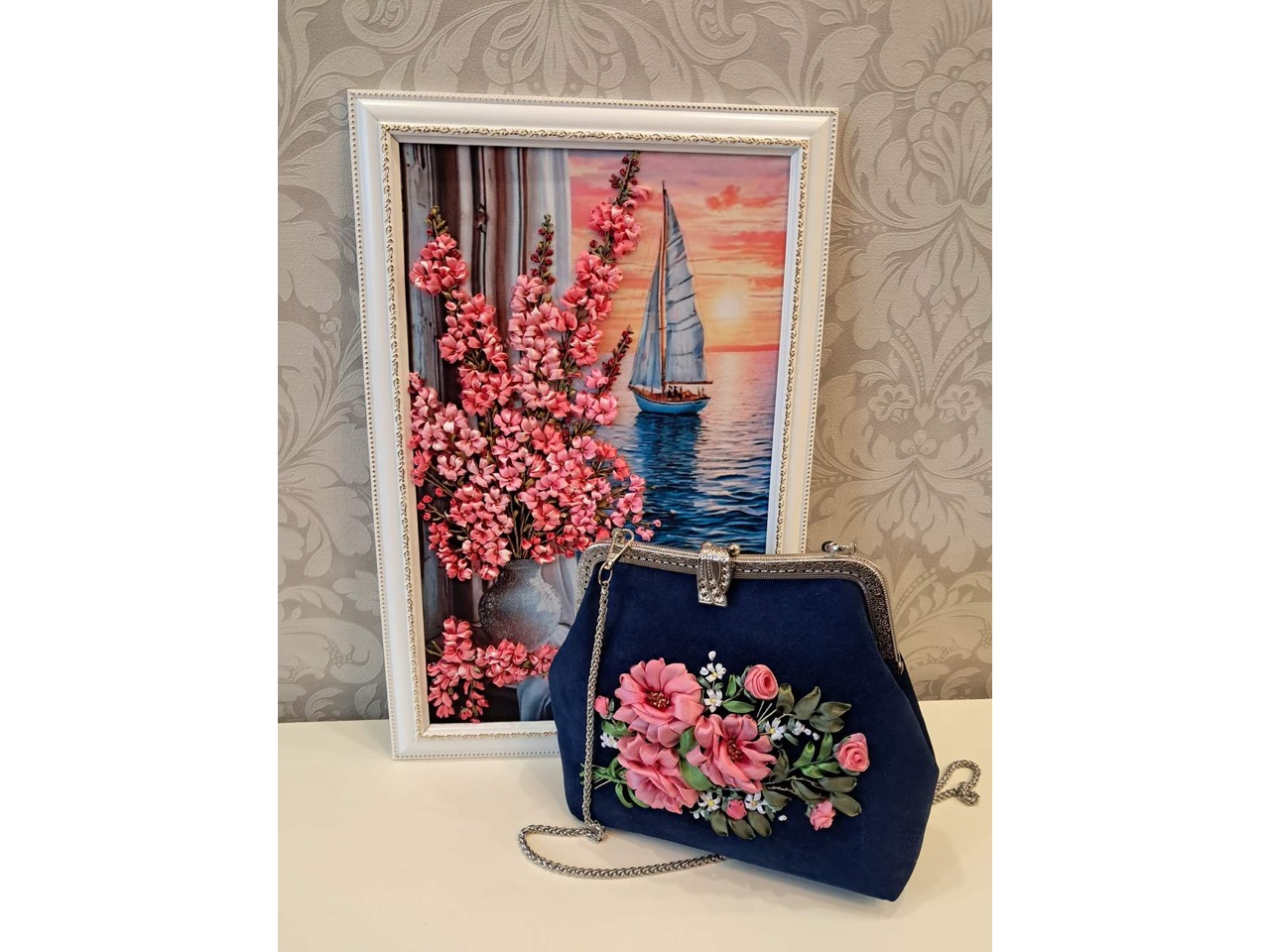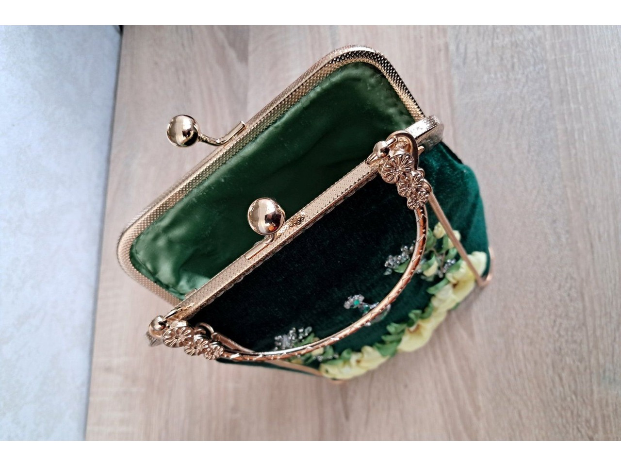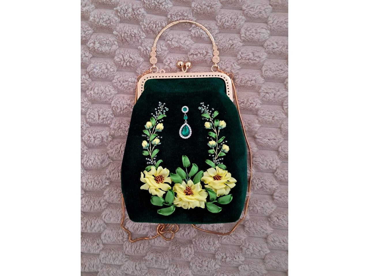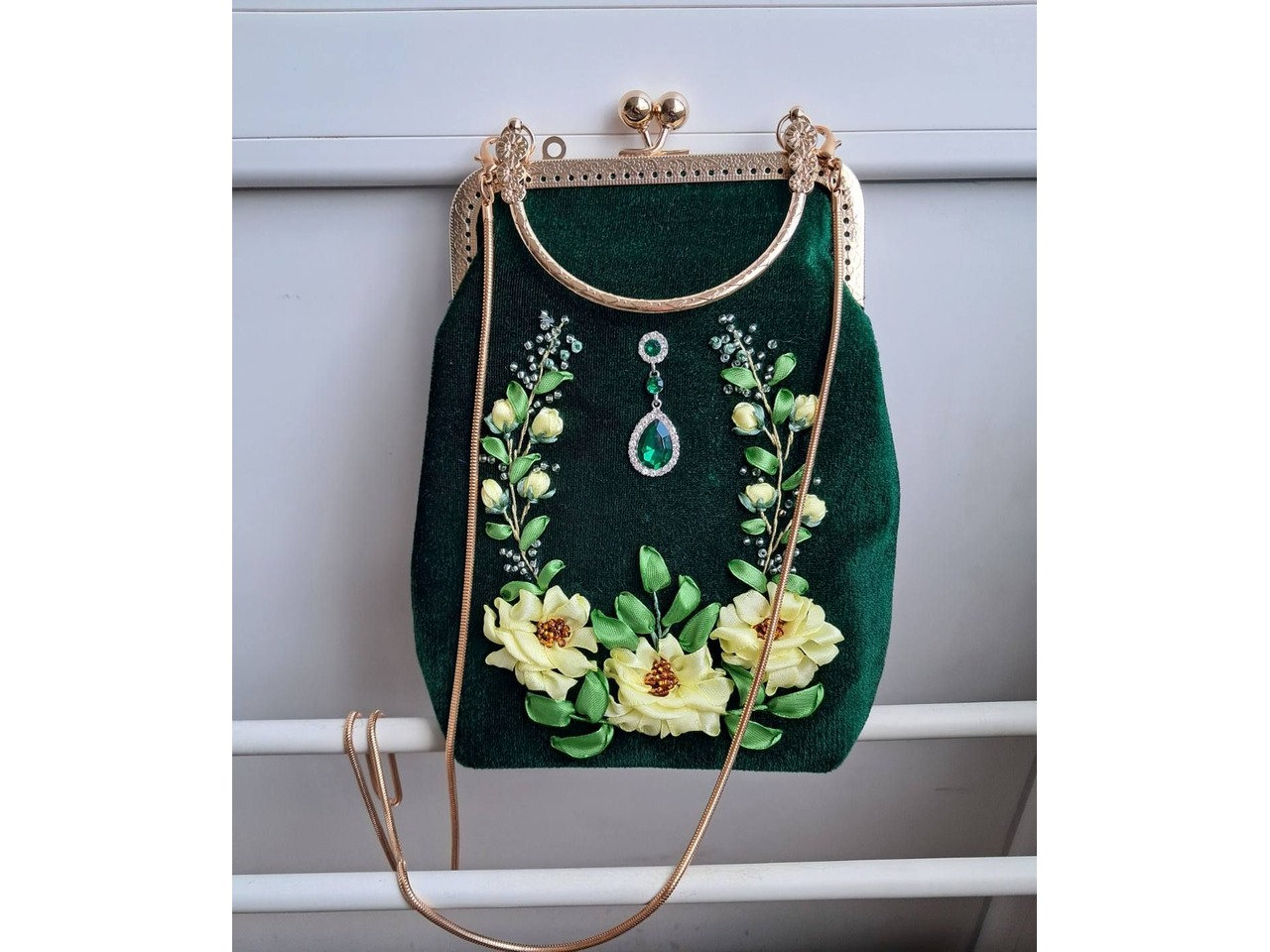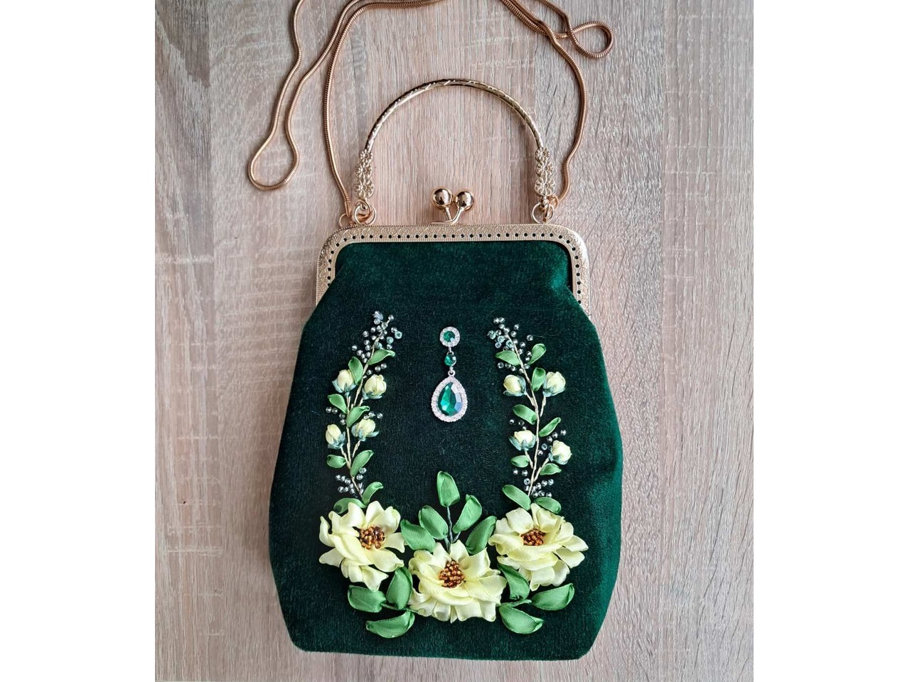 Сумочка виконана з велюру смарагдового кольору, ущільнена дубліном, добре тримає форму, з фермуаром, на ланцюжку, прикрашена вишивкою стрічками, підкладка атласна. Декорована яскравою прикрасою.Такий аксесуар будь-якій дівчині і жінці припаде до смаку. Стильно, красиво, оригінально! Телефон, парфуми, різні дрібнички поміщаються в сумочці.Не шукайте банальний фабричний подарунок!! Ручна робота - в єдиному екземплярі, ваша жінка буде в захваті!