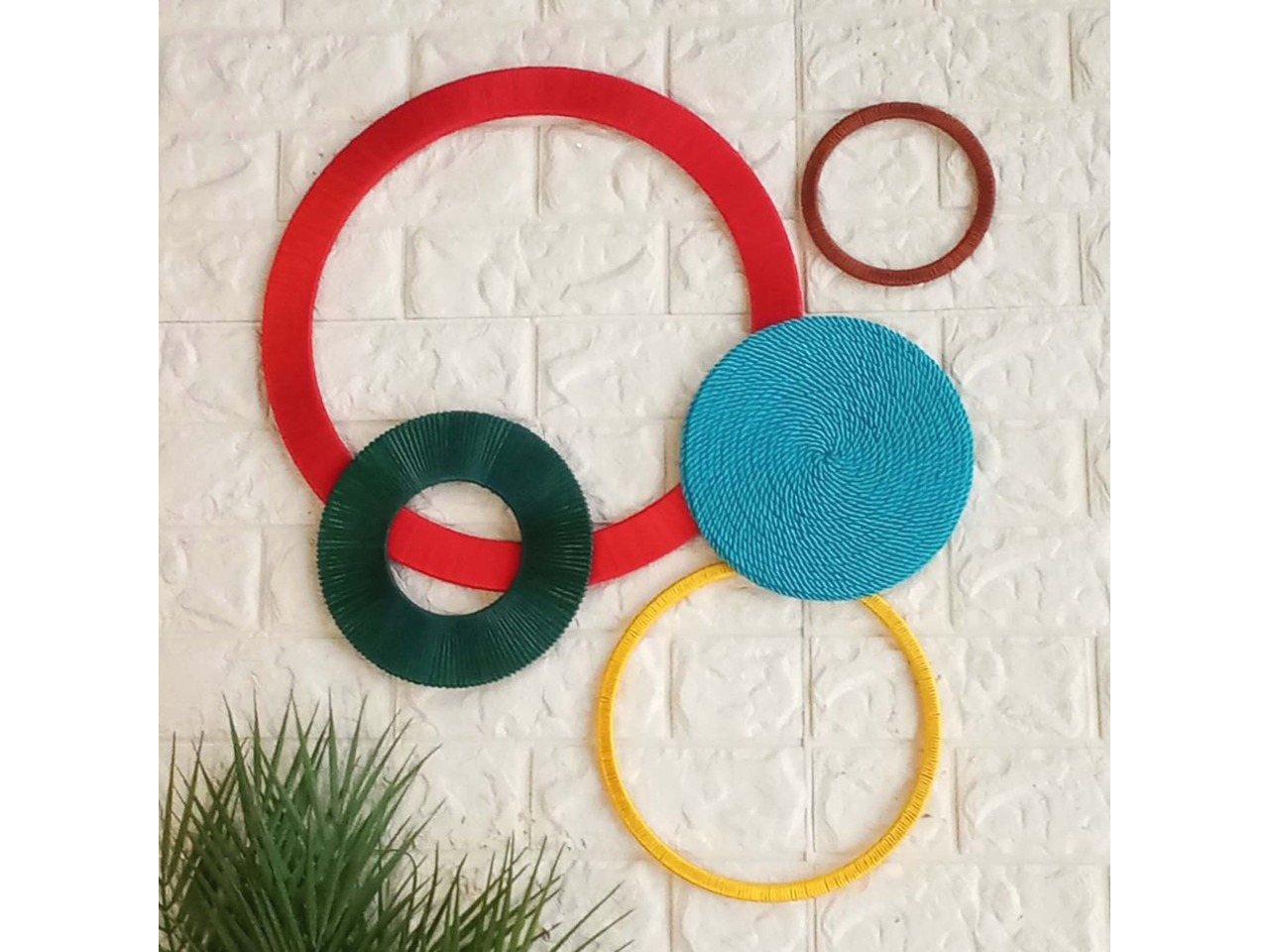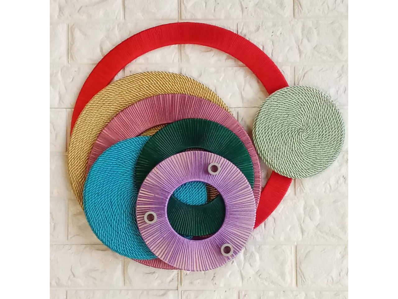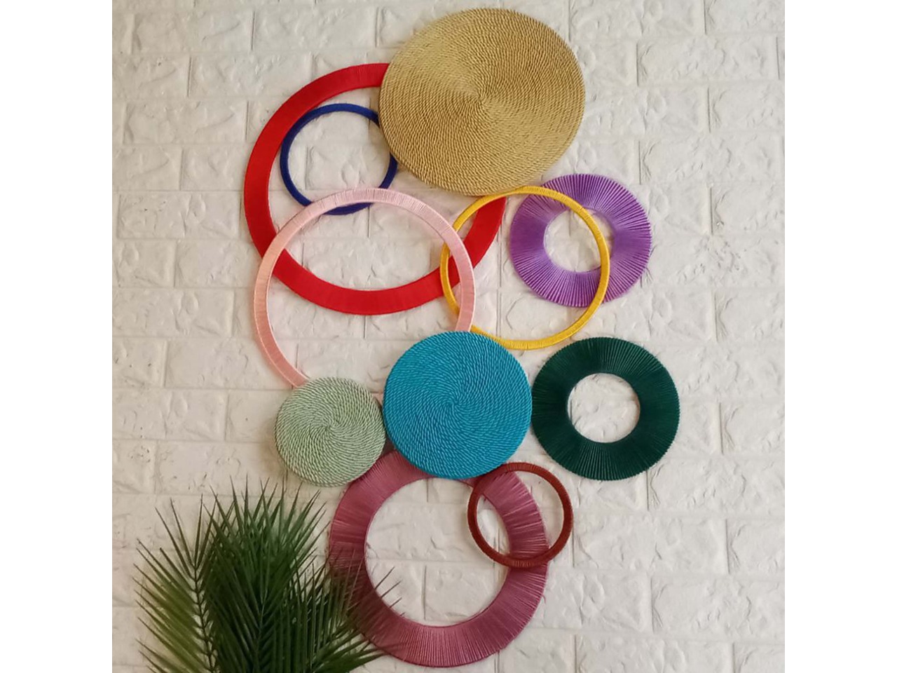 Оригінальний настінний декор ручної роботи з різнокольорових кілець і кругів стане стильним акцентом для будь-якої кімнати чи холу. Легко впишеться у сучасний інтер’єр, додасть кольору та оригінальності вашому простору.Основа кілець – фанера, основа кругів – ДВП.
