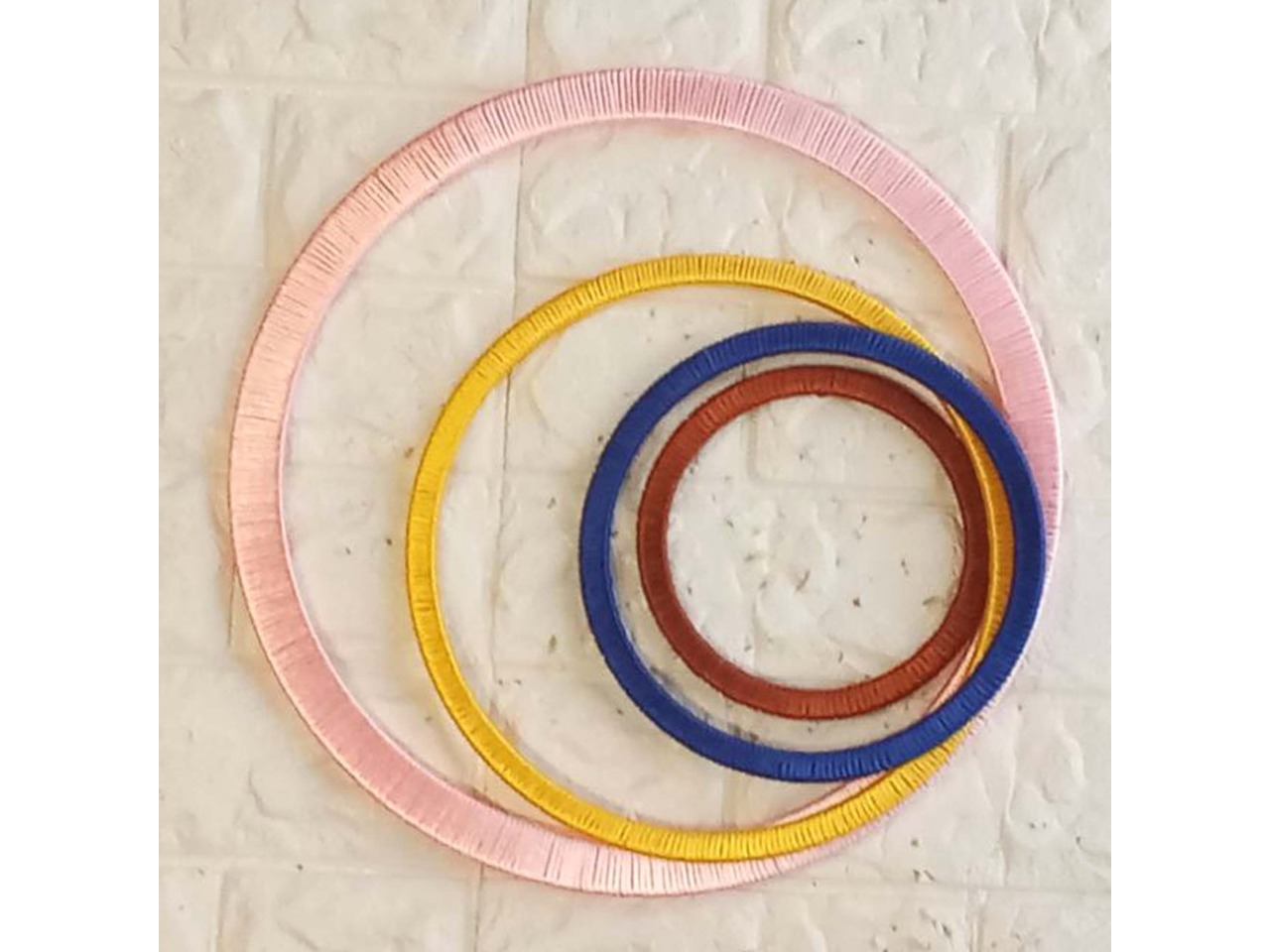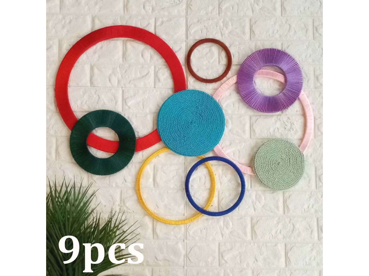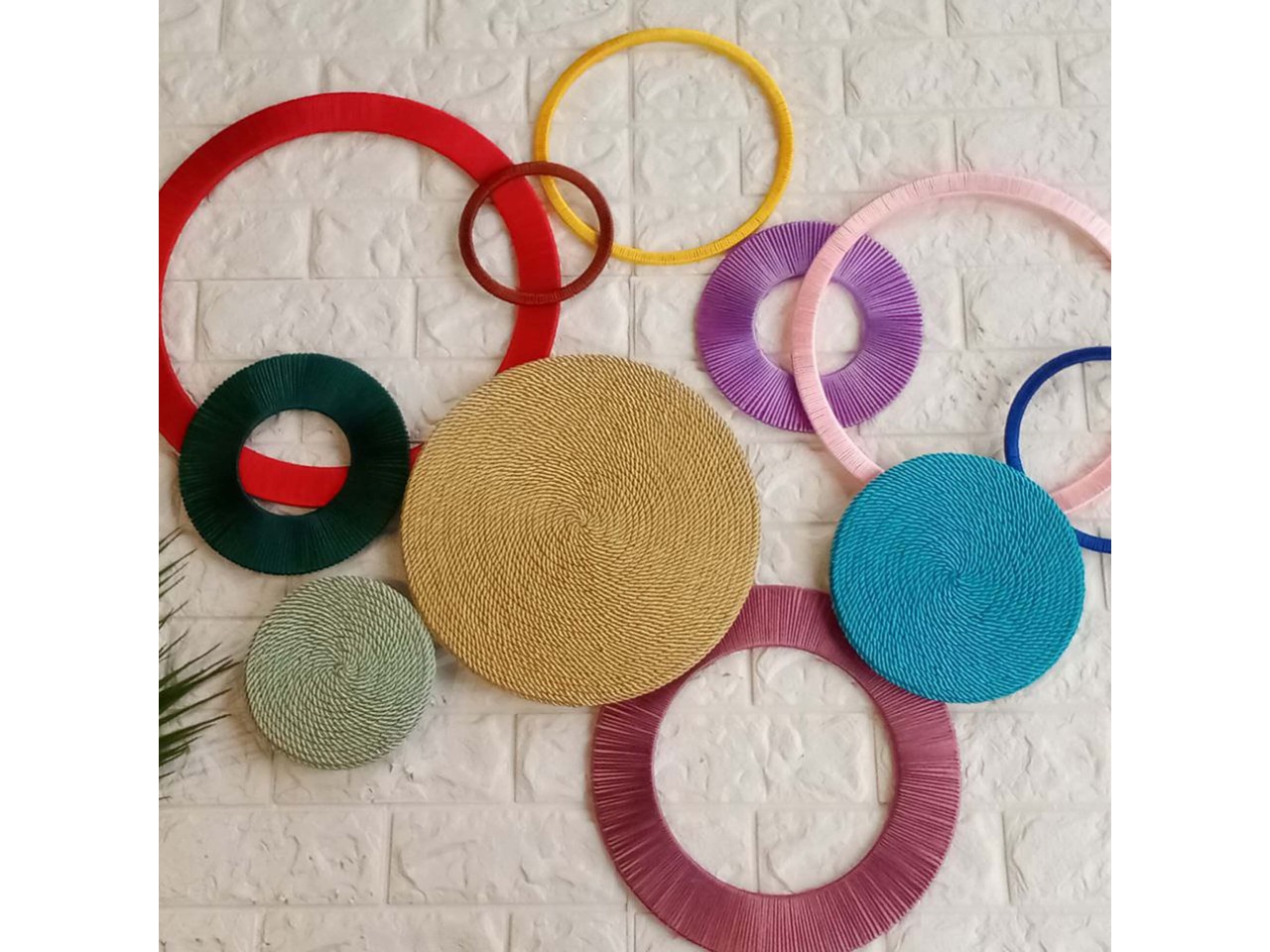 Оригінальний настінний декор ручної роботи з різнокольорових кілець і кругів стане стильним акцентом для будь-якої кімнати чи холу. Легко впишеться у сучасний інтер’єр, додасть кольору та оригінальності вашому простору.Основа кілець – фанера, основа кругів – ДВП.