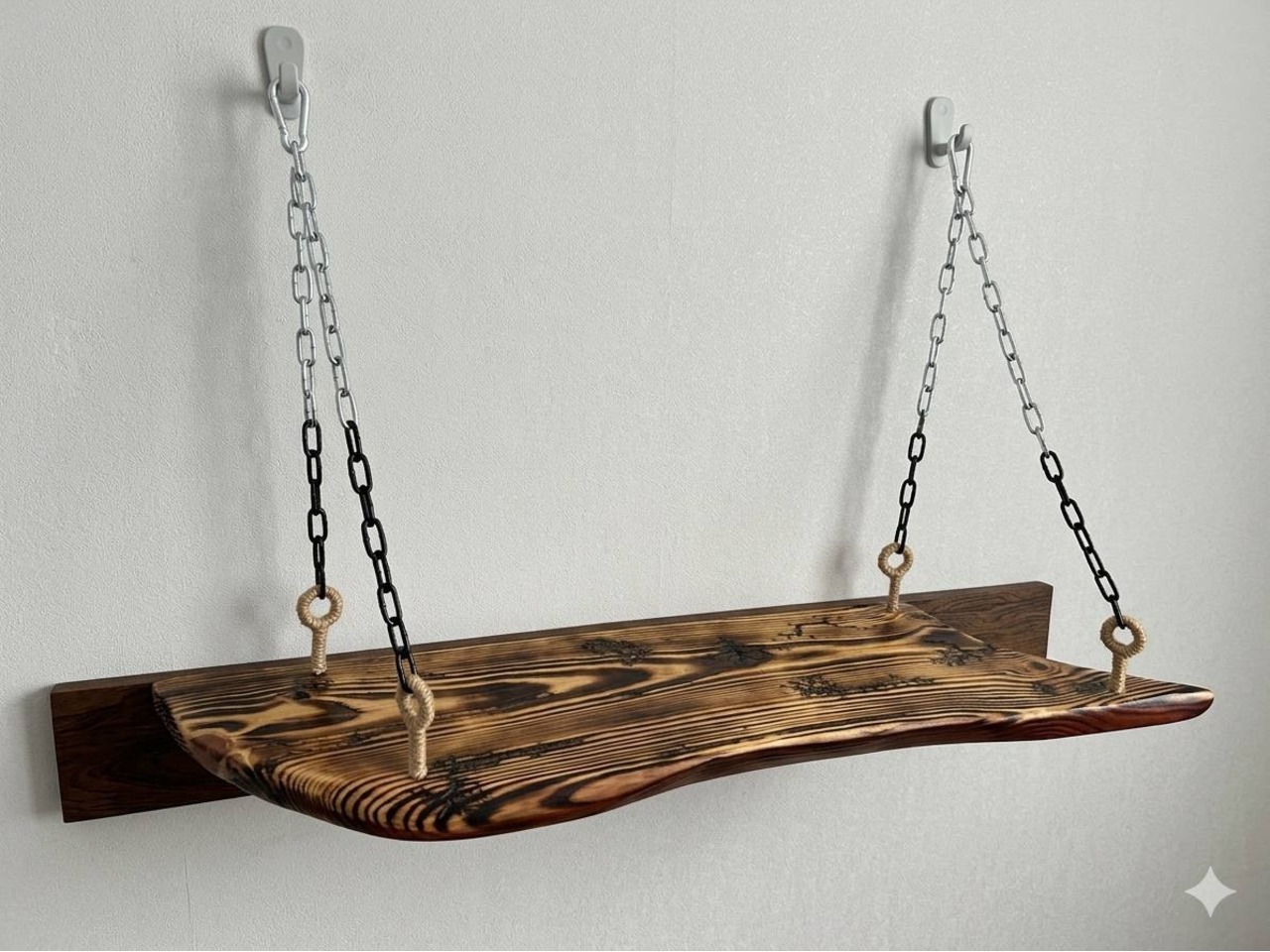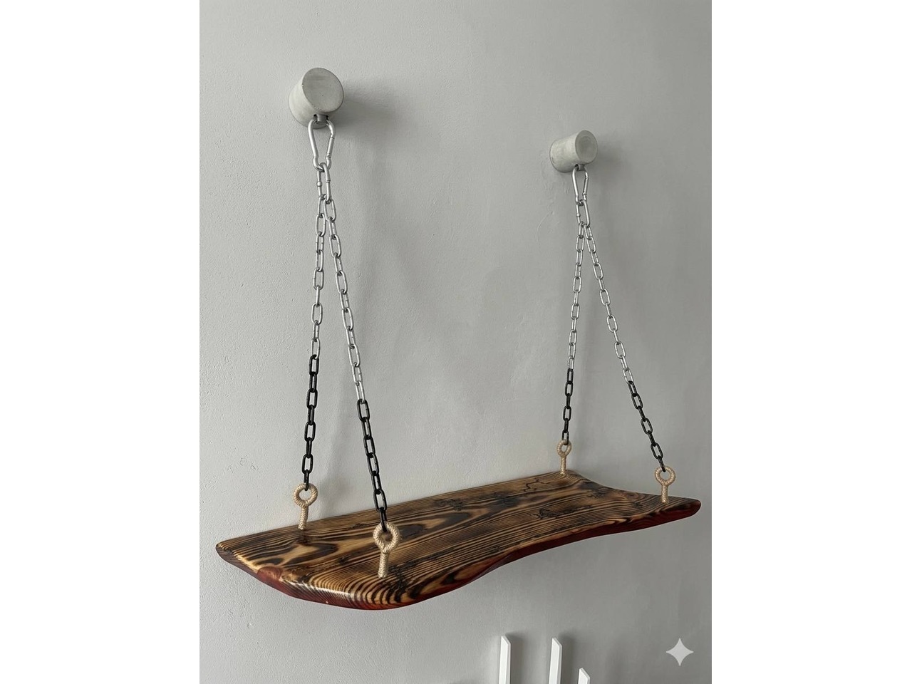 Підвісна полка ручної роботи з обпаленого дерева на ланцюгах