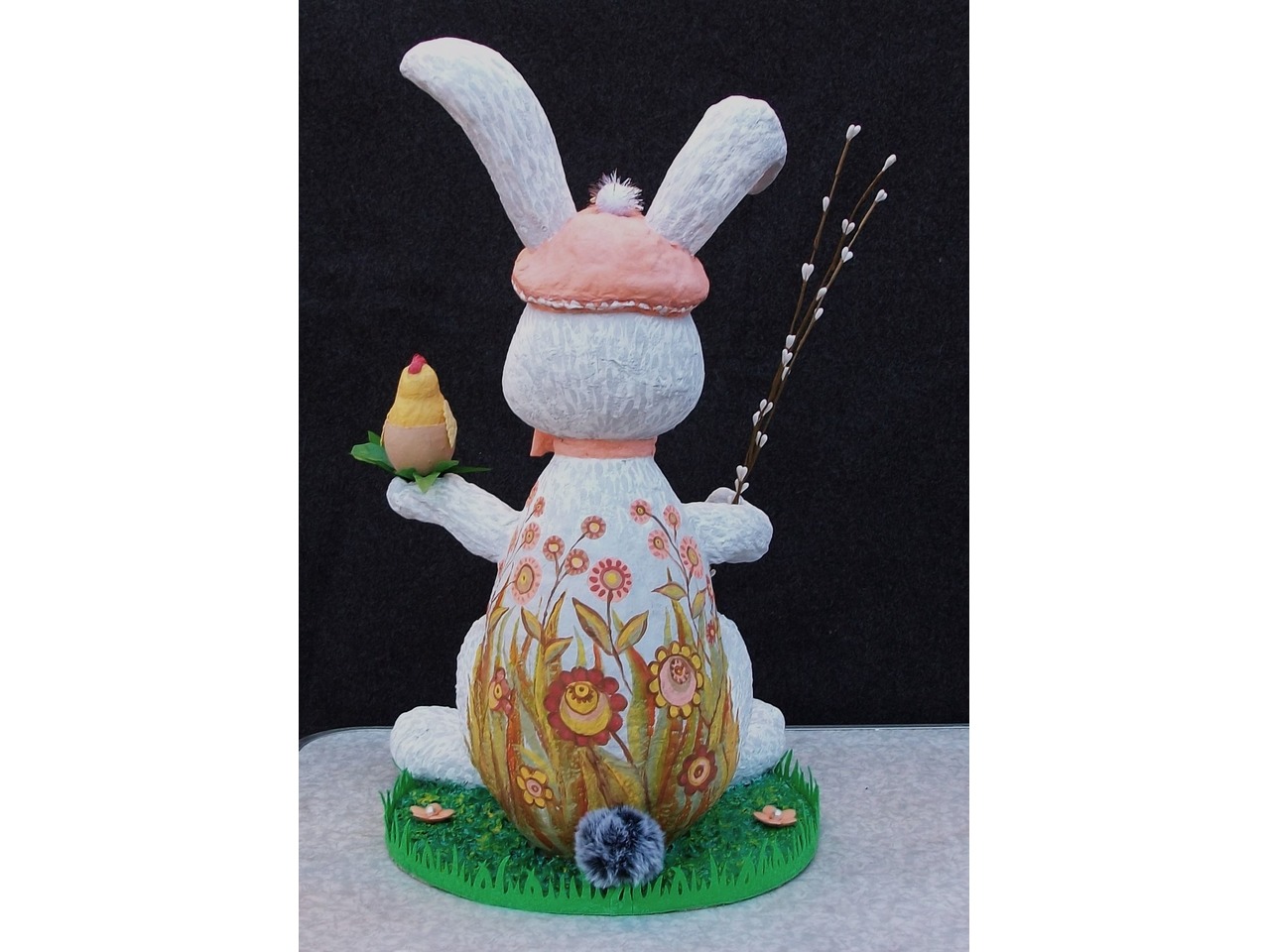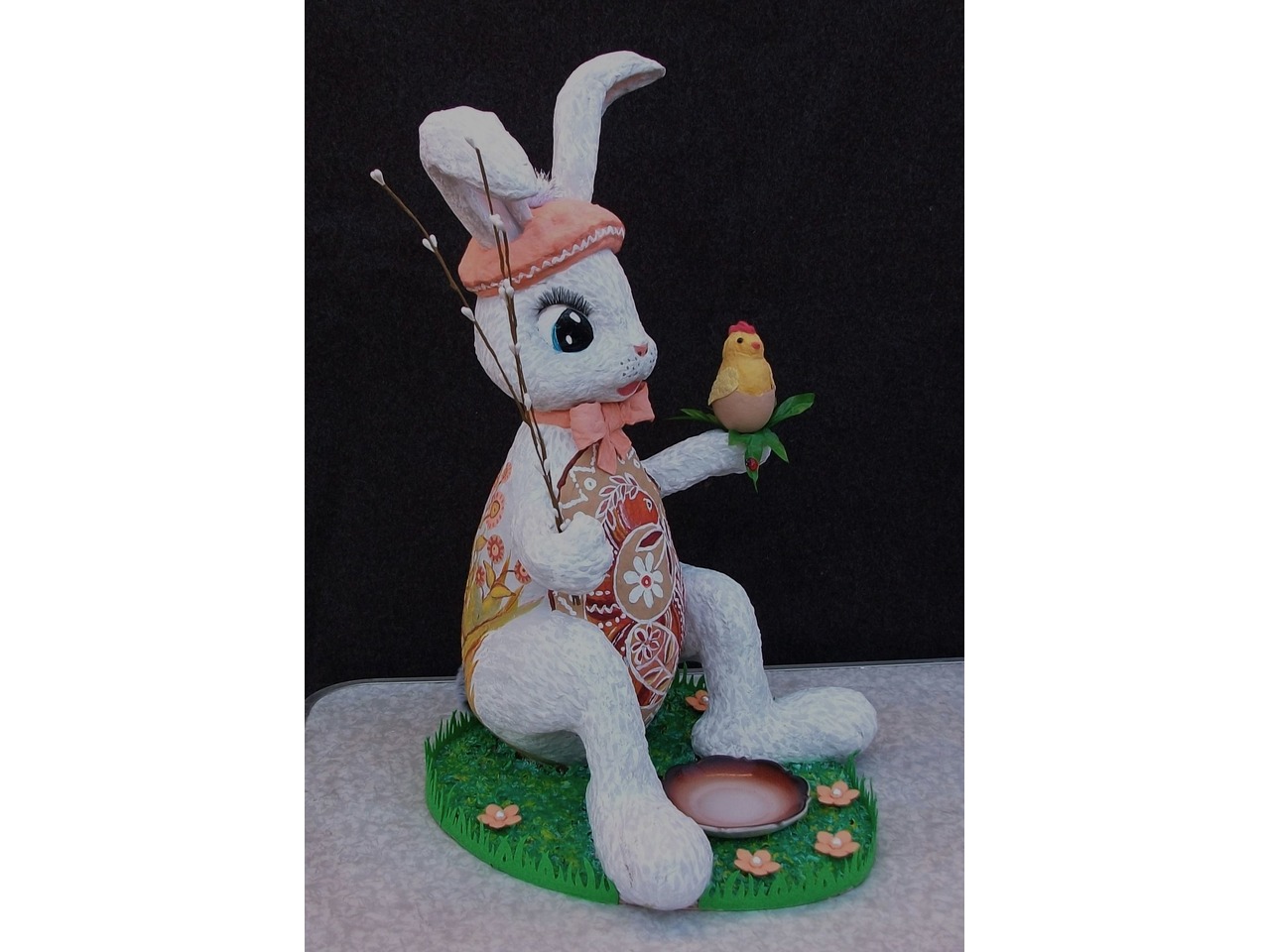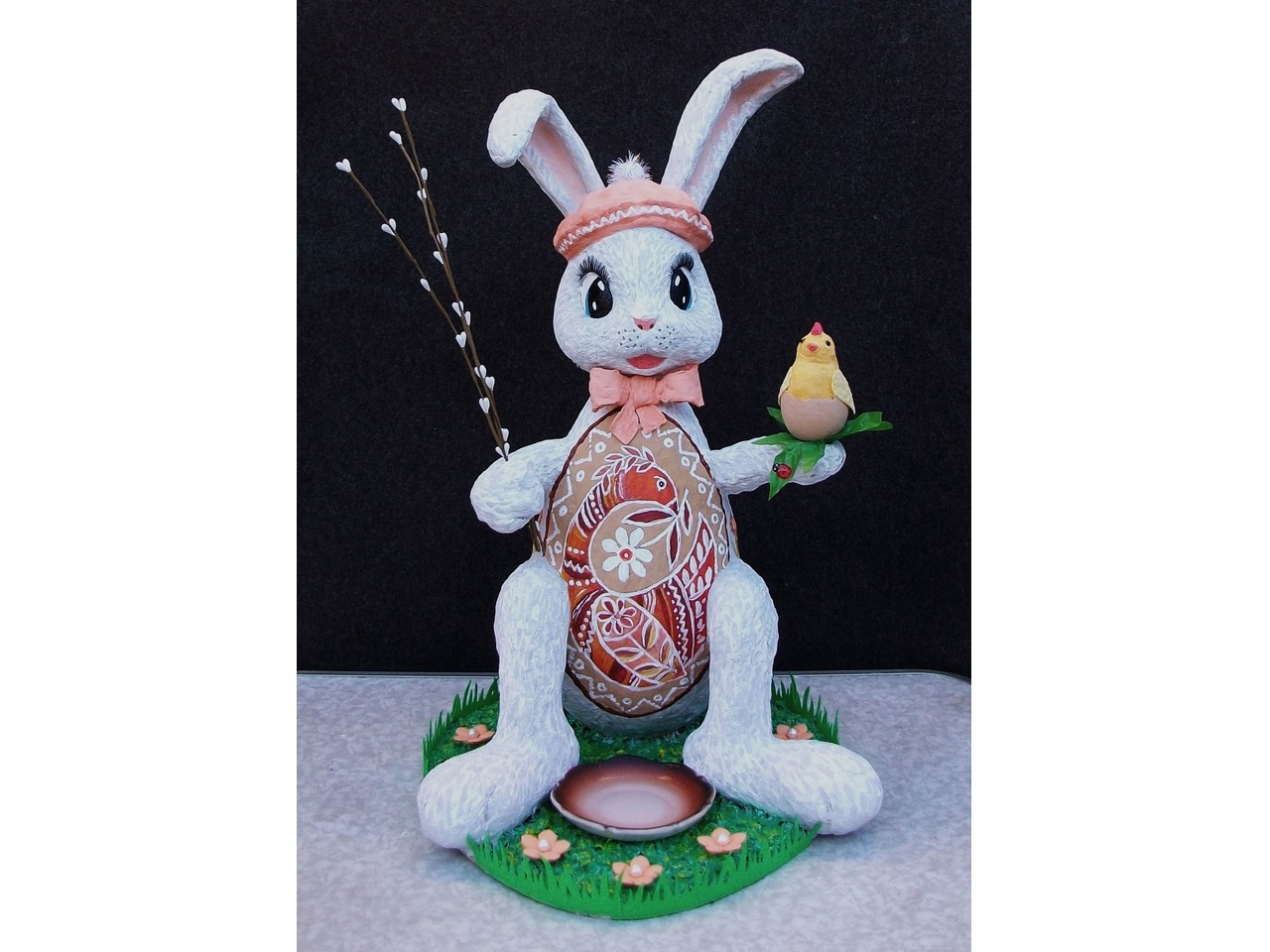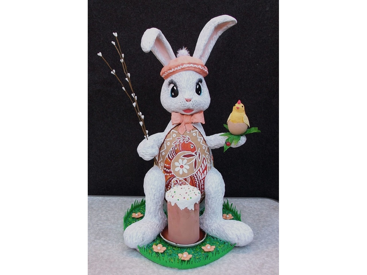 Пасхальний кролик заввишки 50 см, зроблений з вати, на підставці-поляні - ручна робота та ручний розпис. Керамічне блюдце для паски або яєць має діаметр 10 см. Конструкція міцна та стійка.