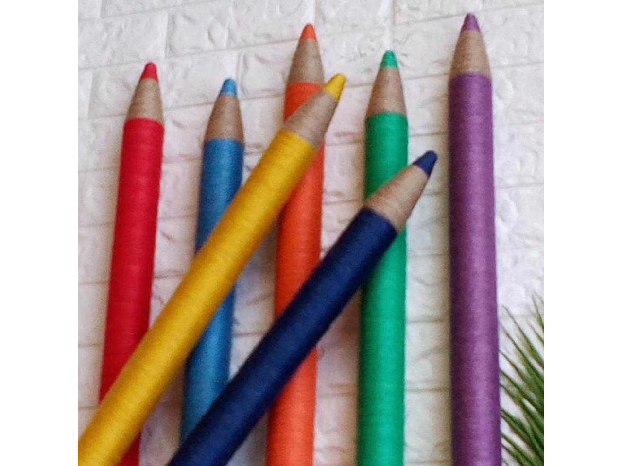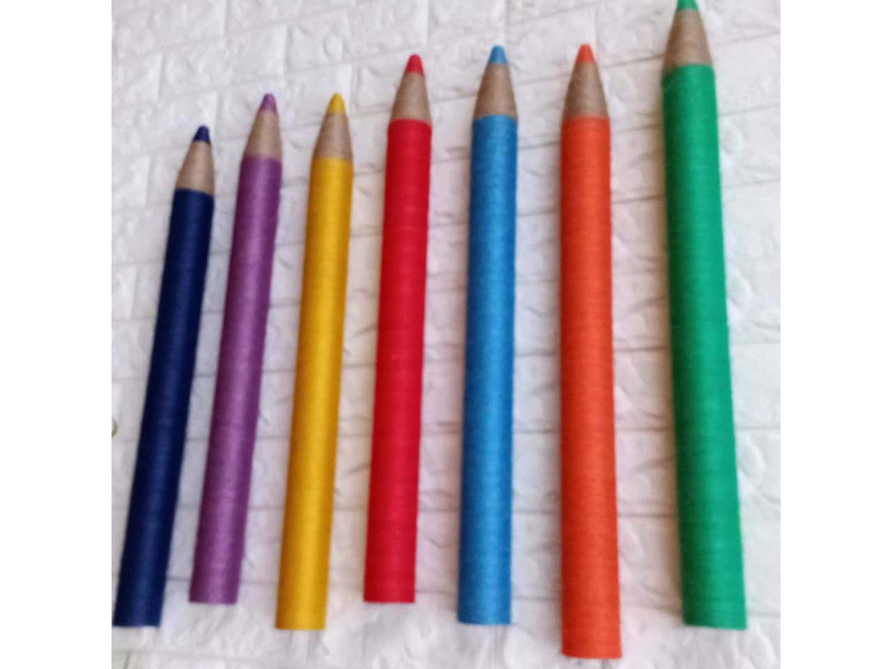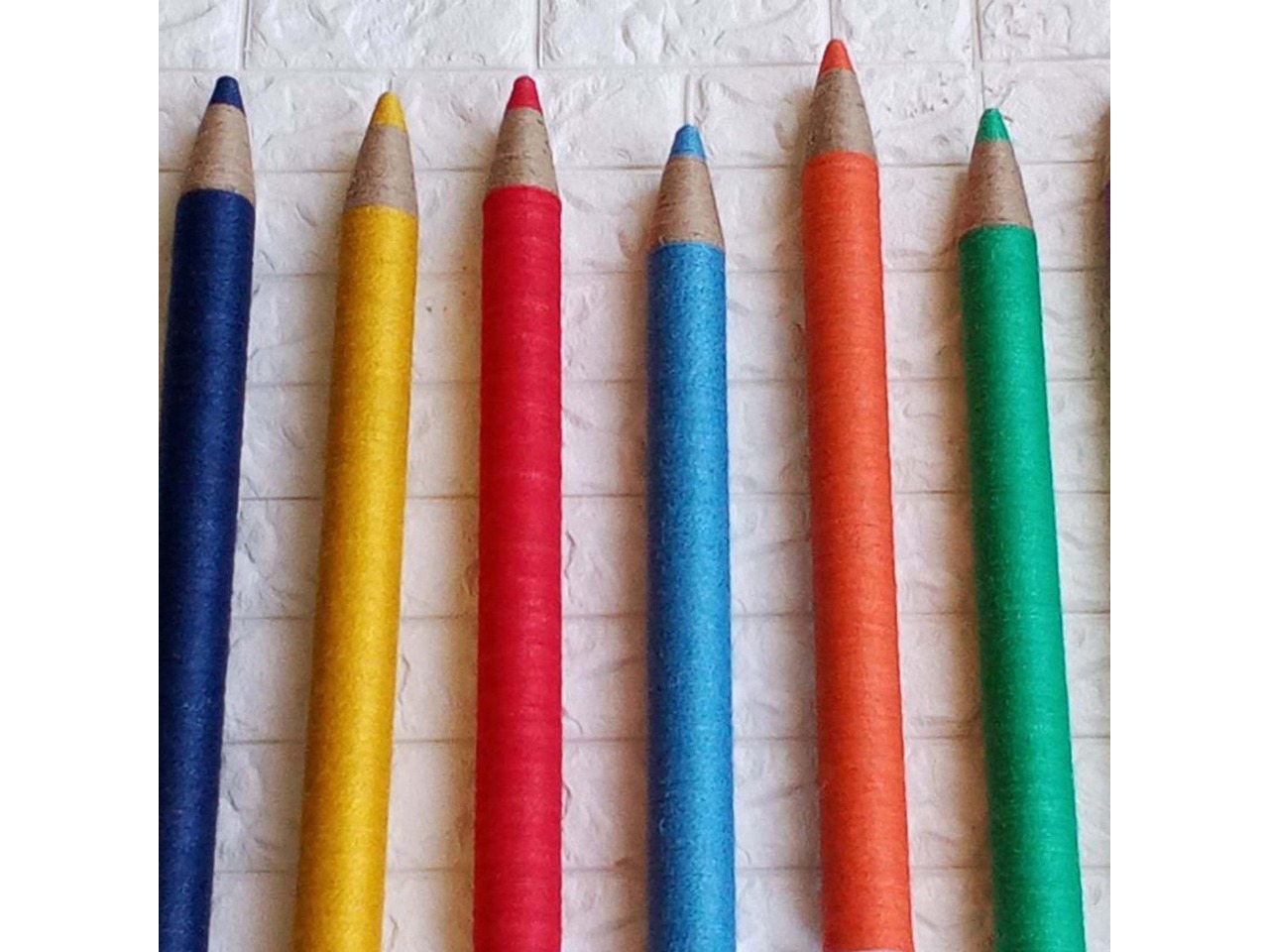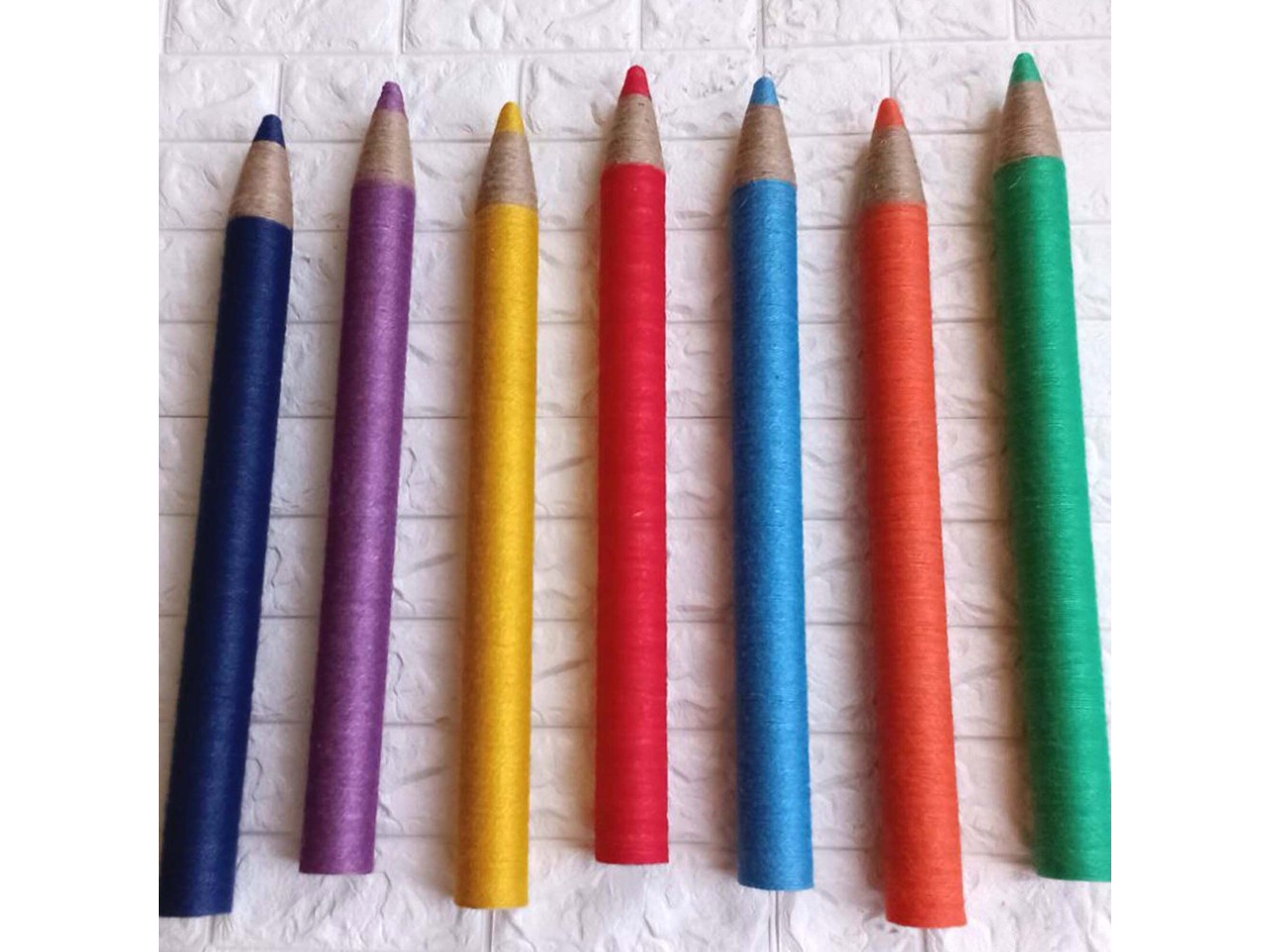 Цілком незвичайний настінний декор для класної кімнати або ігрової дитячої кімнати.Основою олівця є картон та пінопласт. Кожен олівець обтягнутий кольоровим шпагатом. А ефект дерева створений за допомогою джутового шпагату природного, світло-коричневого кольору.
