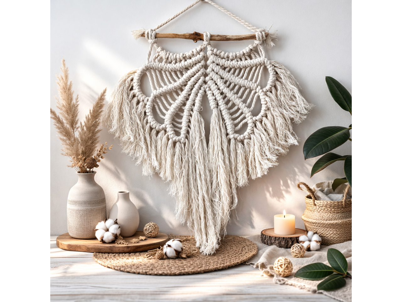 Панно макраме «Крила» ручної роботиНіжний декор у бохо / скандинавському стилі. Виконано з натурального бавовняного шнура на дерев’яній основі. Додає простору тепла, затишку та особливої атмосфери.