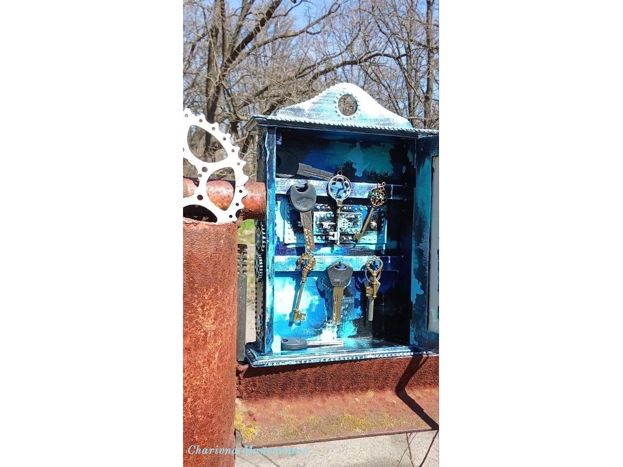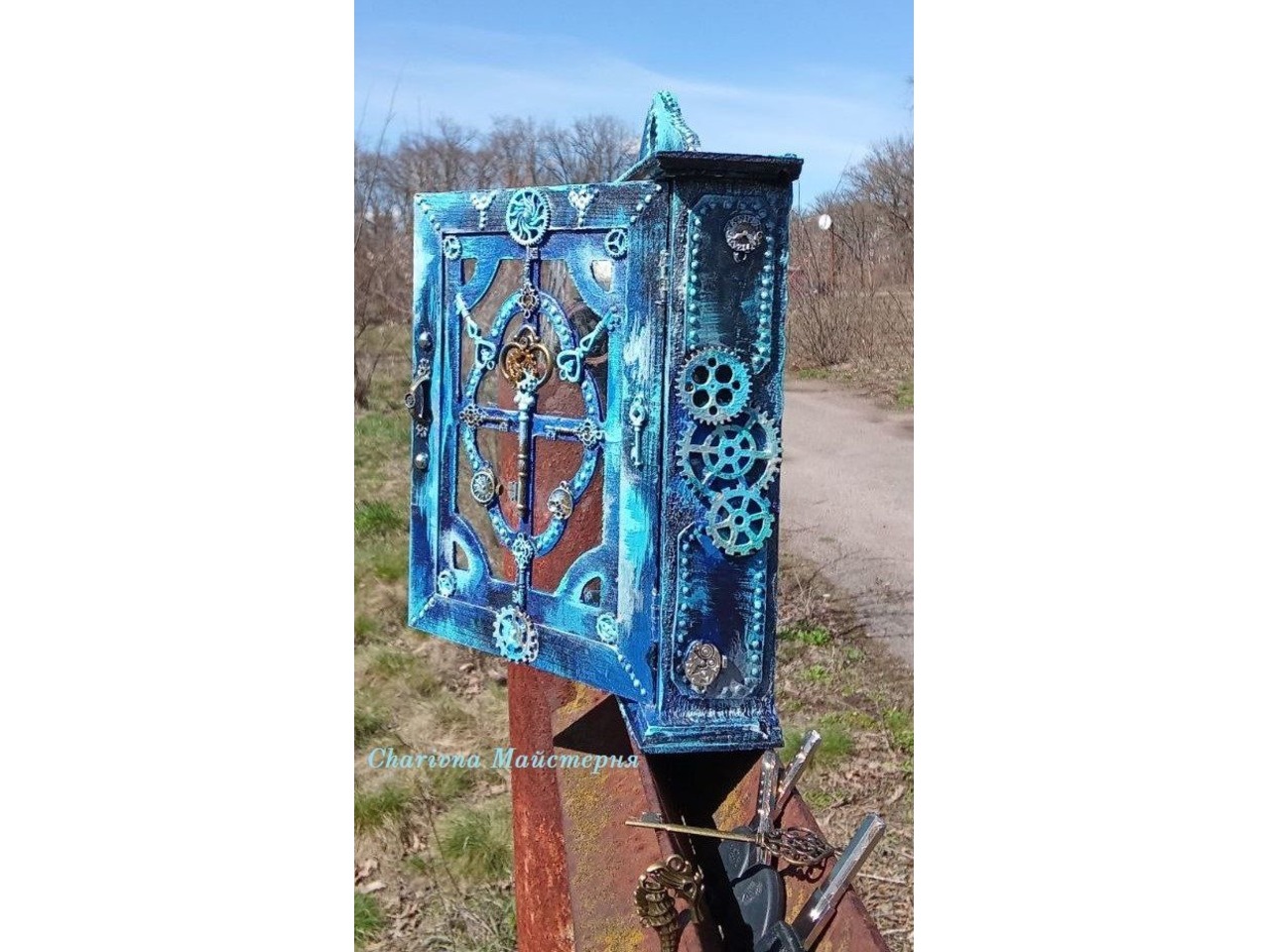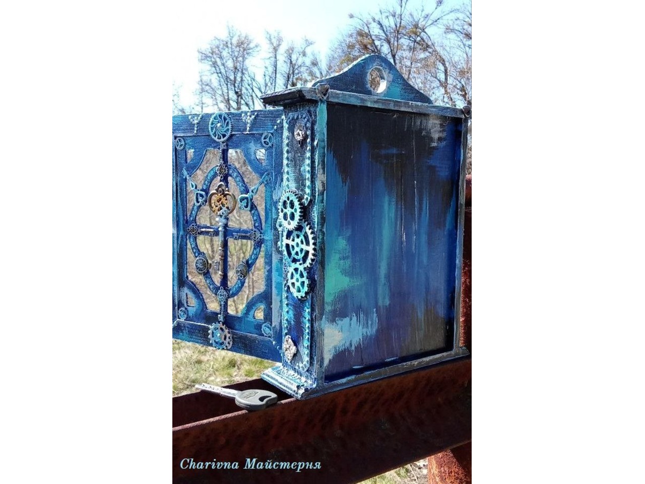Ключниця– яскравий та креативний подарунок навіть для тих, у кого все є і здивувати начебто немає чим.Неординарний інтер’єрний предмет, в якому дерево і скло художньо поєднуються з акрилом, декоративними ключиками та шестернями, захисною руною Альгіз - завжди актуальний!