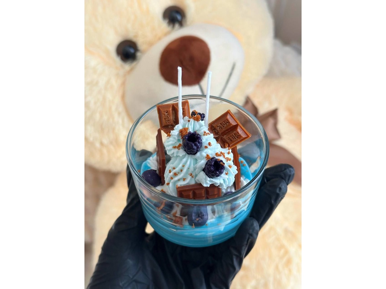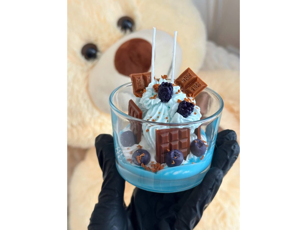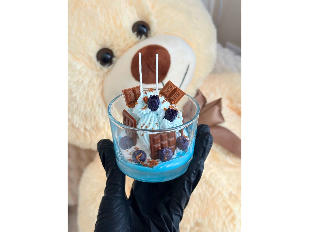 Ніжний блакитний відтінок у поєднанні з шоколадним декором робить її неймовірним елементом інтер'єру. Подвійний гніт: Забезпечує рівномірне горіння та ще більше світла й аромату. Апетитні шоколадки, свіжа чорниця та повітряний крем — усе це зроблено з соєвого воску вручну. Використовується високоякісний соєвий віск, що горить довше за парафін і є безпечним для здоров'я. Аромат соковитих лісових ягід та солодкого молочного шоколаду заповнить усю кімнату. Подаруйте собі солодку мить релаксу!