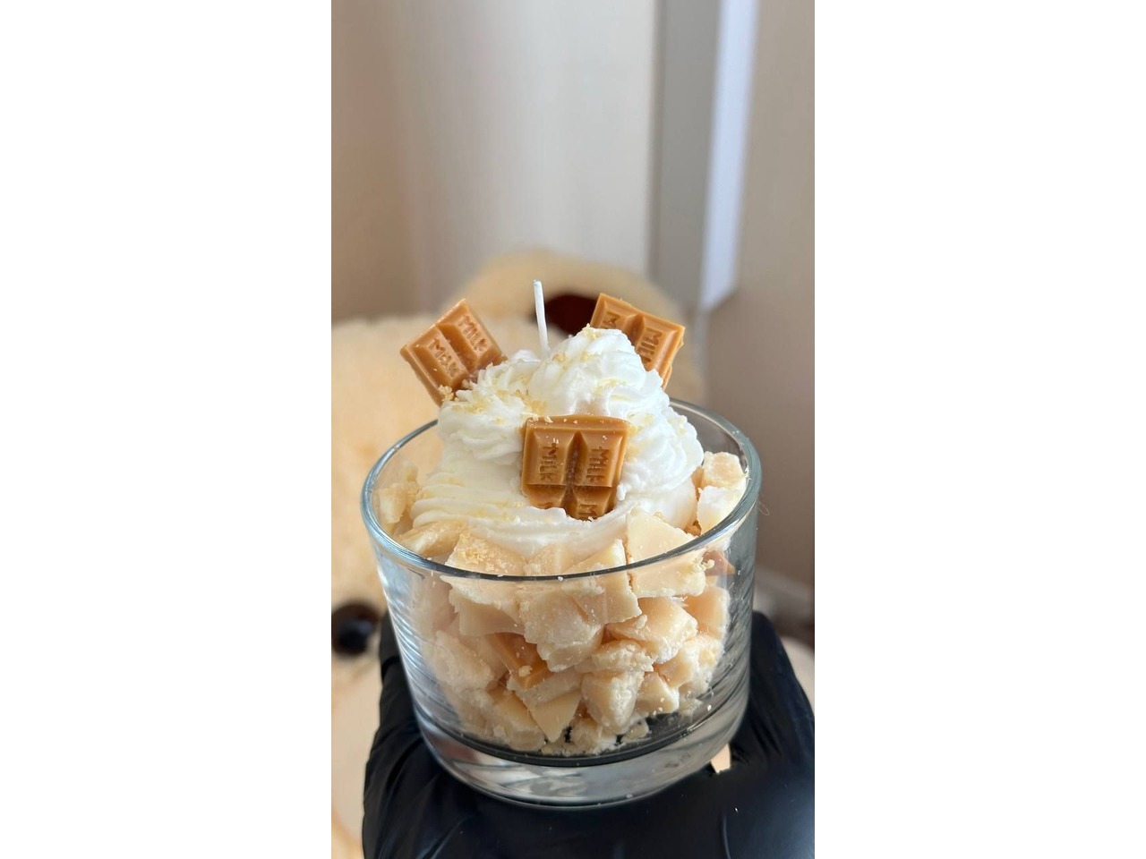 Ця свічка створена щоб дивувати! Виглядає , як вишуканий десерт - ніжні взбиті вершки, шматочки молочного шоколаду та золотиста карамель.Аромат - теплий мікс топленого молока , солодкої карамелі та какао.
