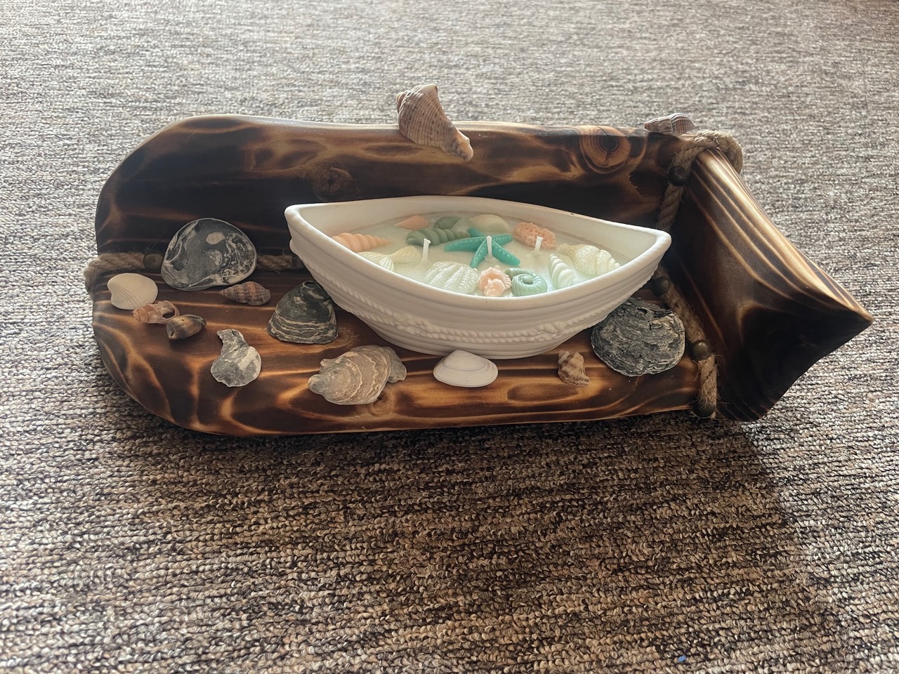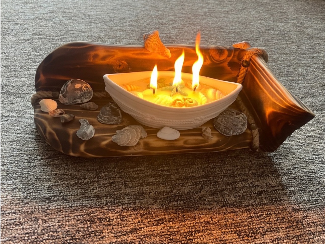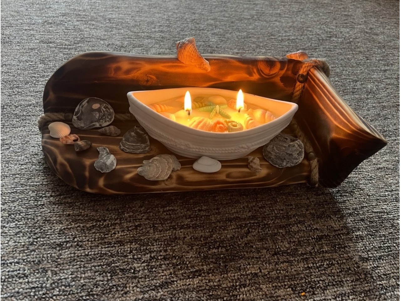 Свічка стоїть на стильній підставці з обпаленого дерева (шугунинг) з канатом, що ідеально доповнює морську тематику. Навколо розкидані натуральні мушлі та камінці для створення повної пляжної композиції.