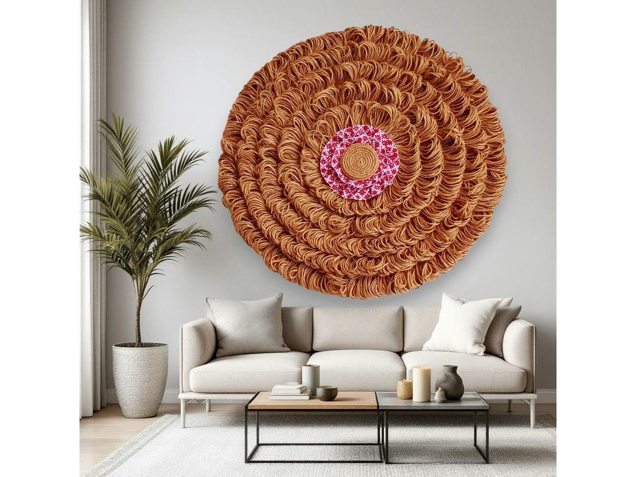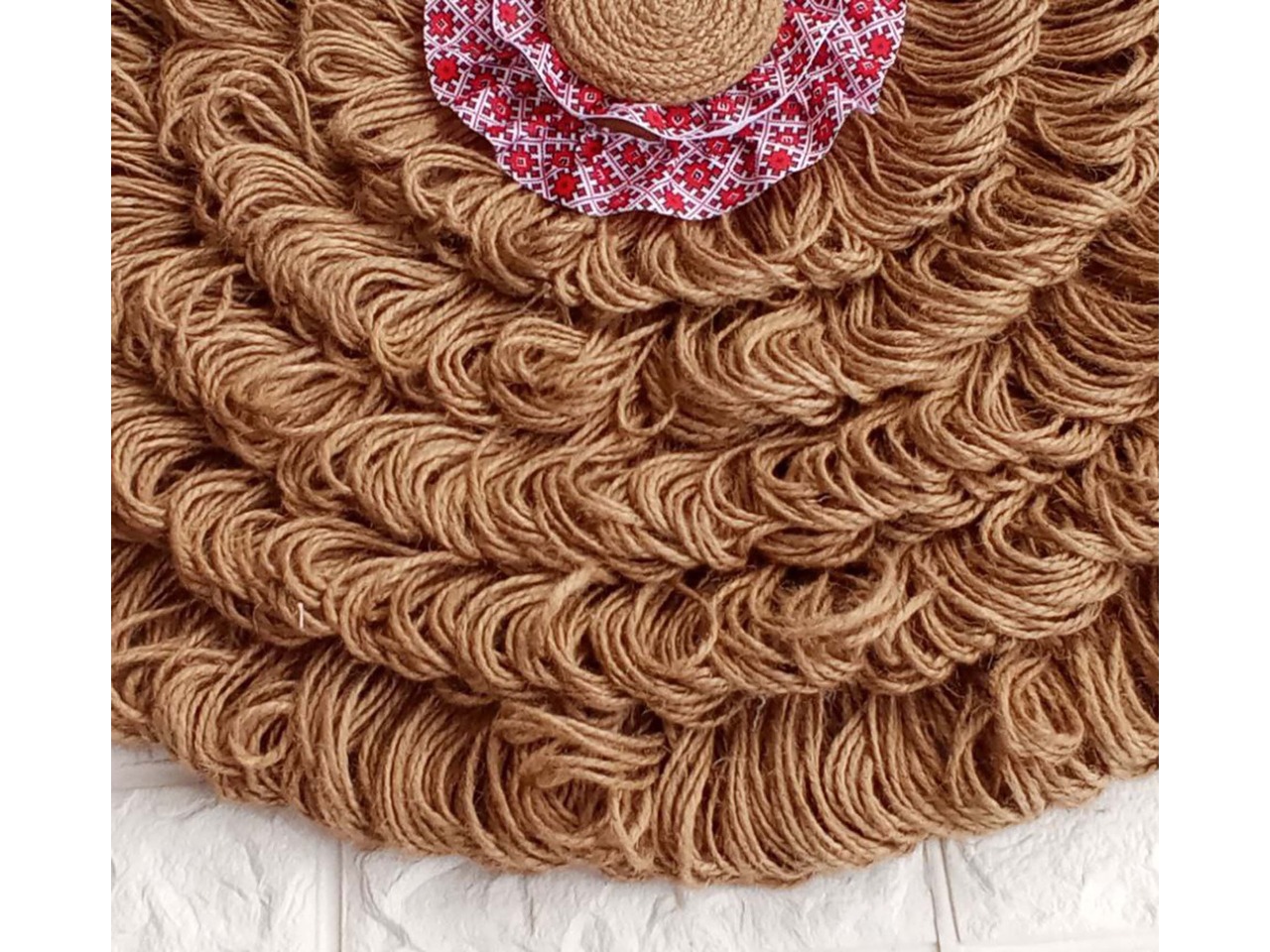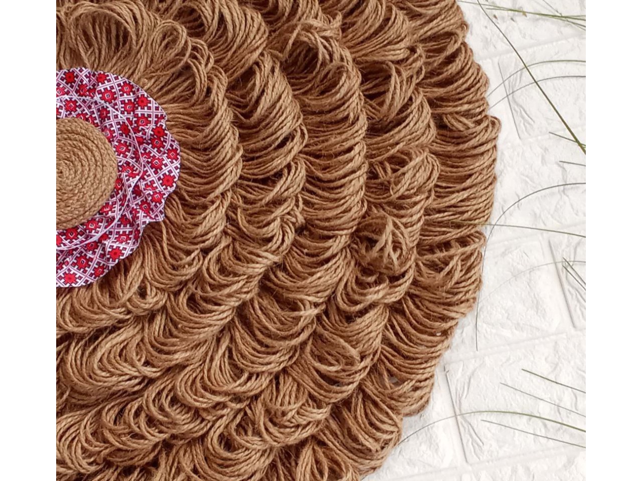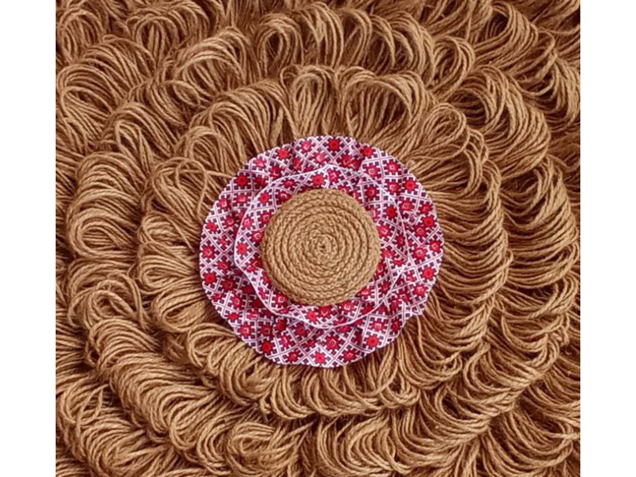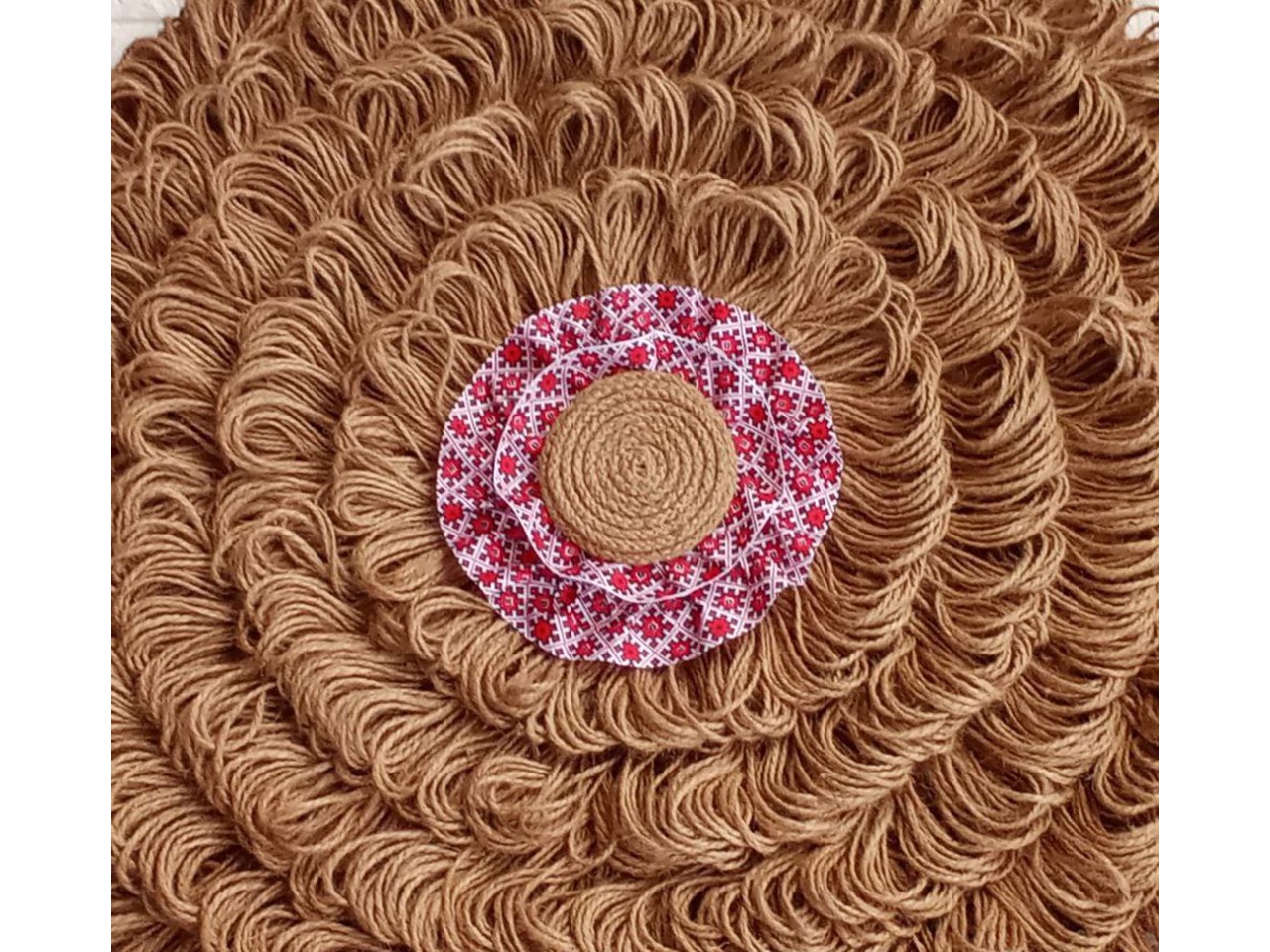 Панно на стіну в українському стиліЕлегантний декор, виконаний вручну з натурального джутового шпагату. У центрі композиції — репсова стрічка з автентичним етнічним орнаментом, що додає виробу національного колориту та особливого шарму. Панно стане яскравим акцентом у будь-якому інтер’єрі, підкреслить любов до українських традицій та створить атмосферу затишку.