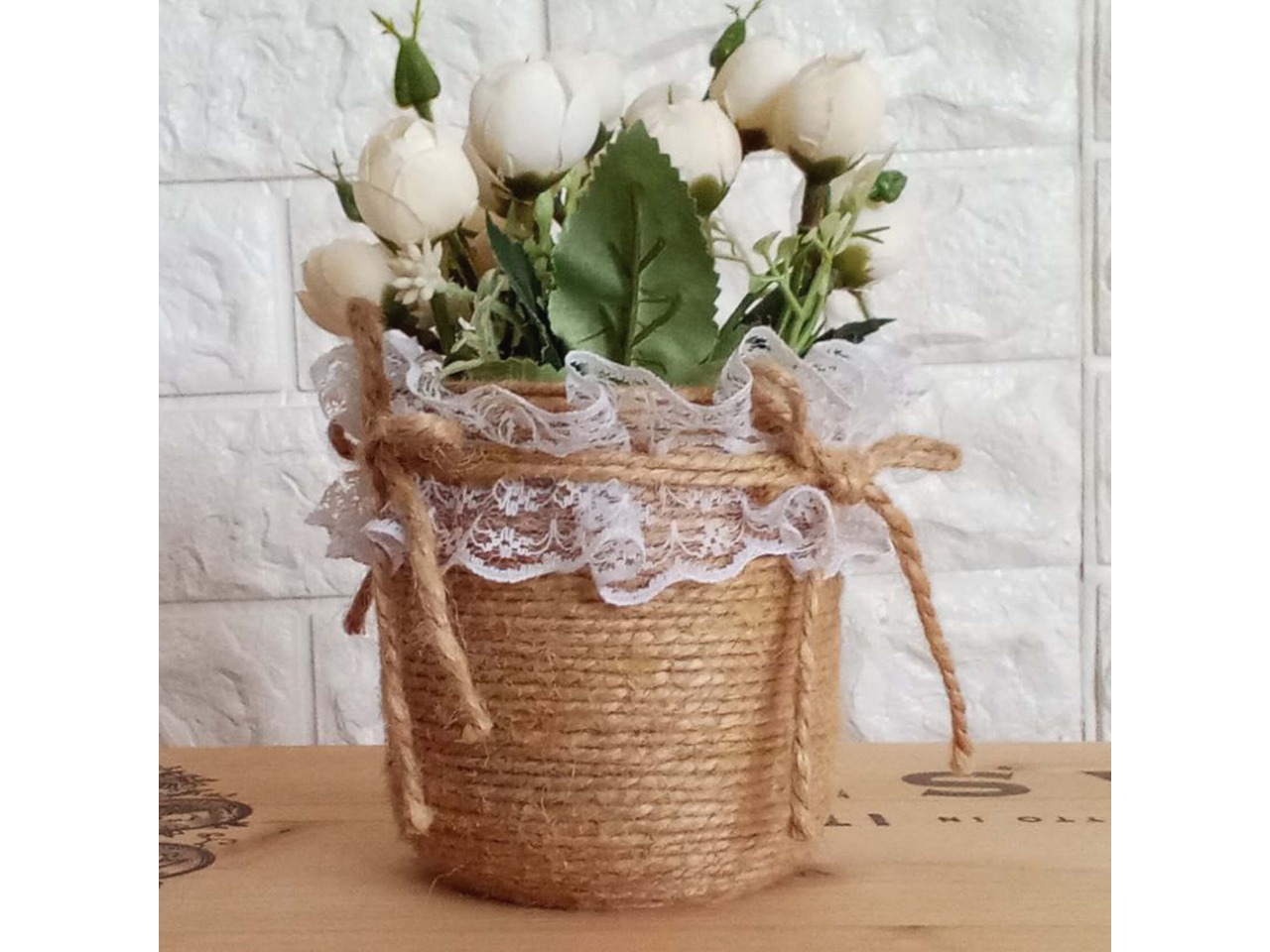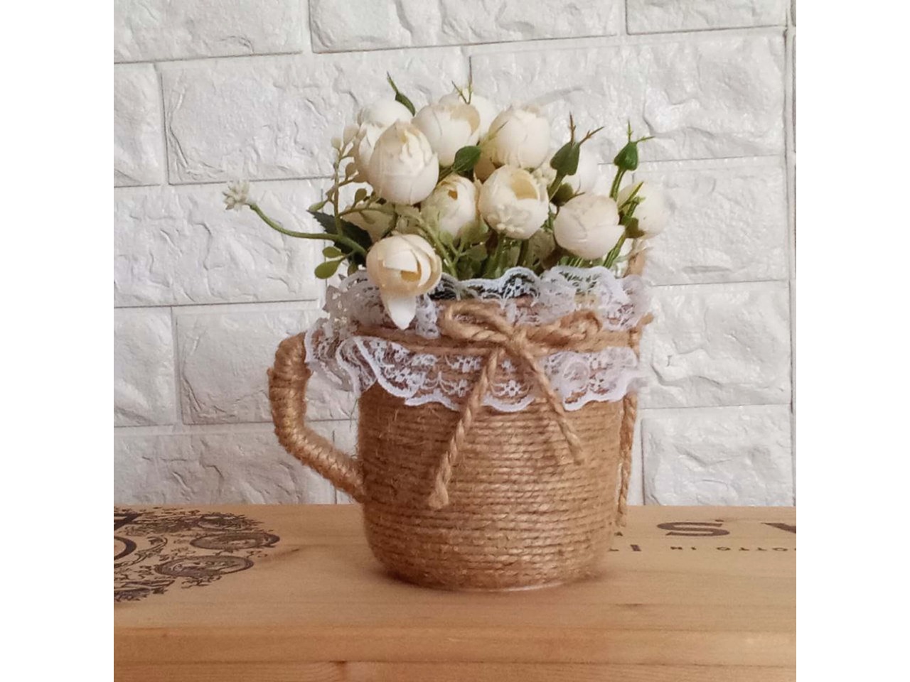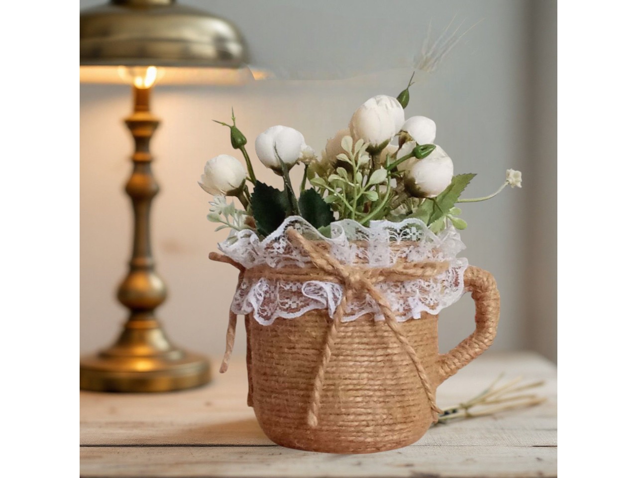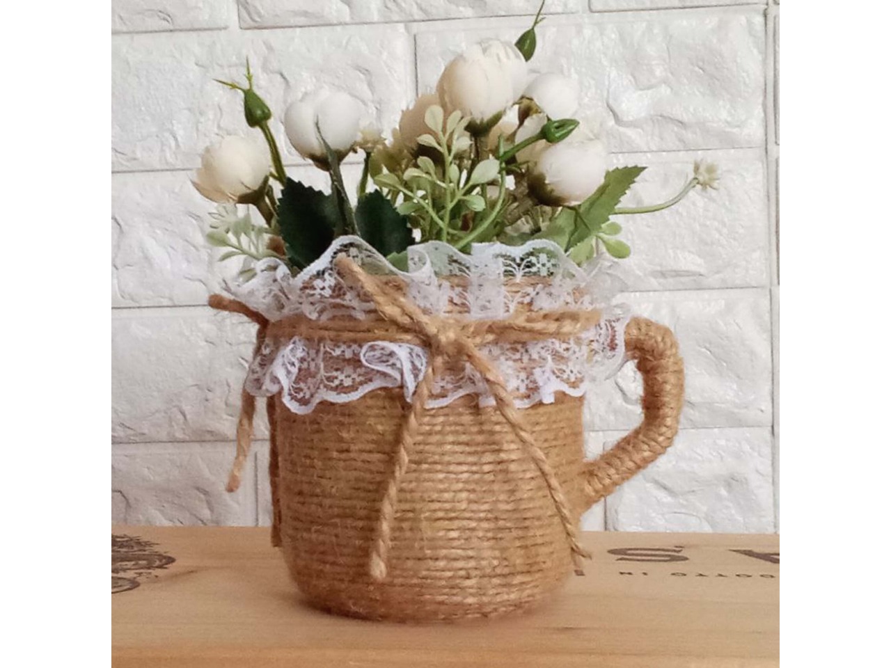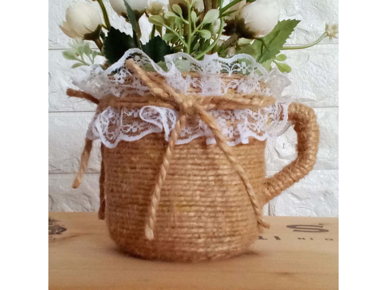 Оригінальна вазочка-чашечка для квітів ручної роботи, створена спеціально для весільного декору в стилі рустик. Чудово пасує для оформлення святкового столу, а також стане затишним акцентом у спальні, кухні чи їдальні.Основа вазочки – пластмасова чашка, декорована джутовим шпагатом та ніжним мереживом.